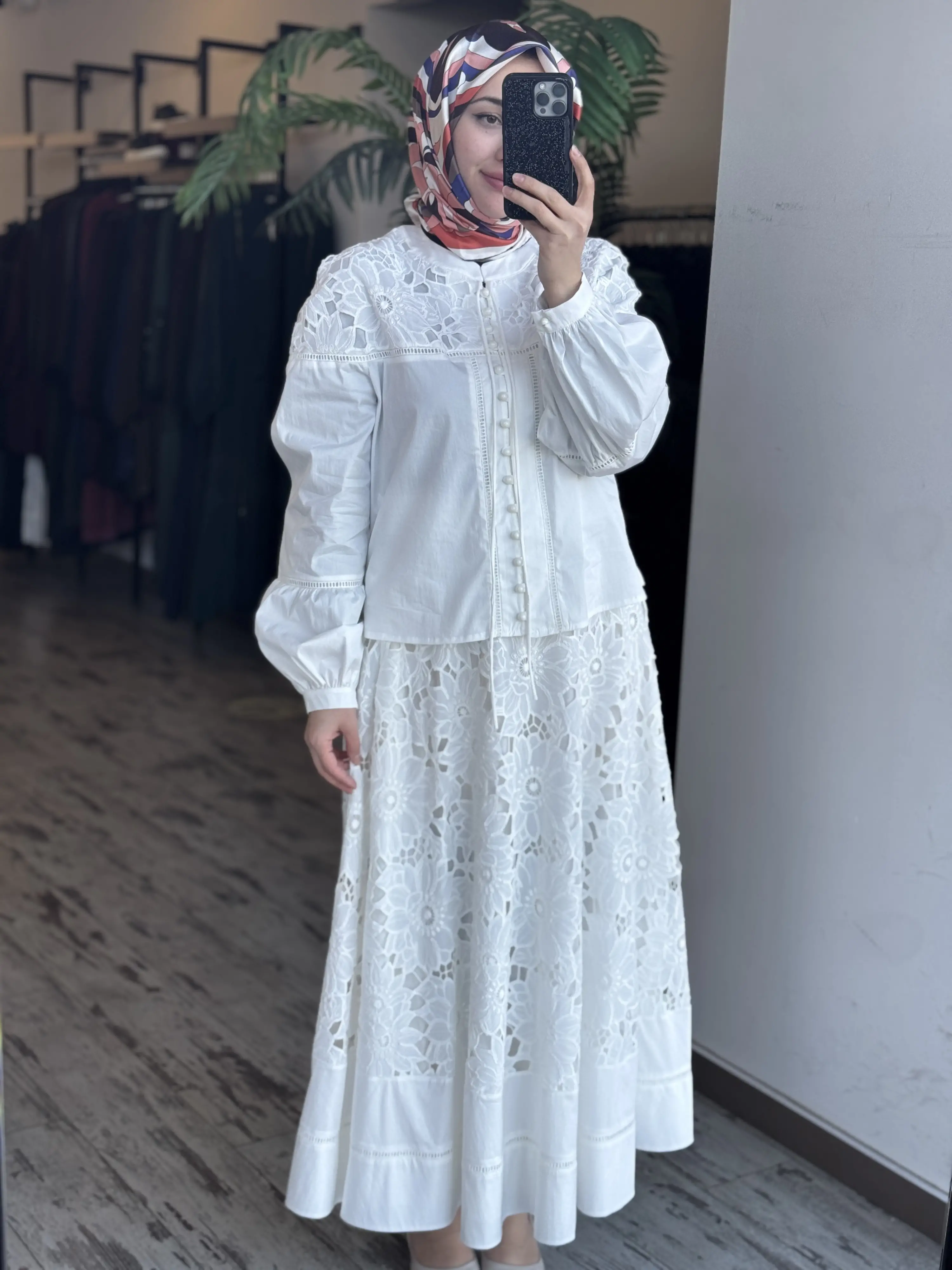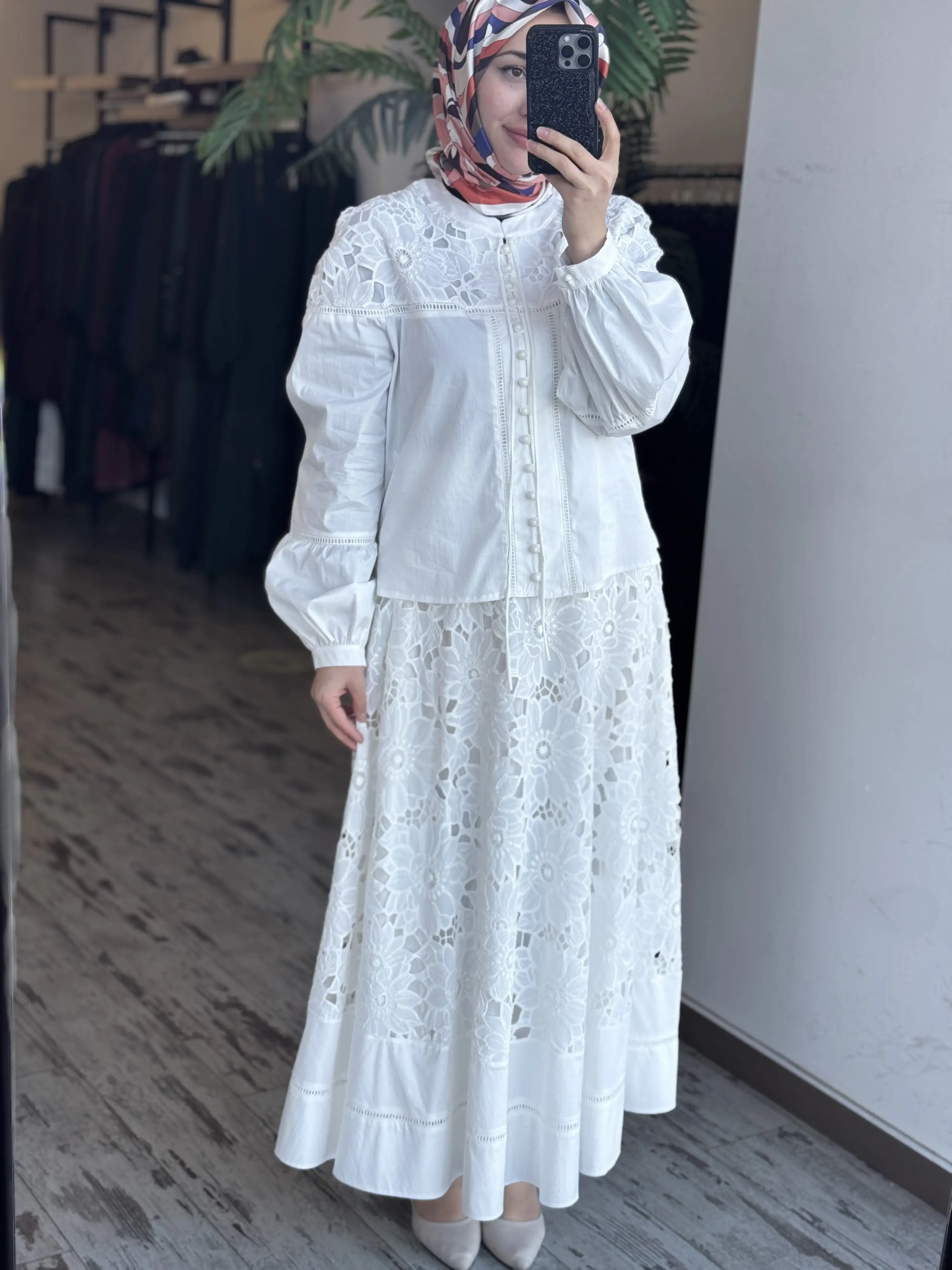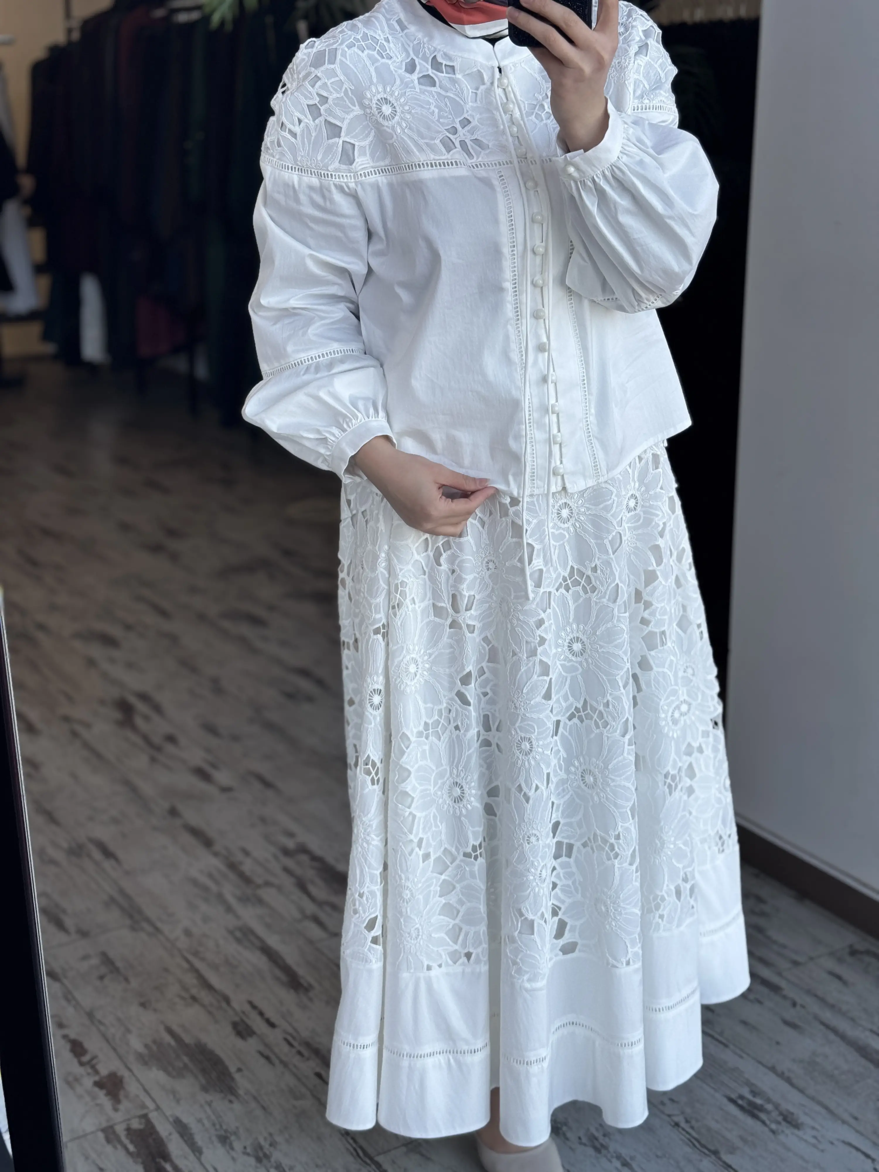 Clande Britli Güpür Detaylı Gömlek Etek Takım