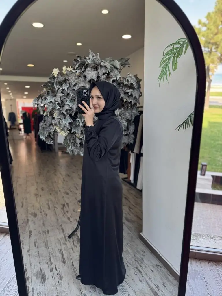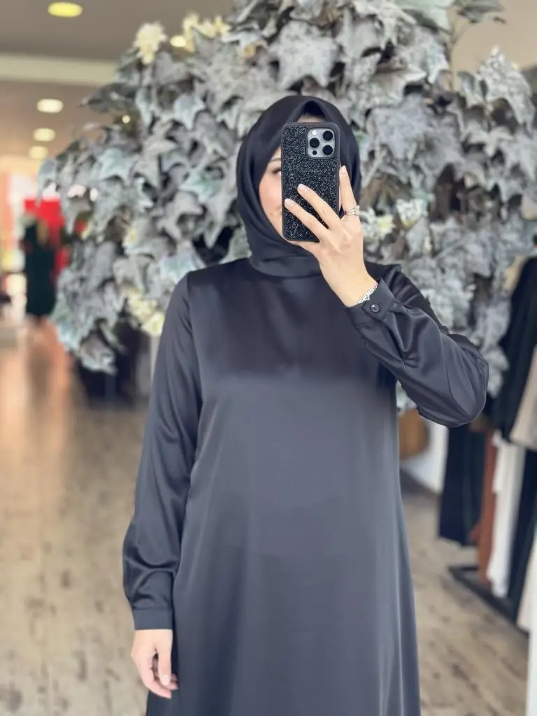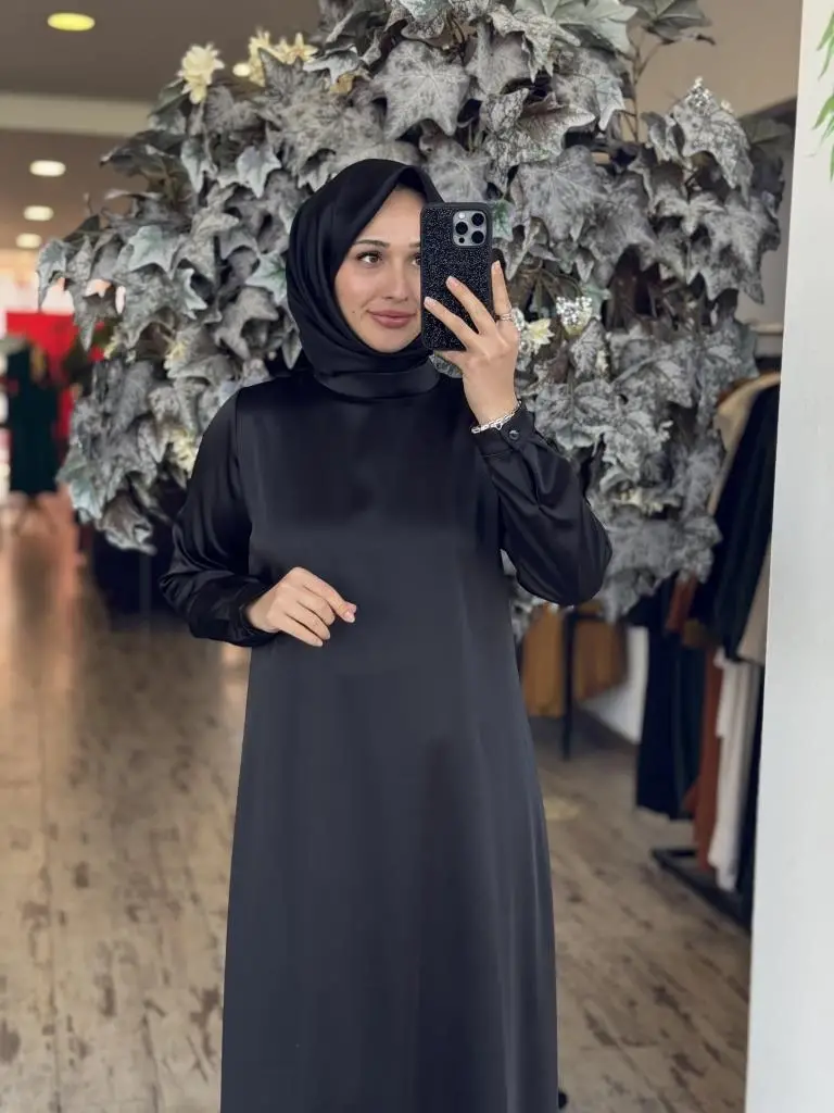 Almarwah İpek Saten Sade Siyah Elbise 90489