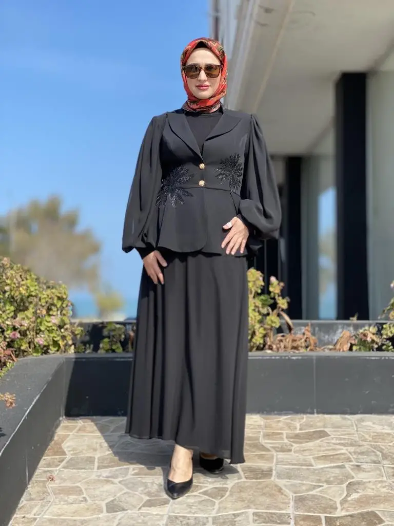 Almarwah Kolları Organze Nakış Detaylı Ceket Etek Şık Takım 90513