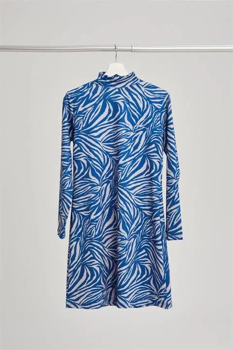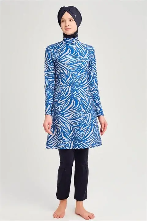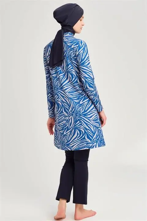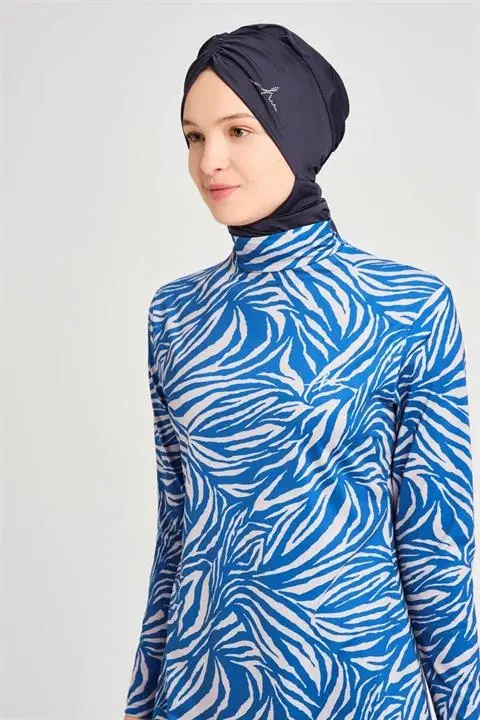 Haşema Belgin Çizgi Desenli Likralı Saks Tam Tesettür Mayo Üstü HSM3060