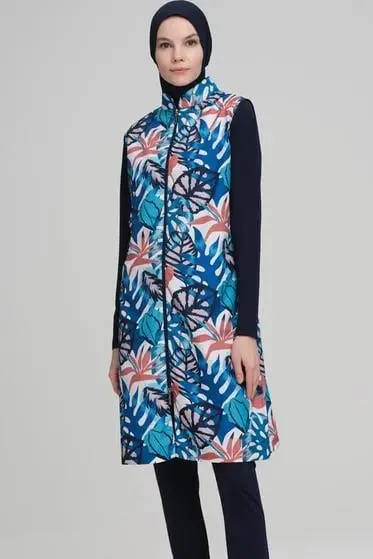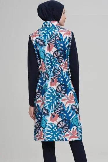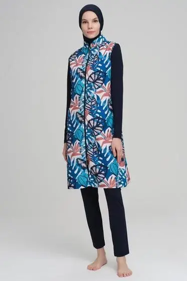 Haşema Renkli Yaprak Desenli Jileli 3 Parça Lacivert Tesettür Mayo Takımı NHR2218