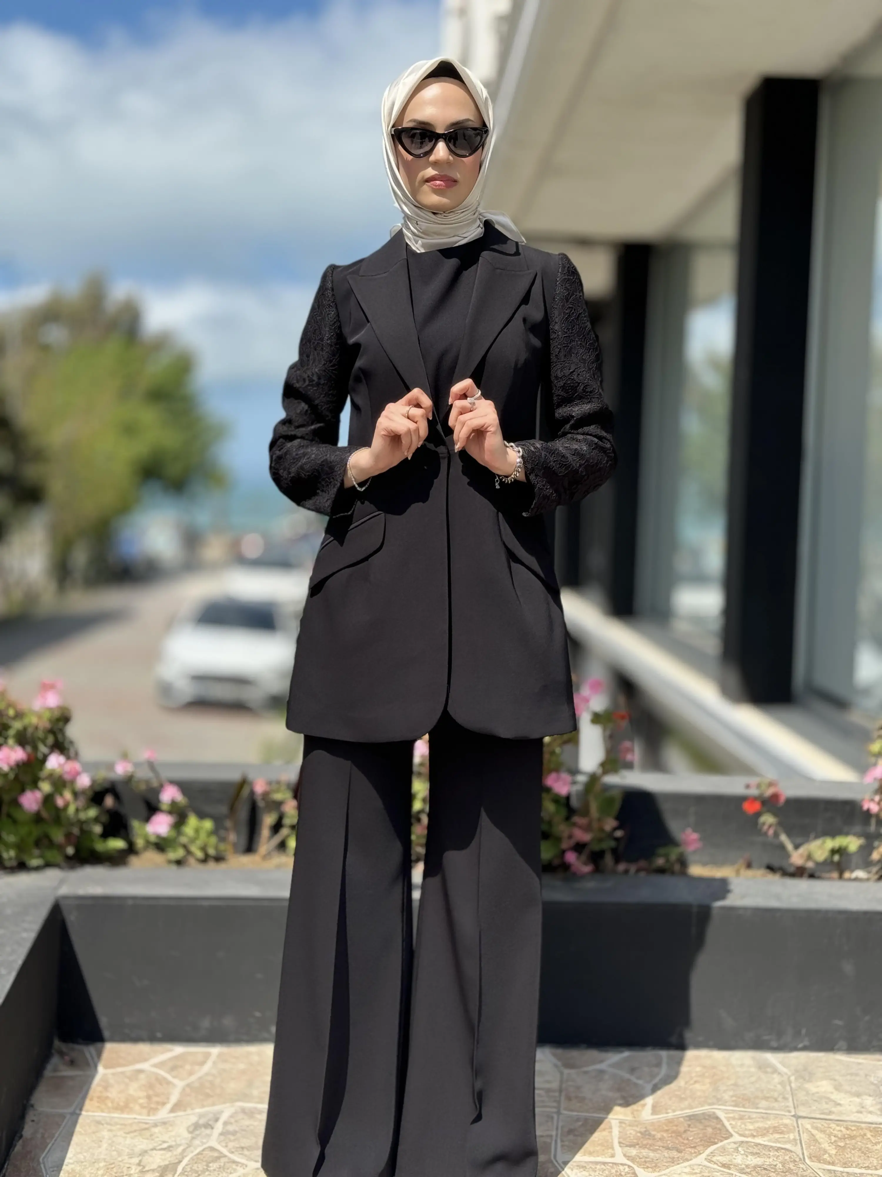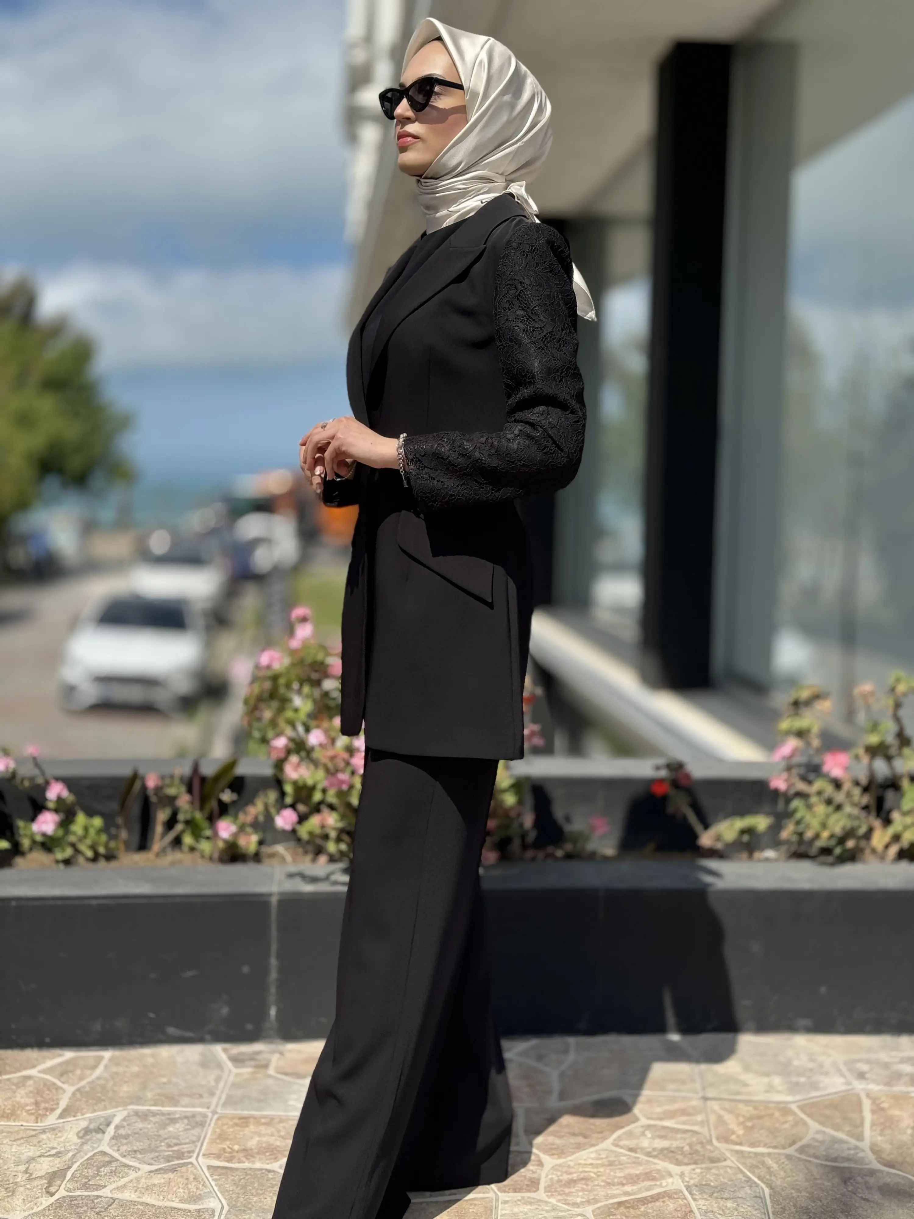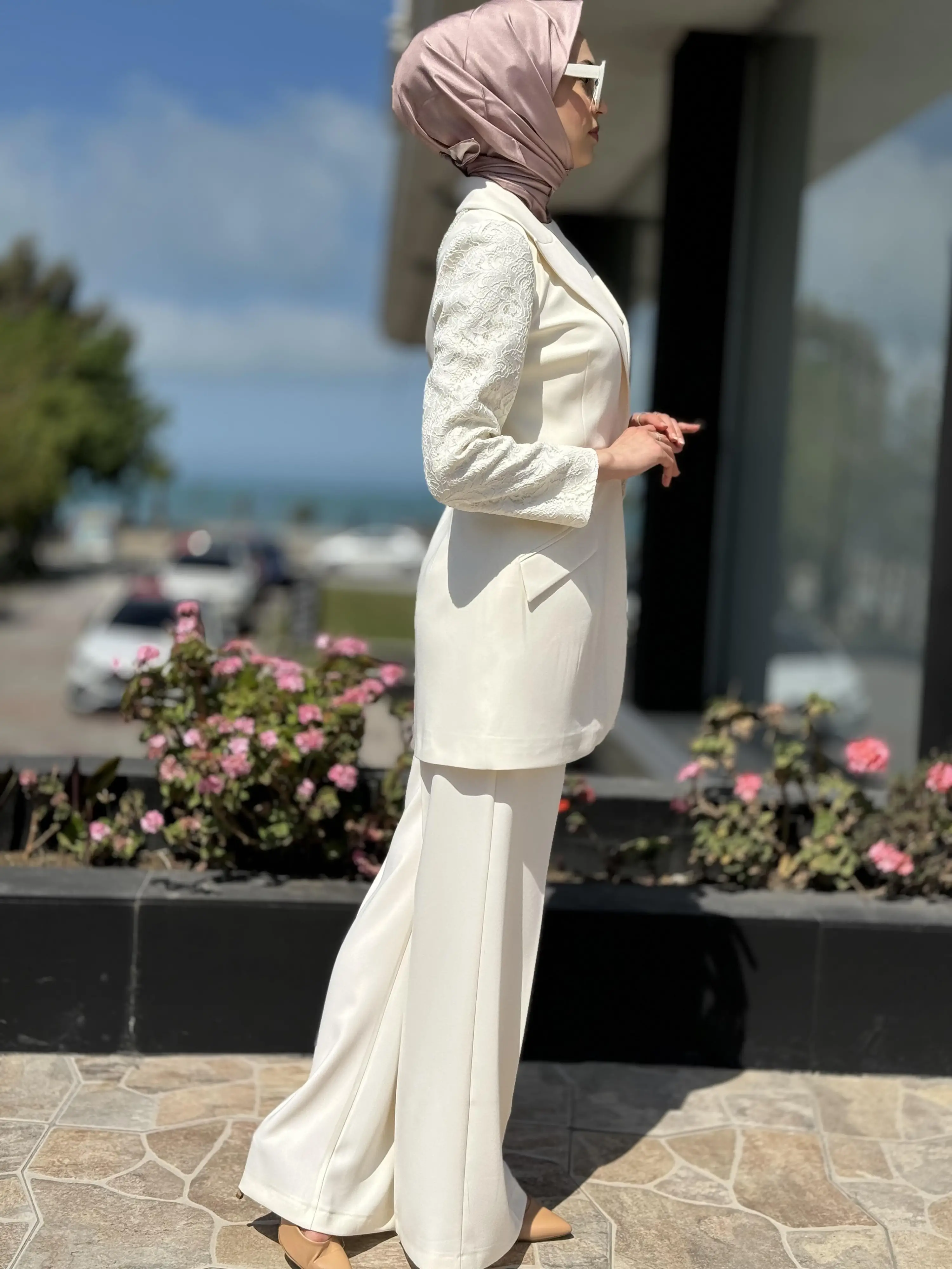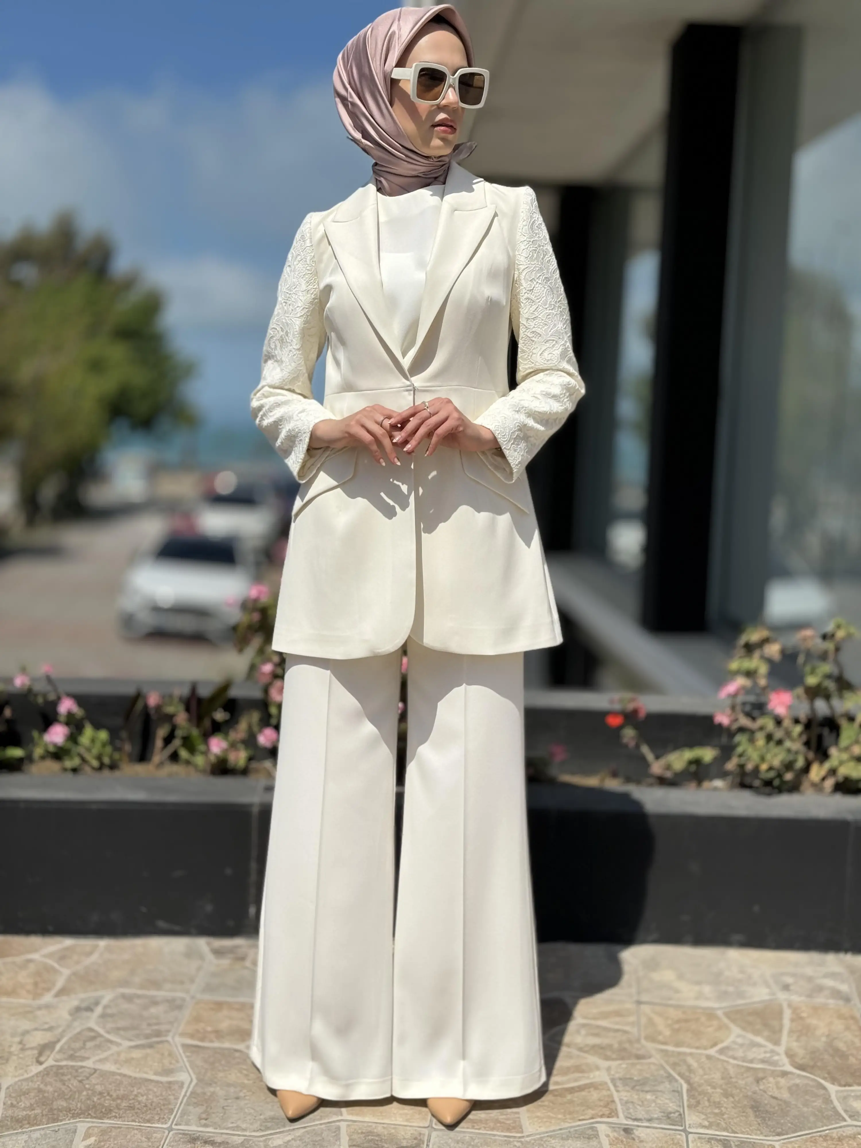 Jamila Sarah Kolları ve Arkası Dantel İşlemeli Ceket Pantolon Takım 9022
