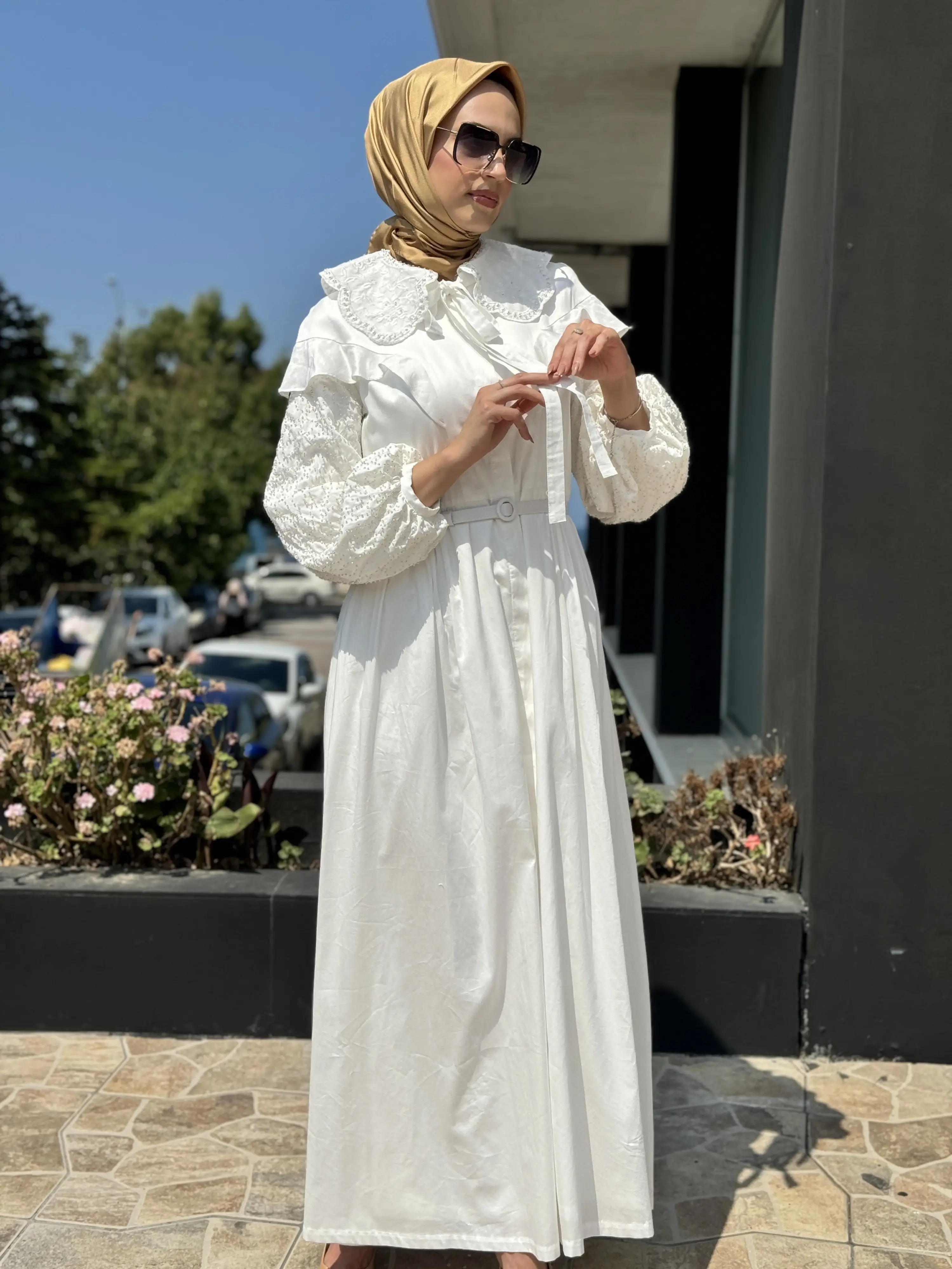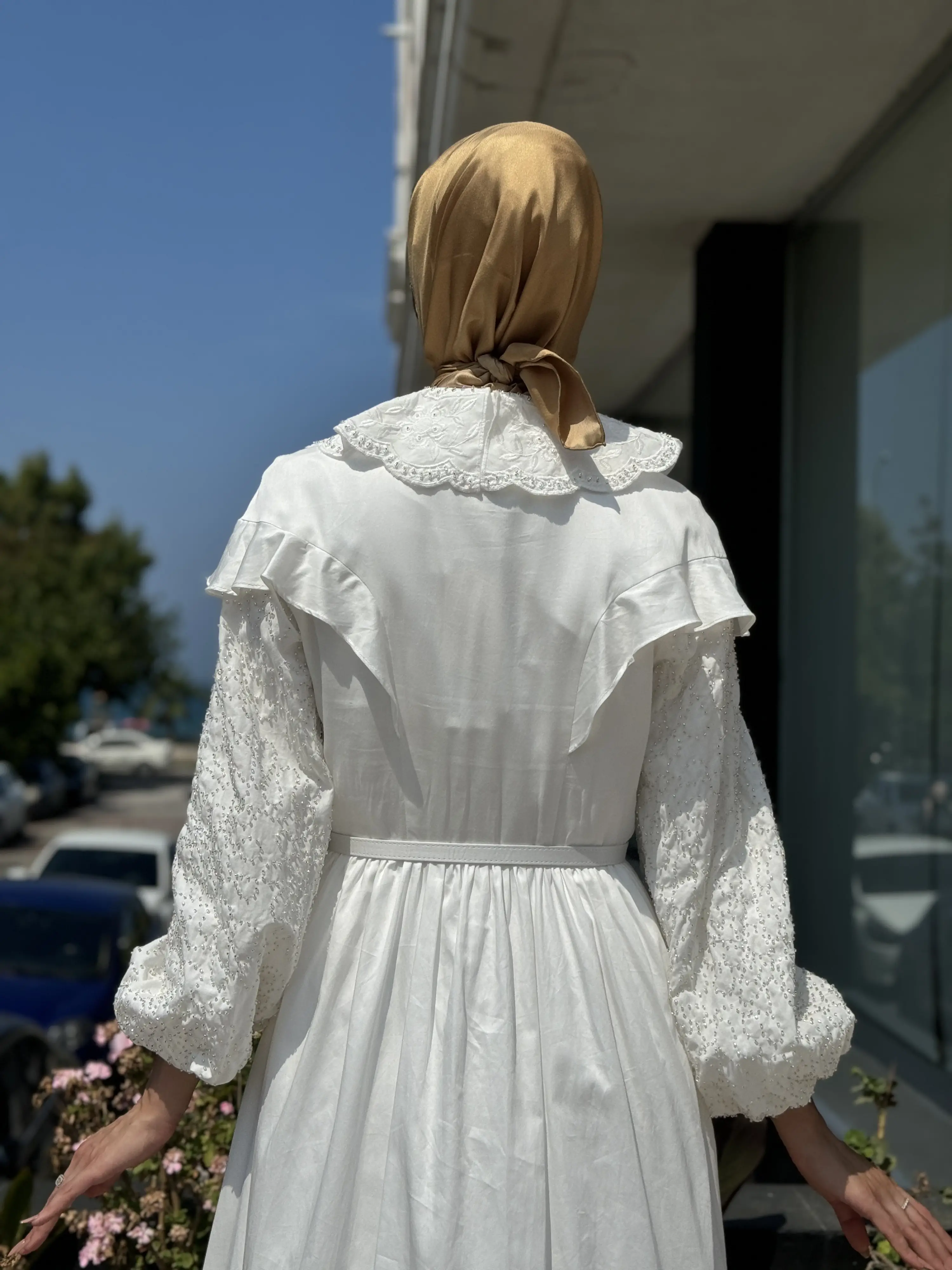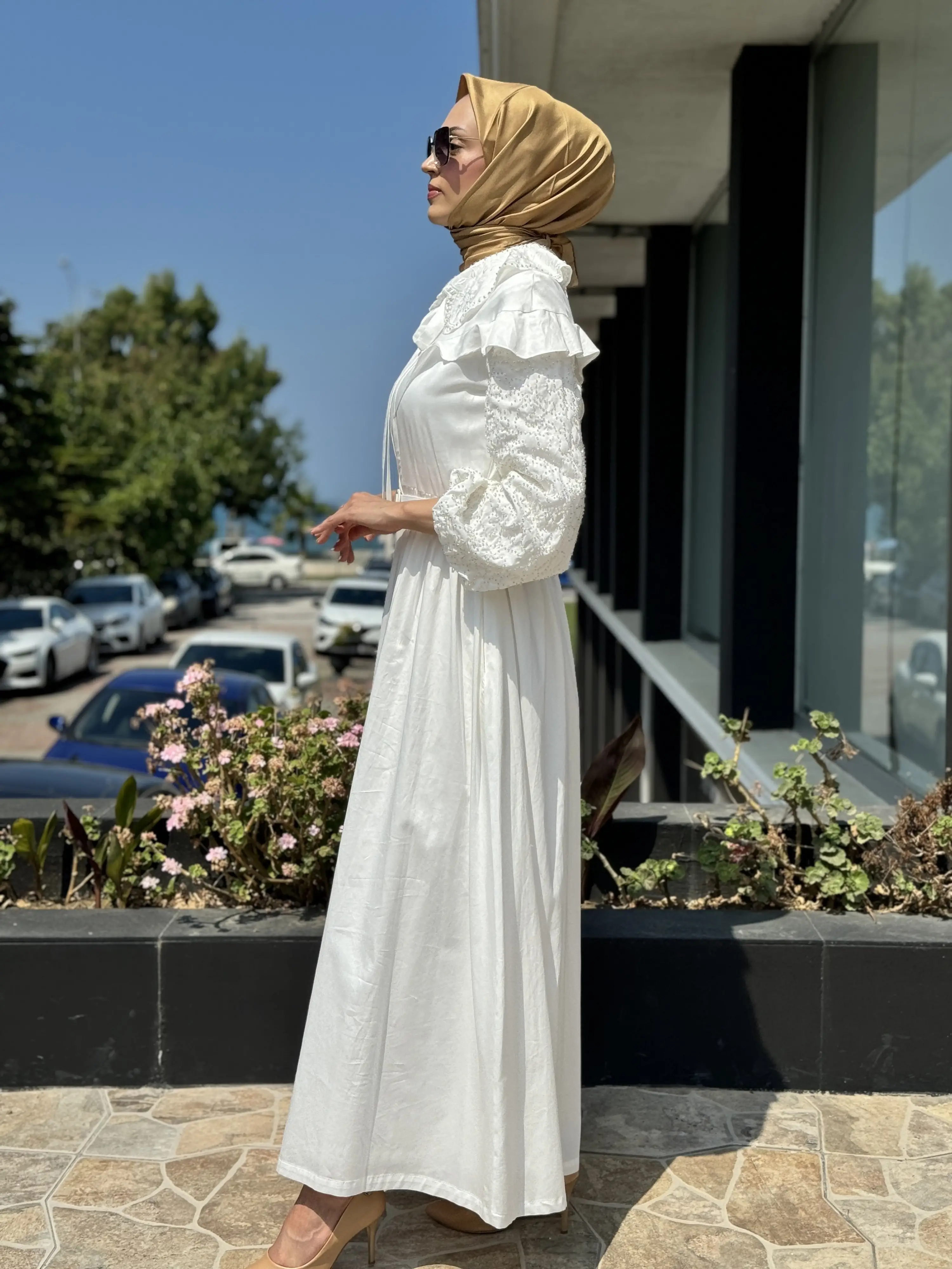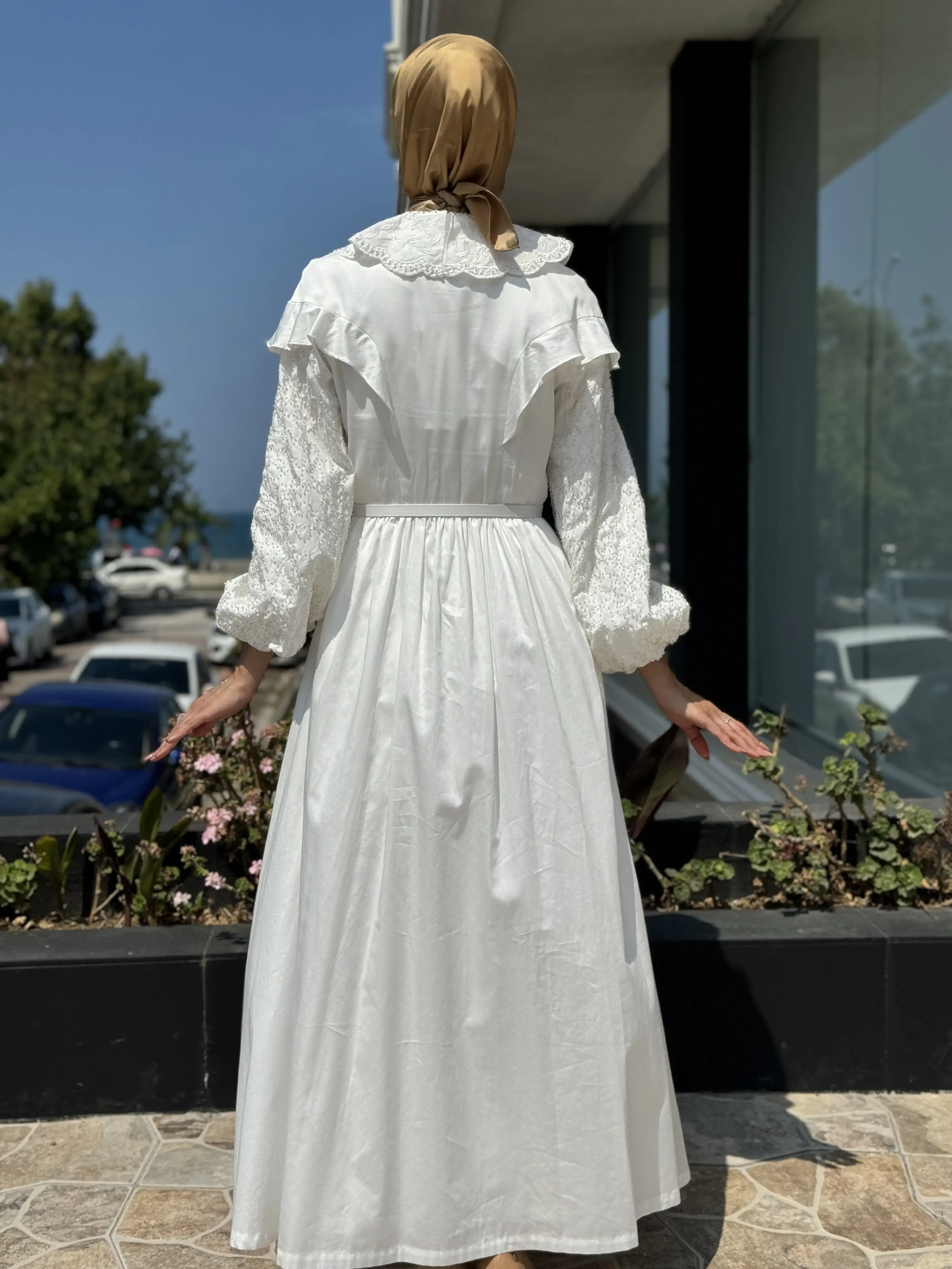 Jamila Sarah Kolları Yakası Boncuklu Fırfırlı Elbise 3052