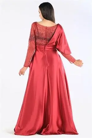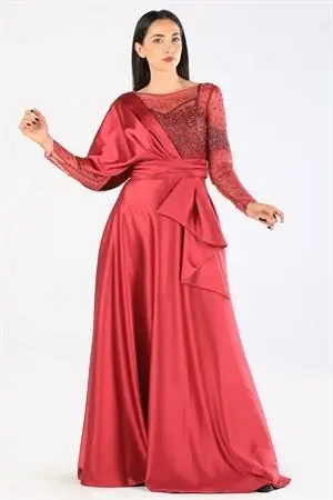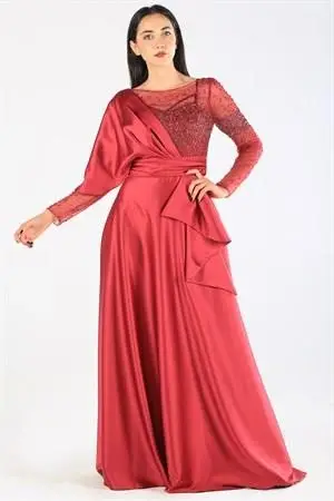Kenzel Taş Detaylı Bordo Saten Tesettür Abiye Elbise (KENZEL-1001)