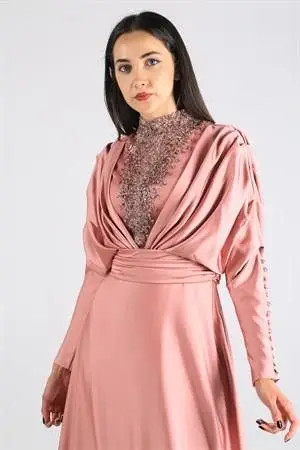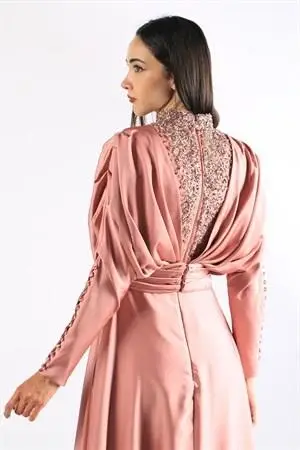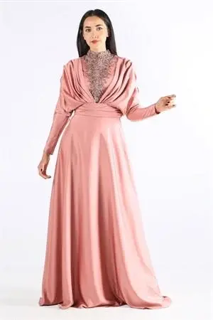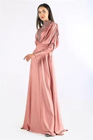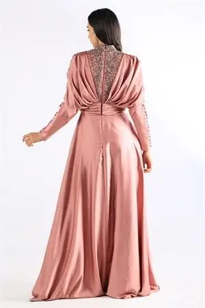 ÖNÜ VE ARKASI ÜST KISMI EL İŞÇİLİĞİ TAŞ DETAYLI KUYRUKLU SATEN ŞIK ABİYE ELBİSE