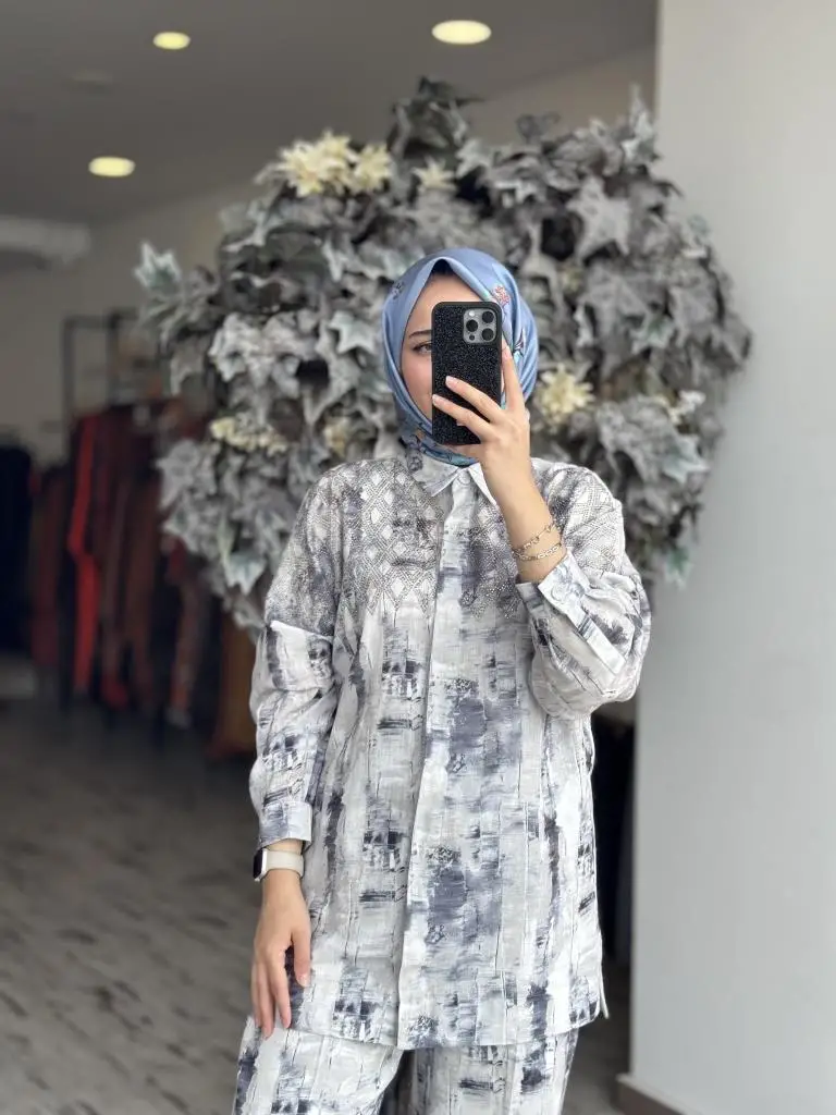 Qupra Taşlı Dijital Desen Gömlek Pantolon Takım WAB82039