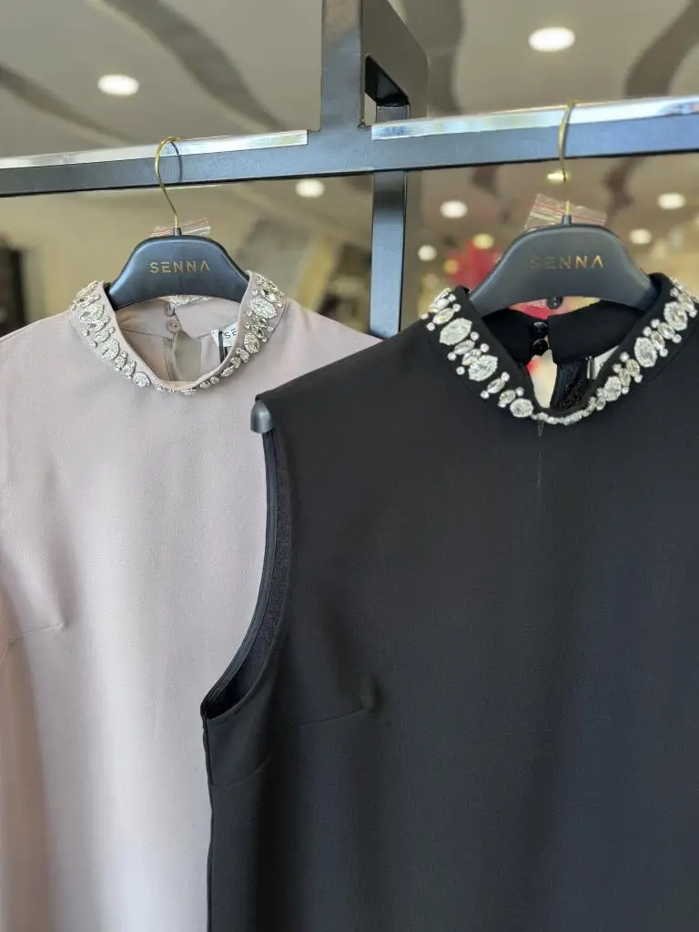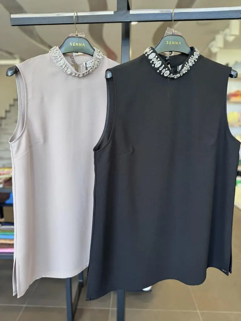 YAKASI TAŞLI KOLSUZ ŞIK BLUZ