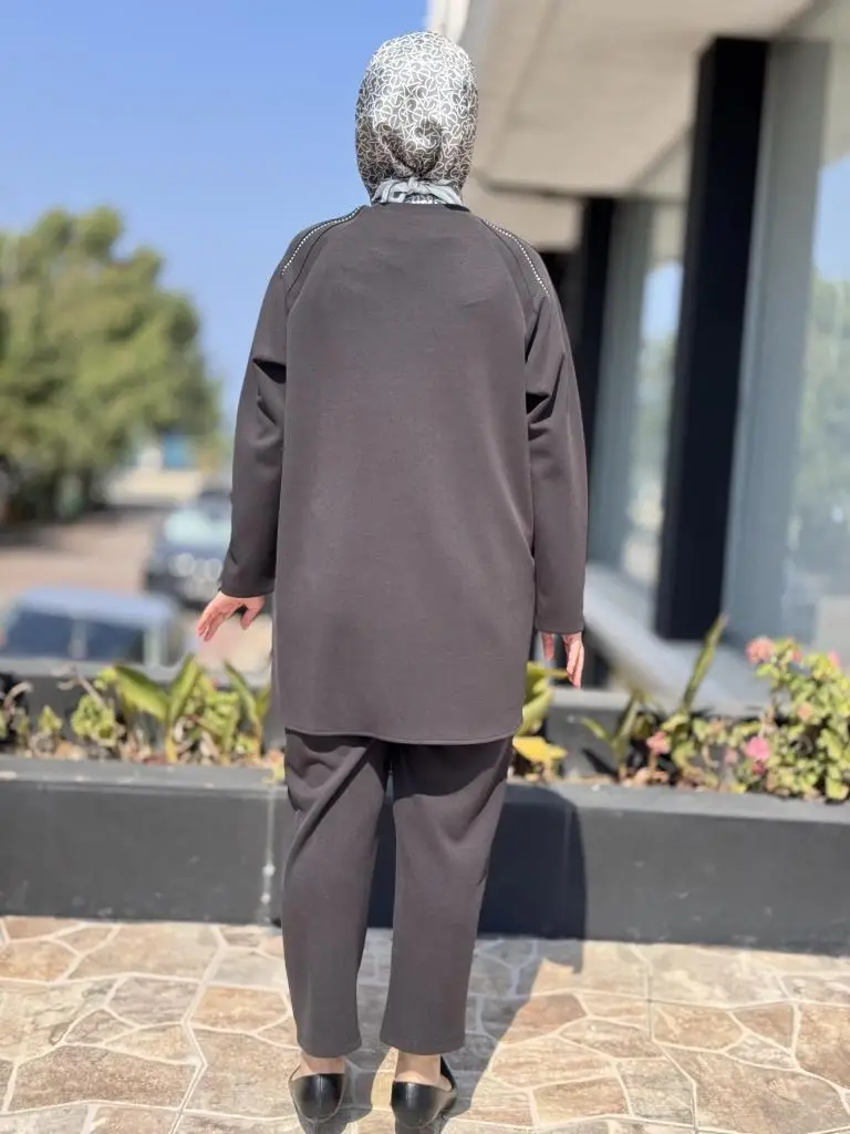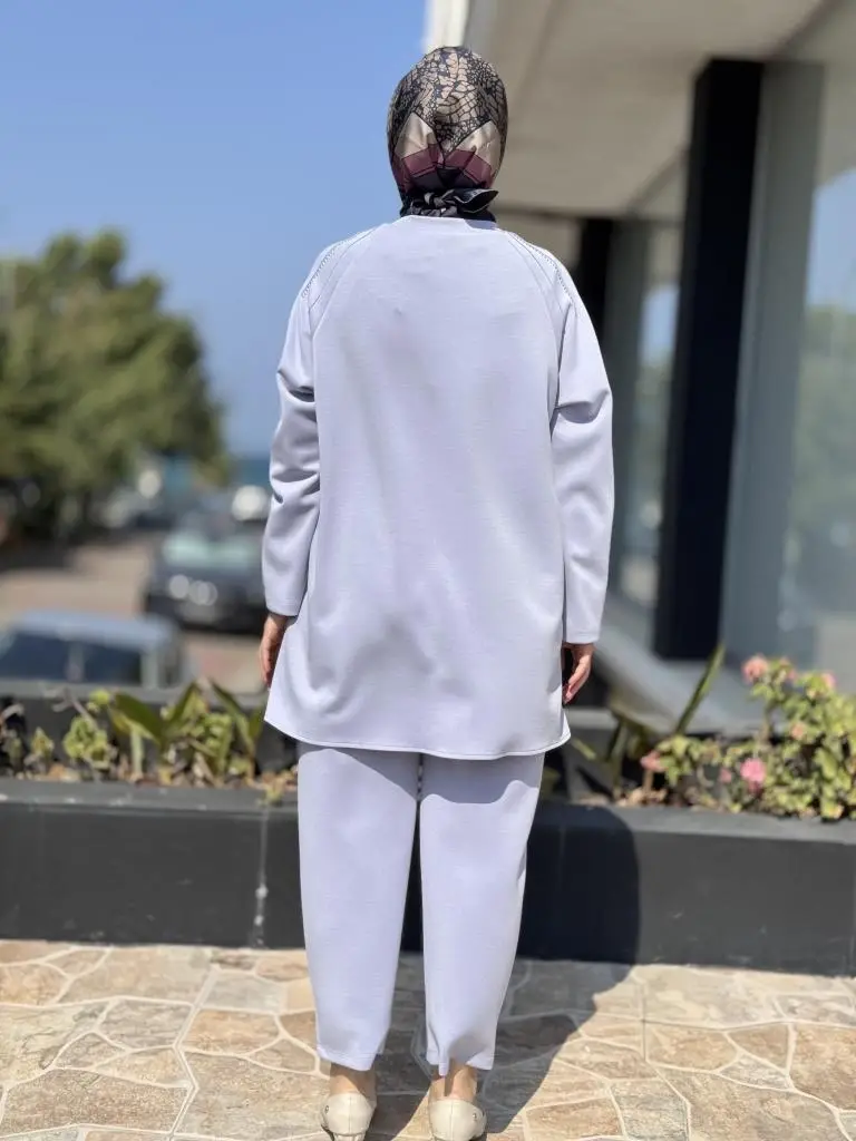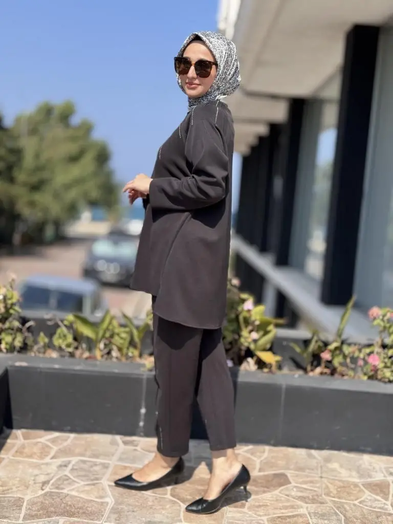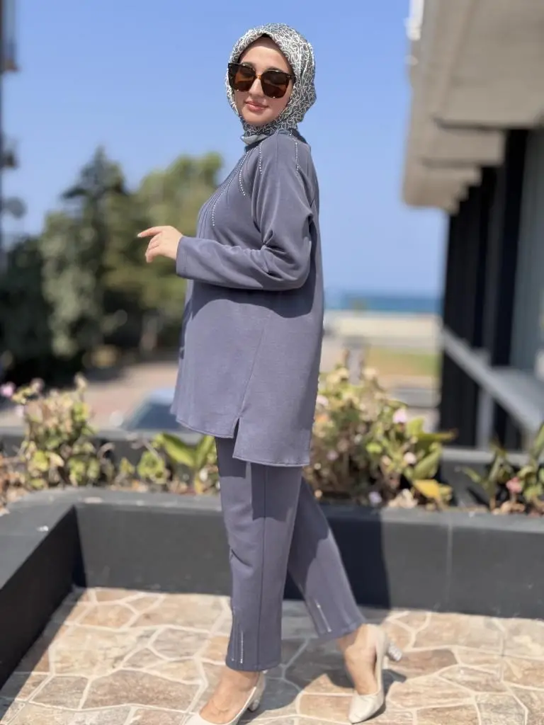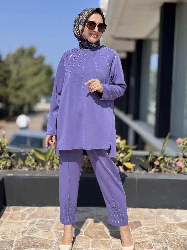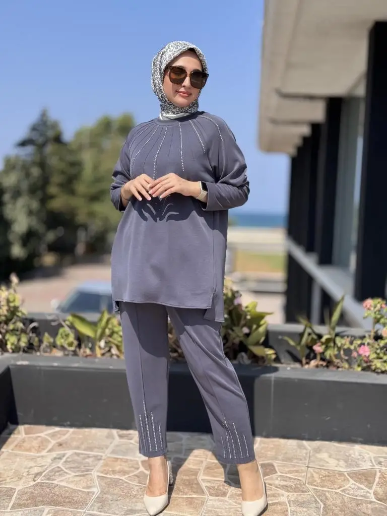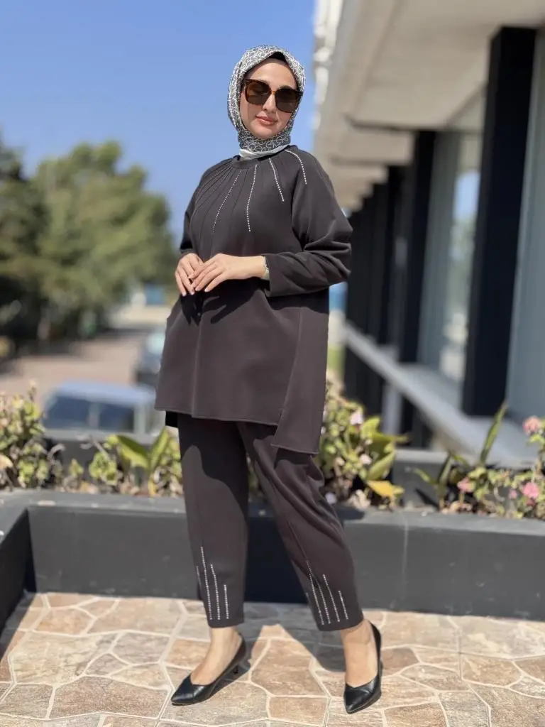 Tığ Triko Metal Süslemeli Nervürlü Tunik Pantolon Takım TKM3043