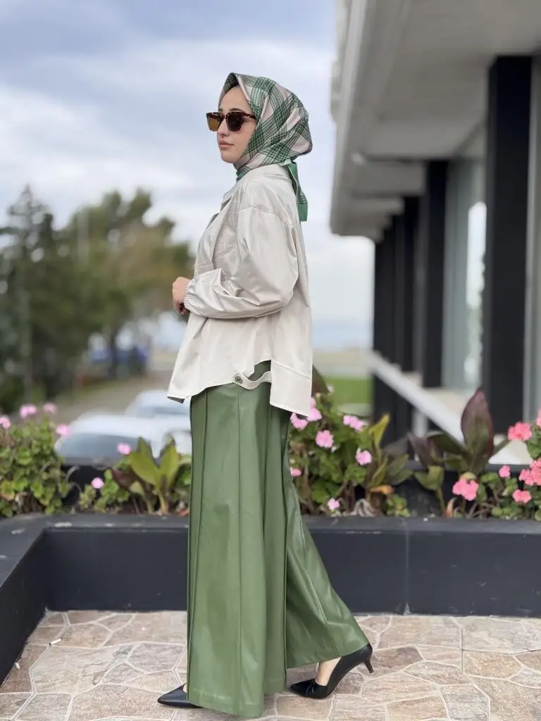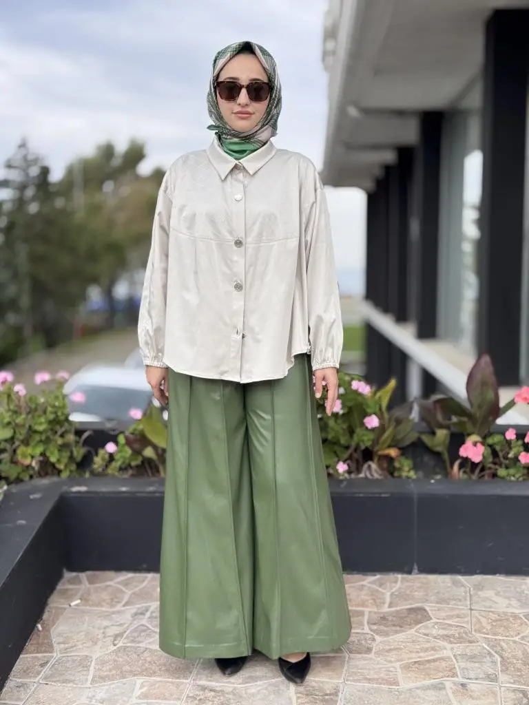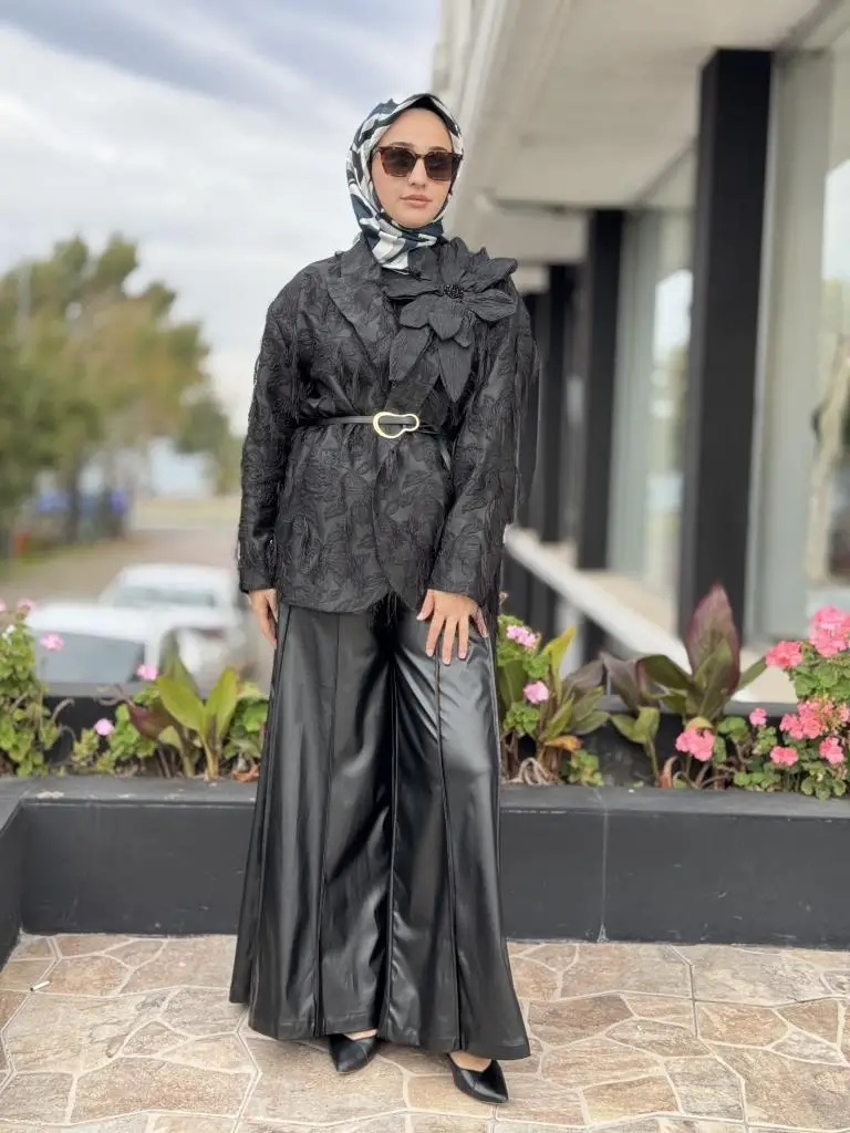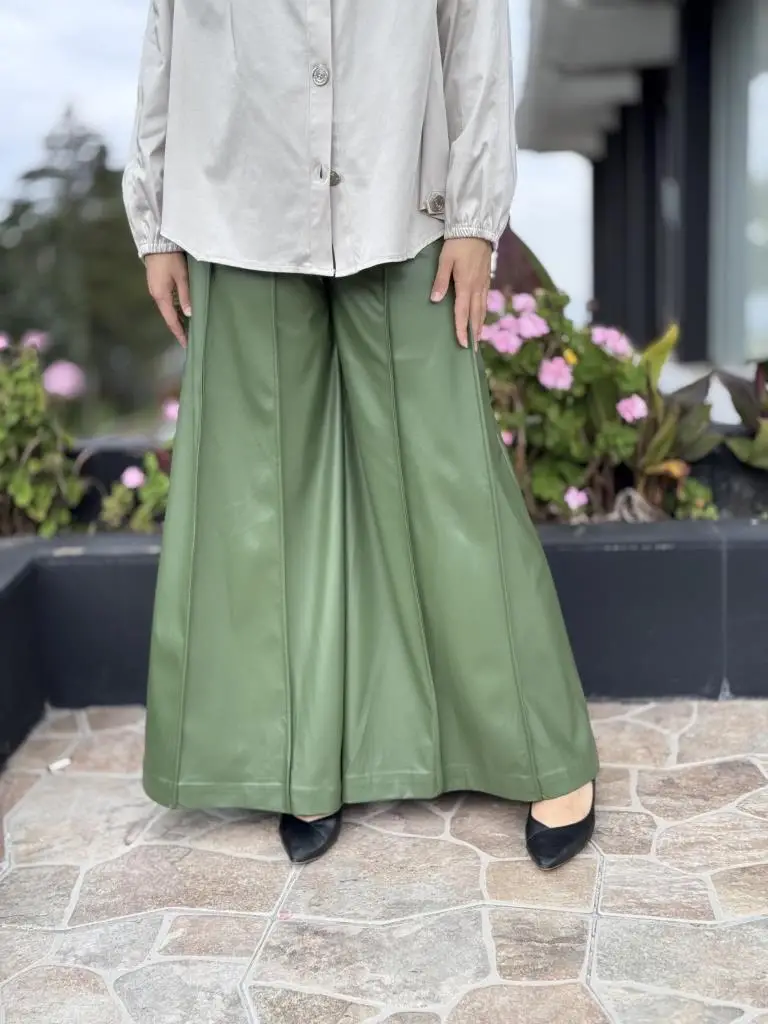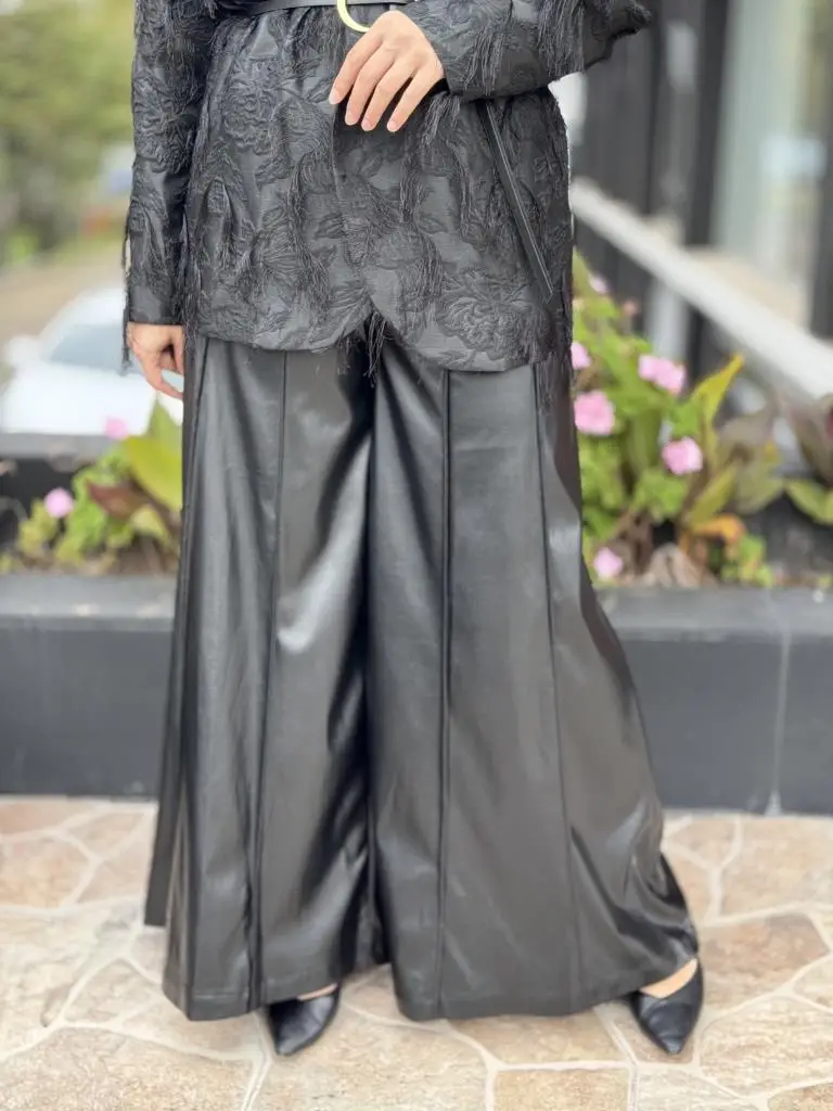 Vuu Dikiş Detaylı Geniş Paça Deri Pantolon