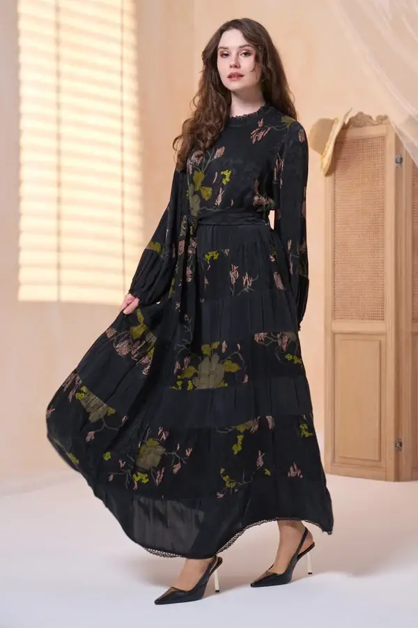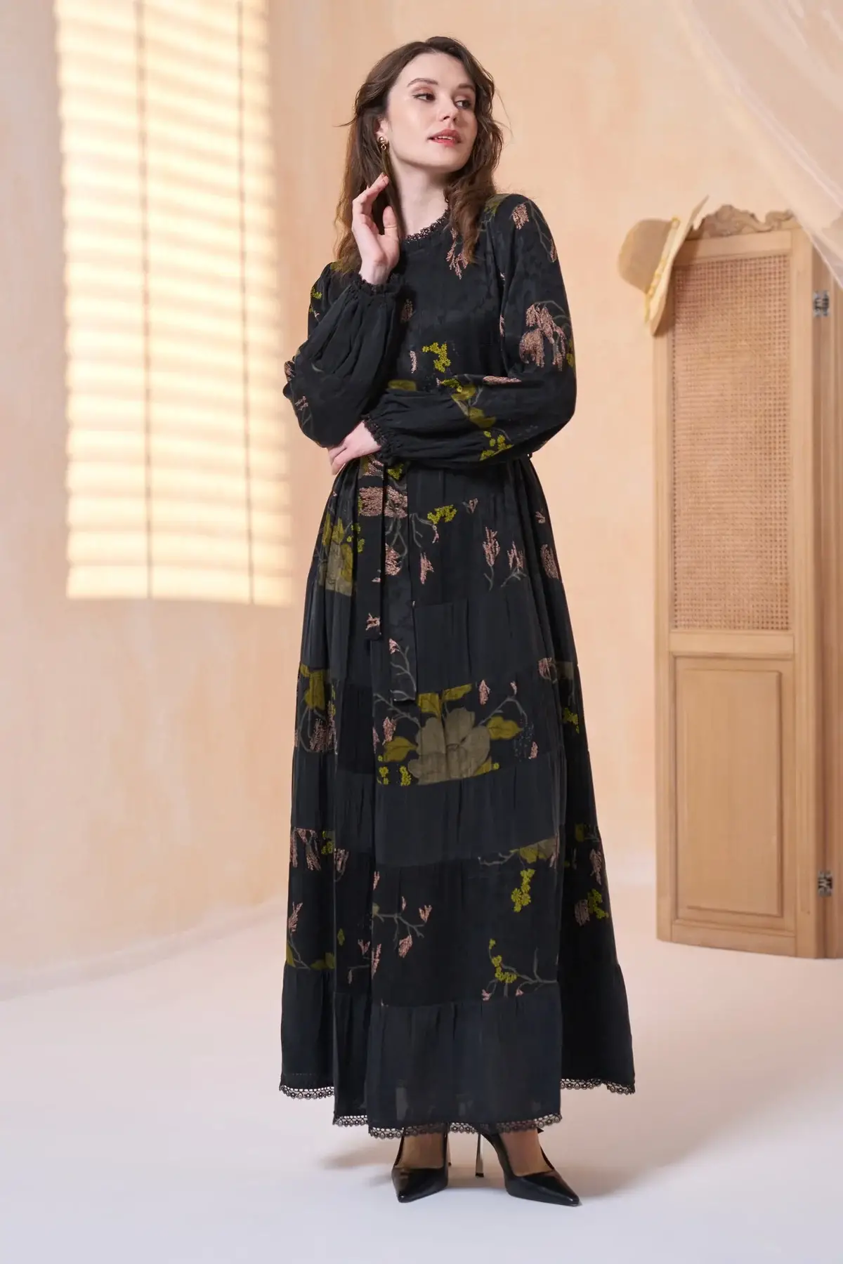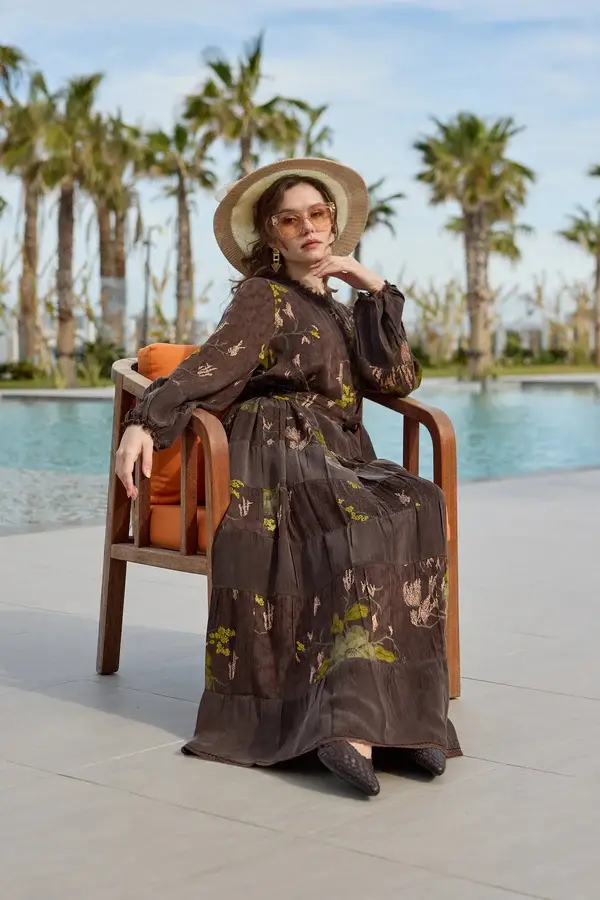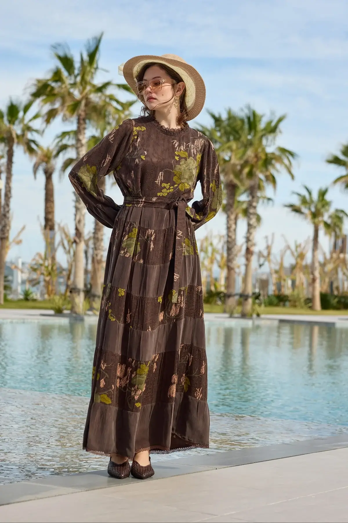 ÜRÜN DESENLİ JAKARLI KUMAŞ PARÇALI KUPRA İPEK ELBİSEDİR