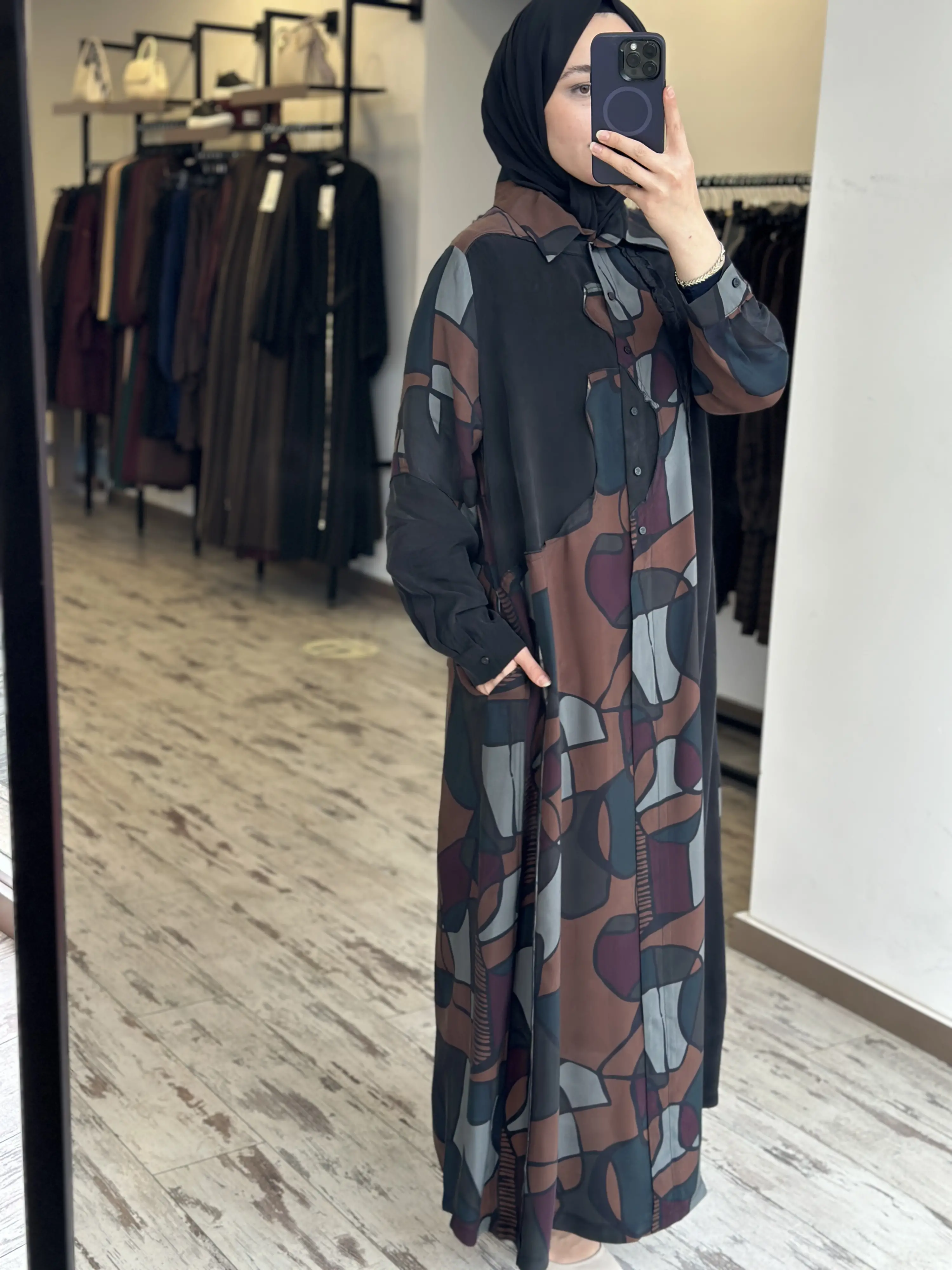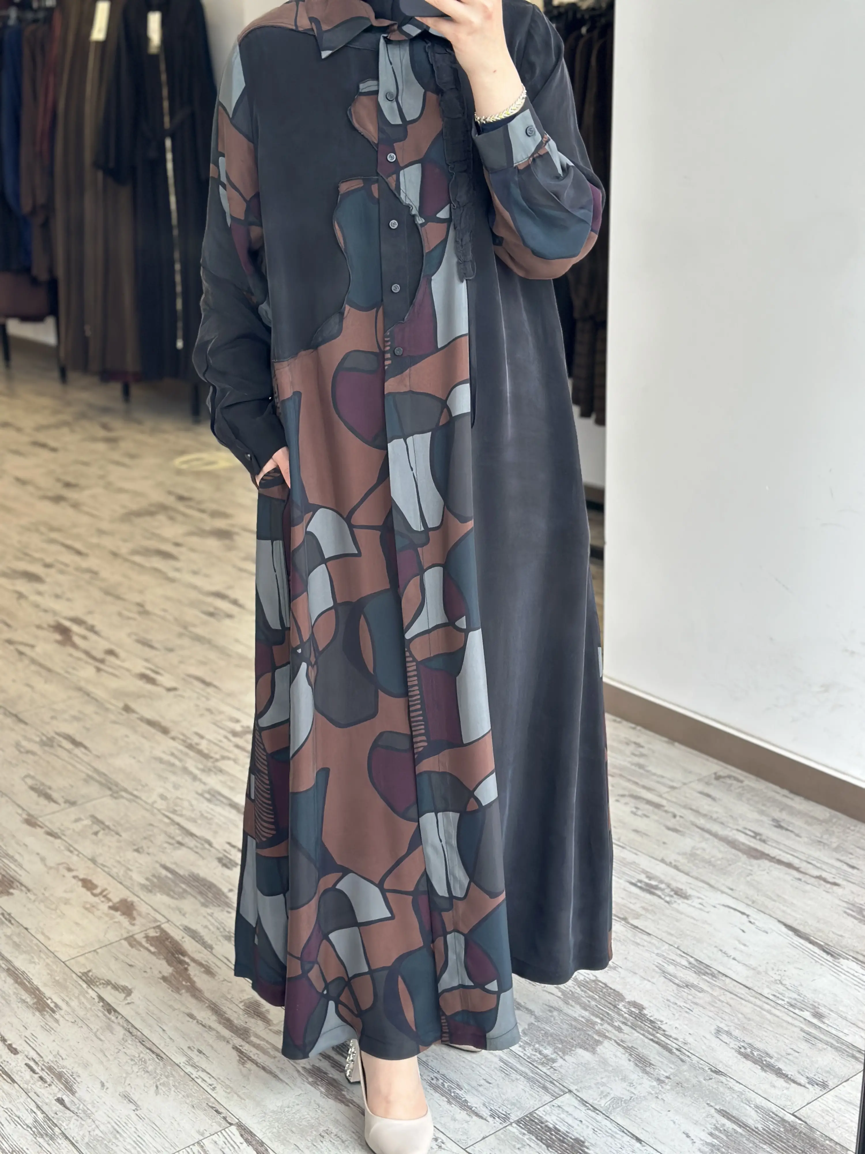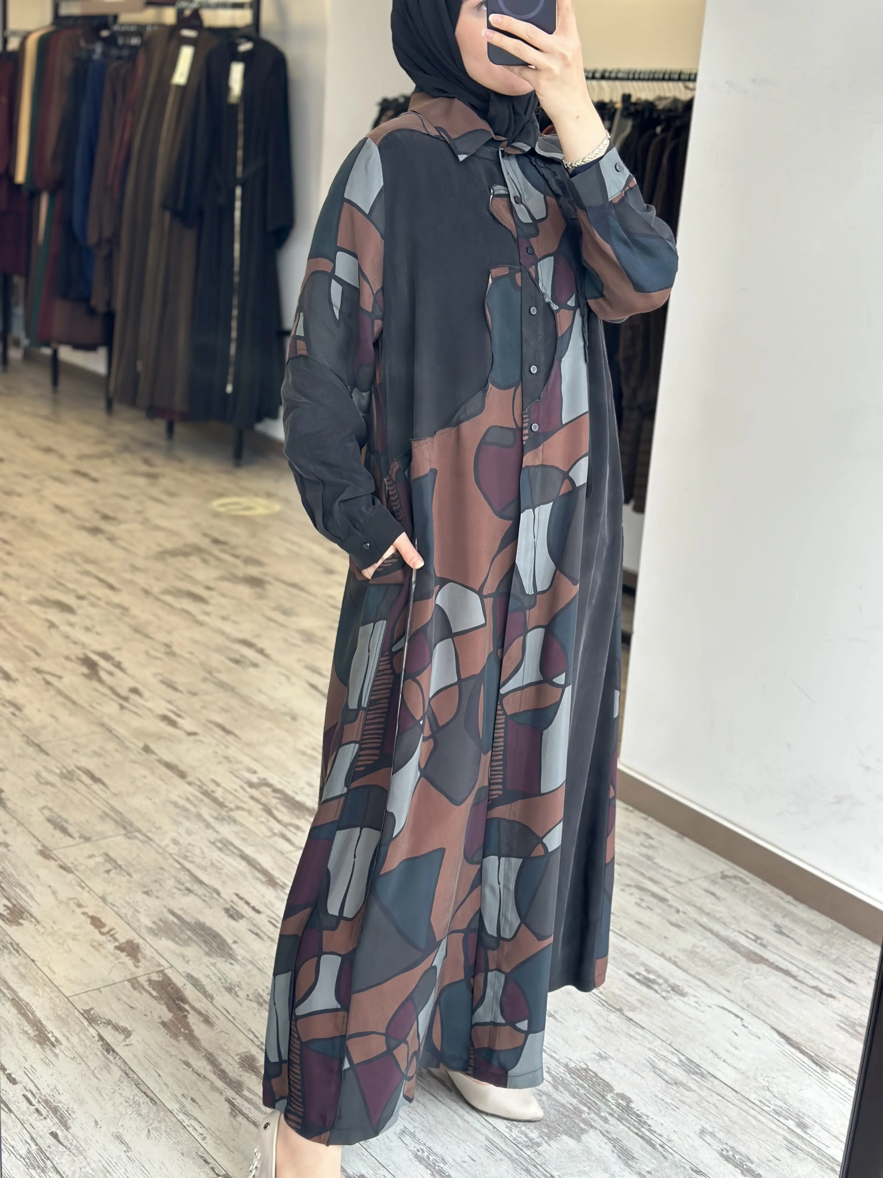 ÜRÜN GEOMETRİK DESENLİ GÖMLEK YAKA KUPRA İPEK BÜYÜK BEDEN ELBİSEDİR