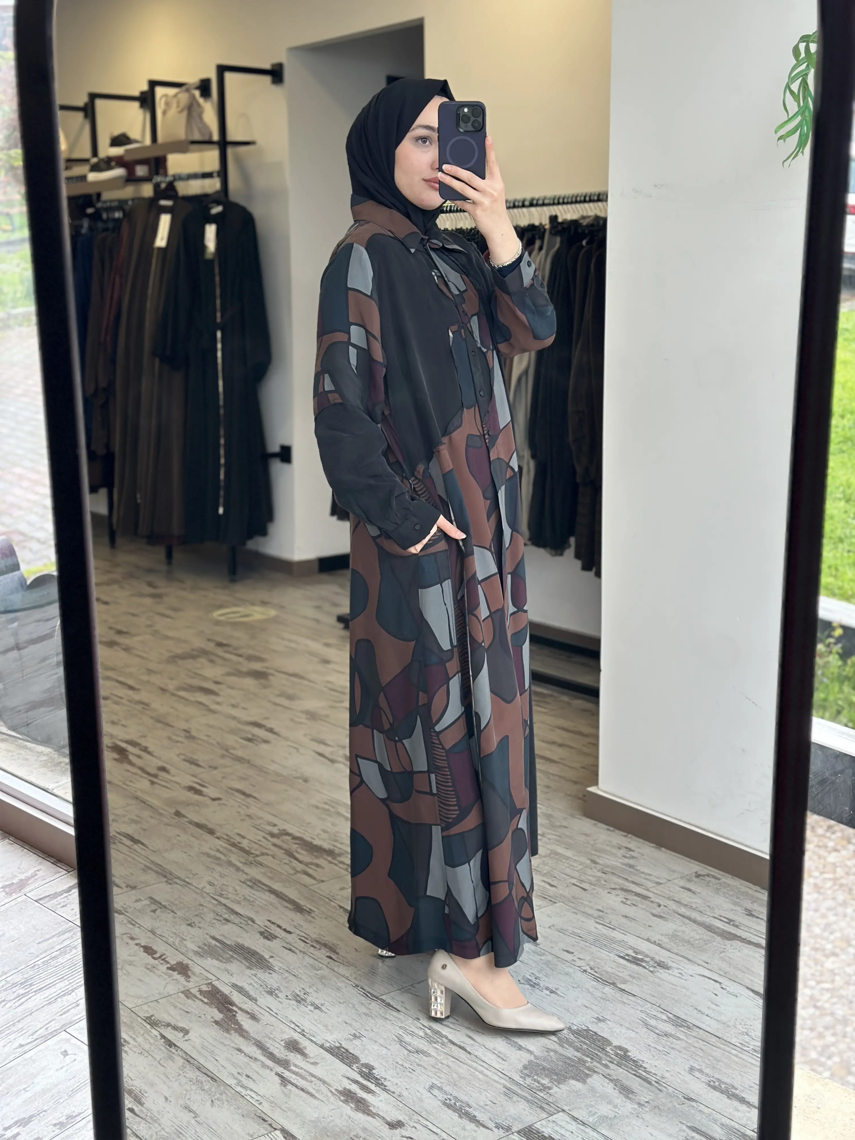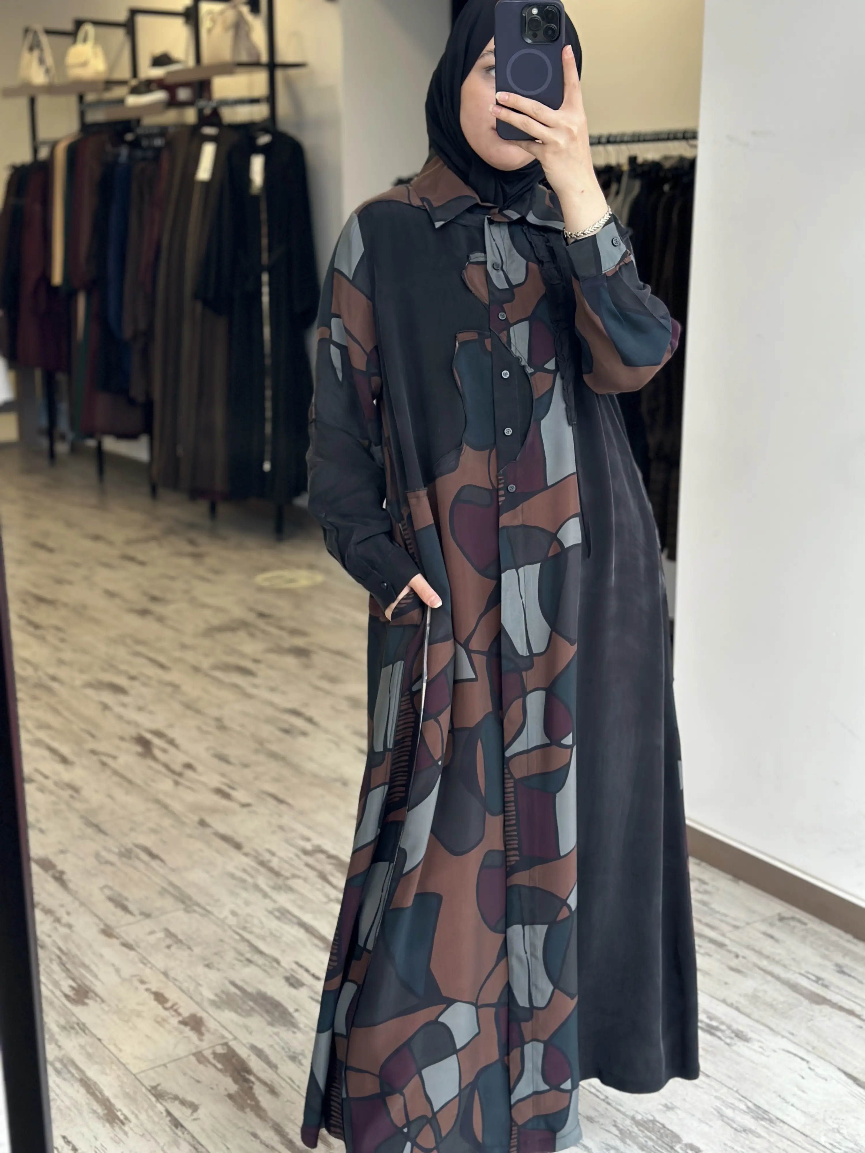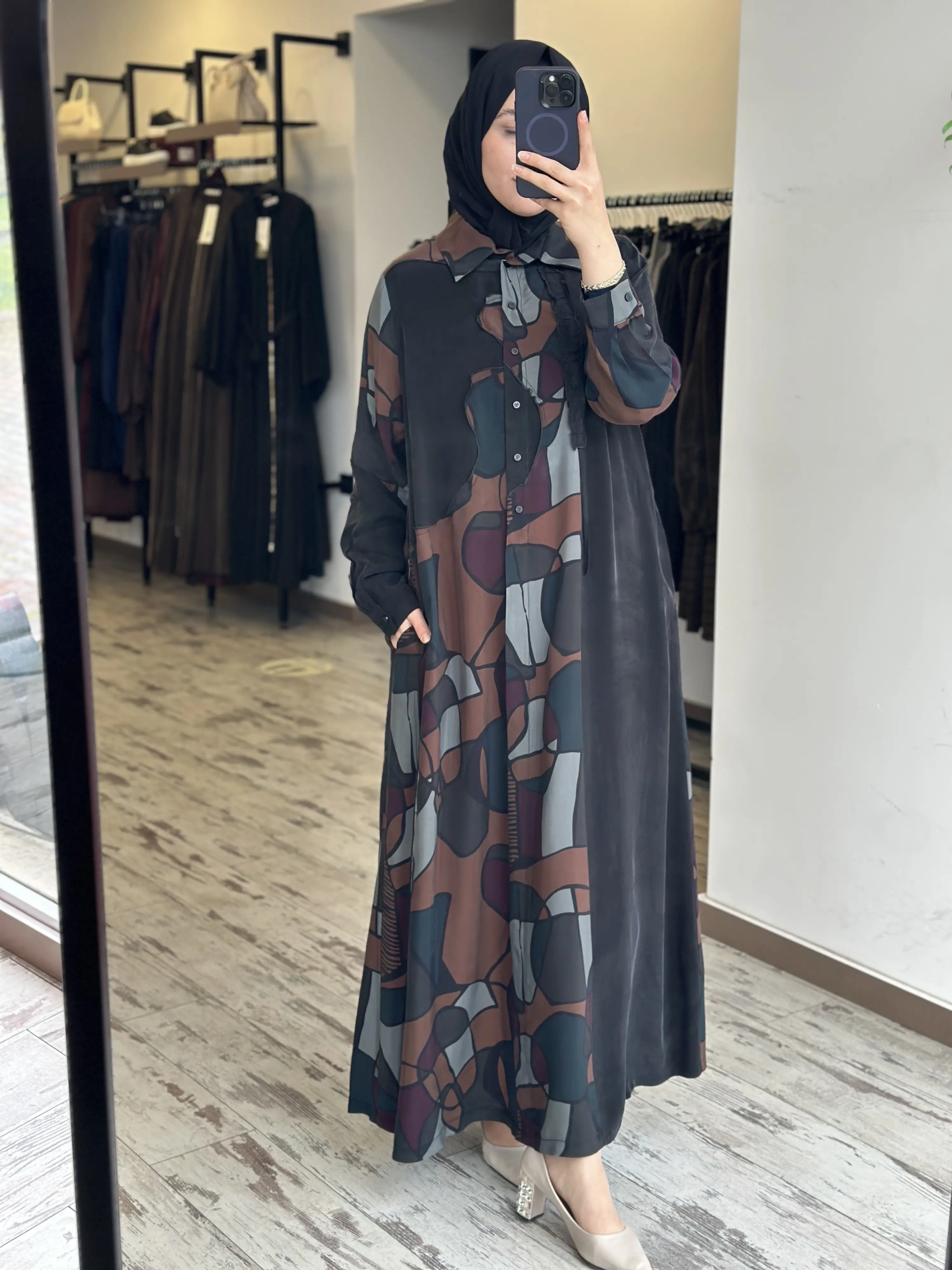 ÜRÜN GEOMETRİK DESENLİ GÖMLEK YAKA KUPRA İPEK BÜYÜK BEDEN ELBİSEDİR
