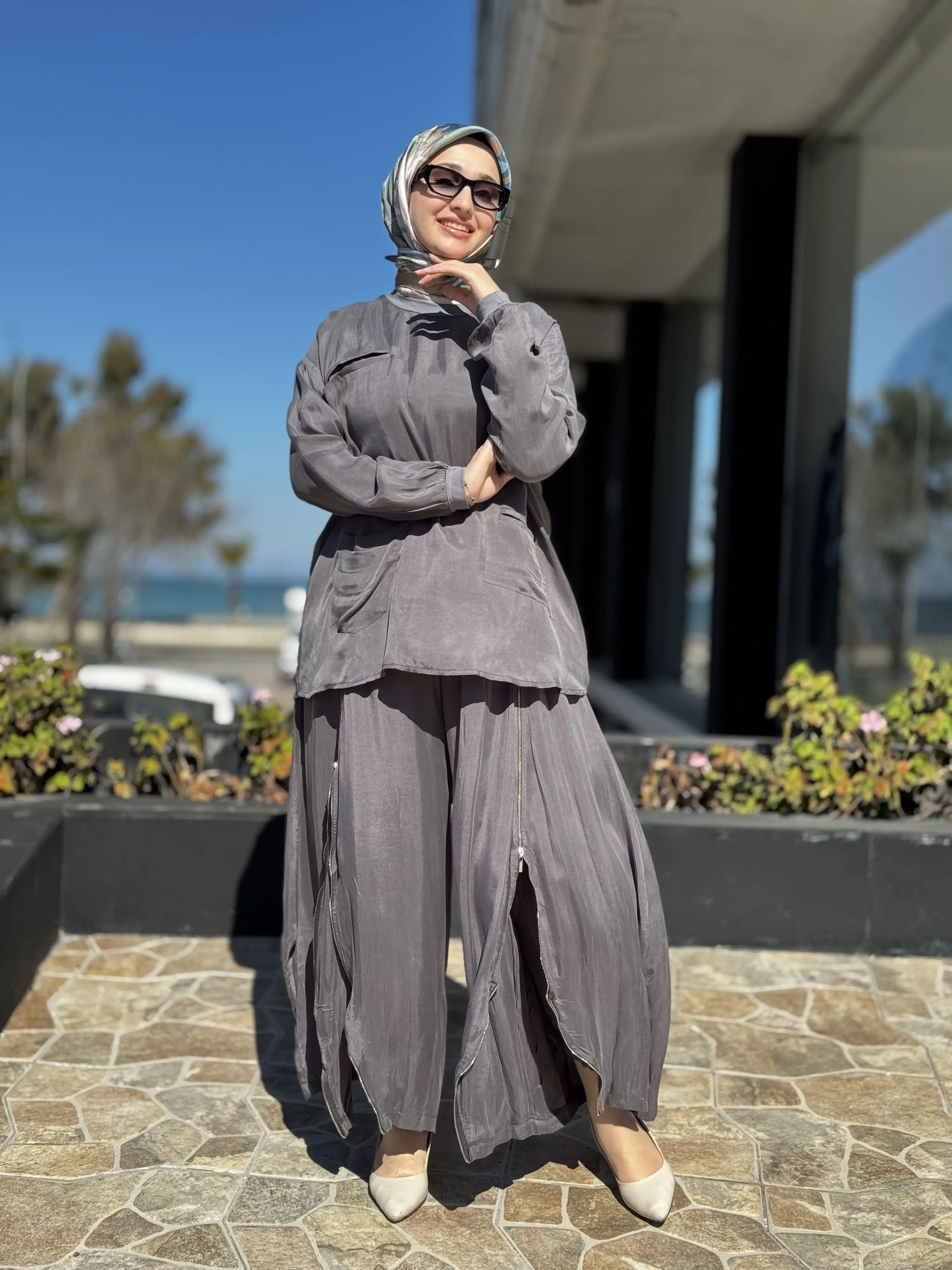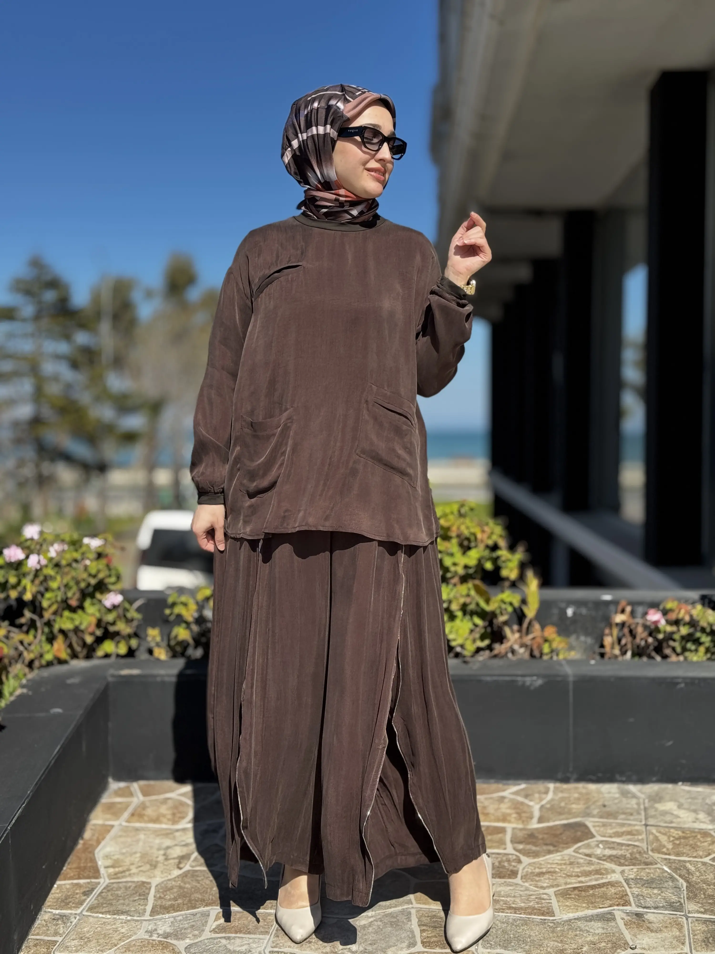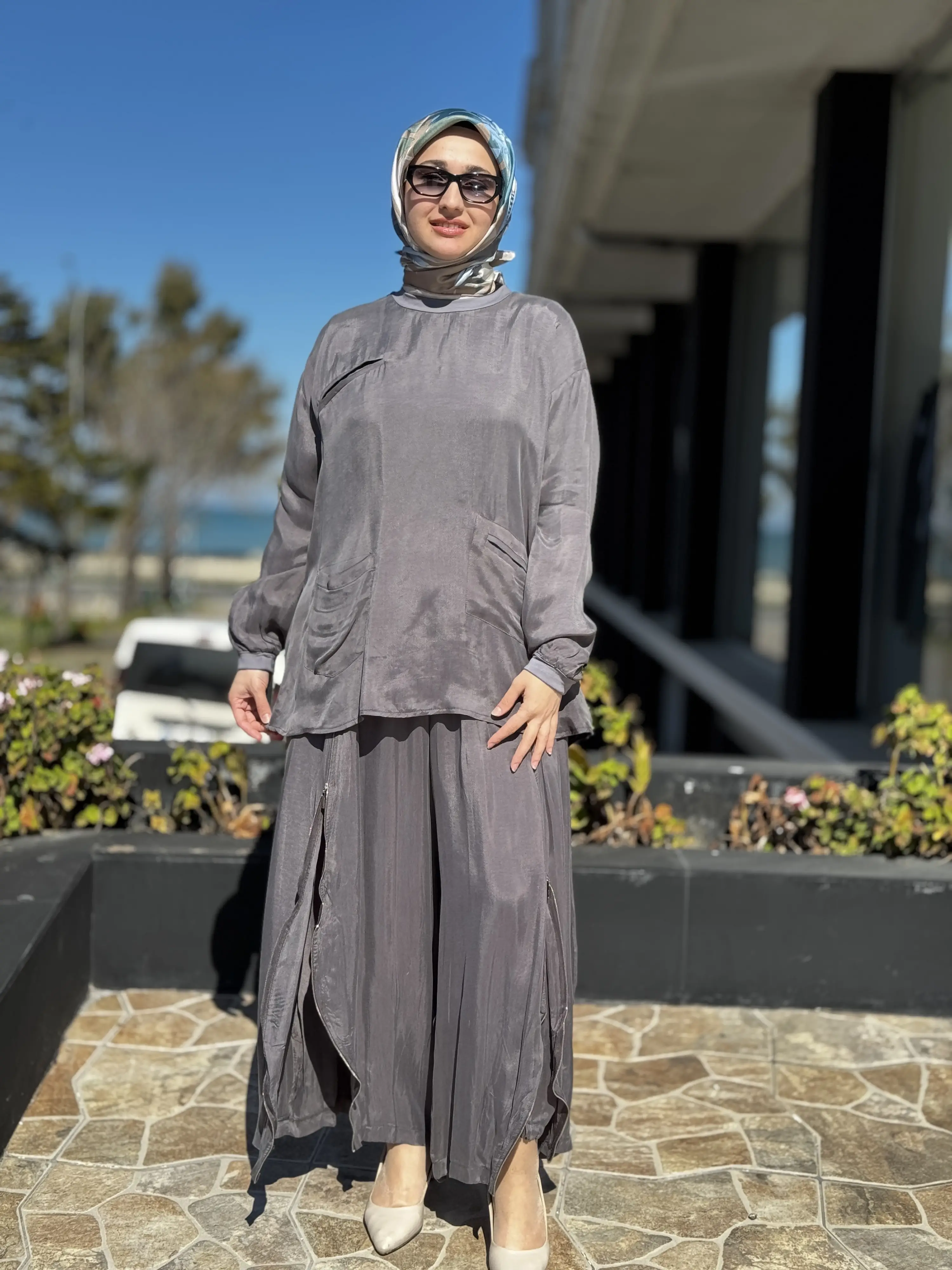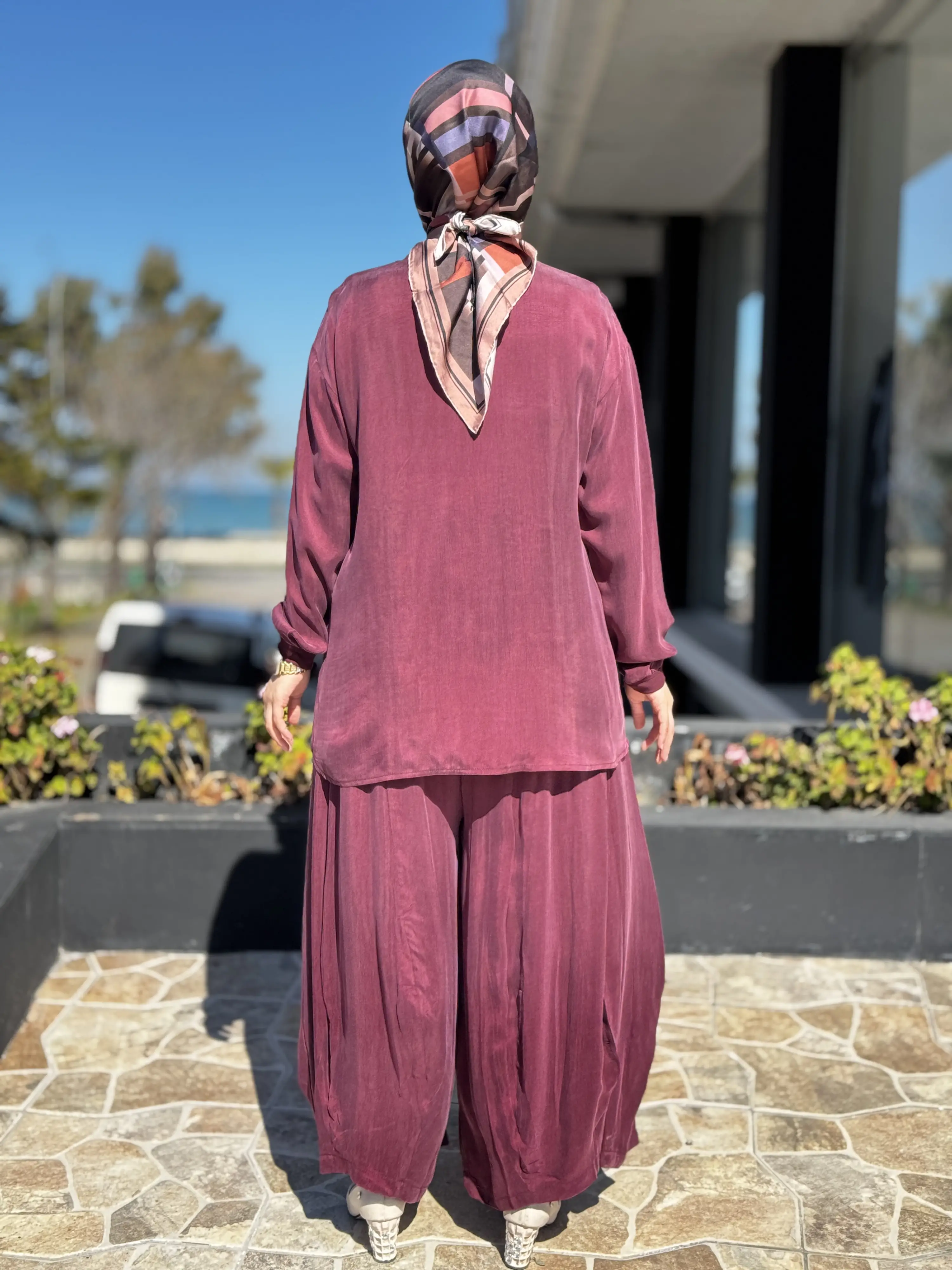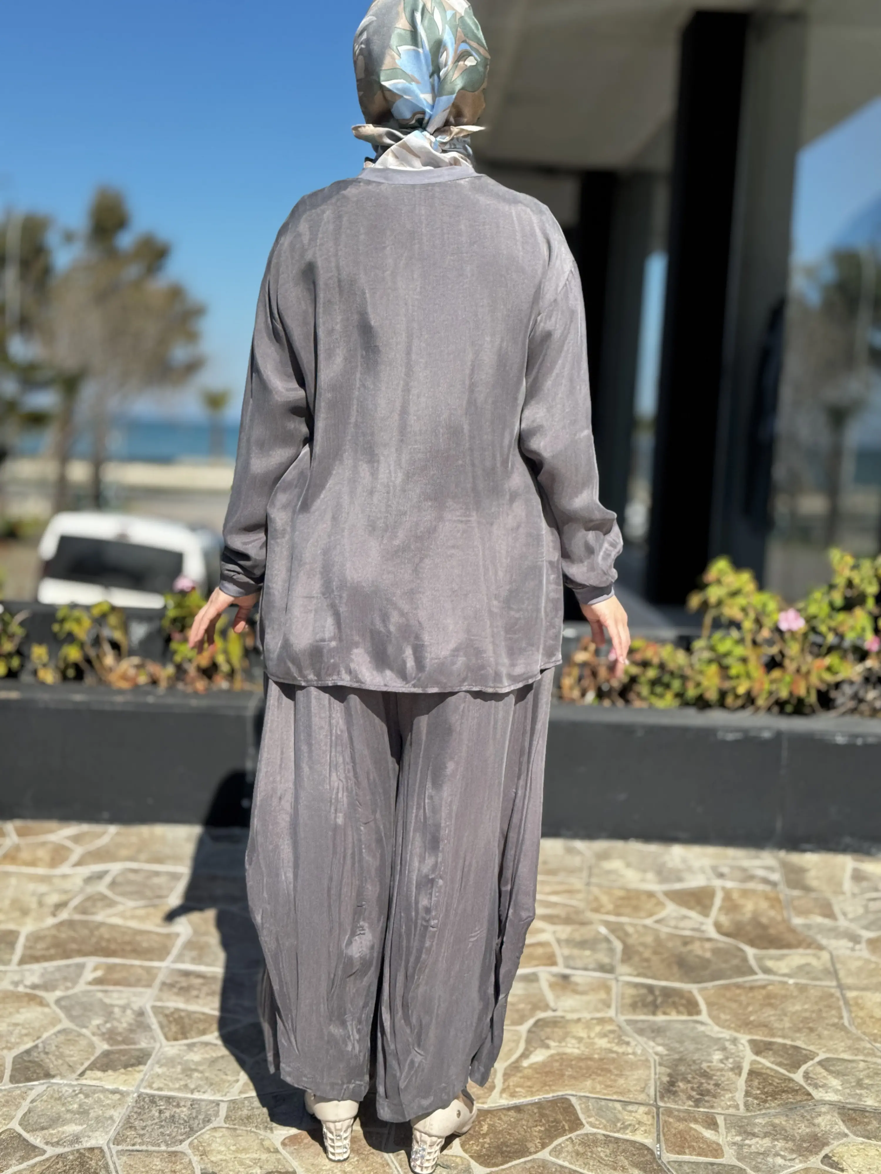 ÜRÜN FERMUAR DETAYLI KUPRA İPEK TUNİK ŞALVARLI PANTOLON TAKIMDIR