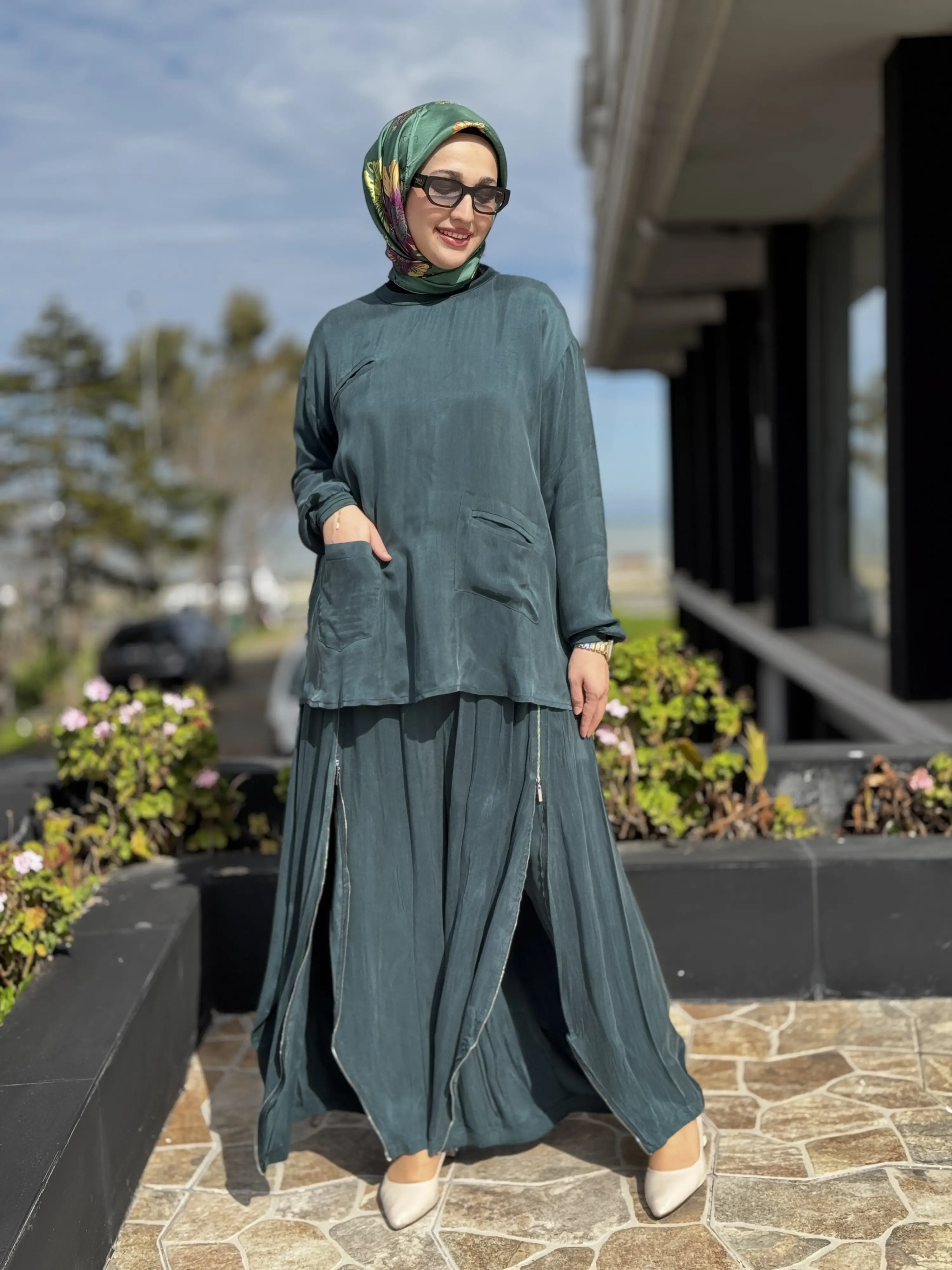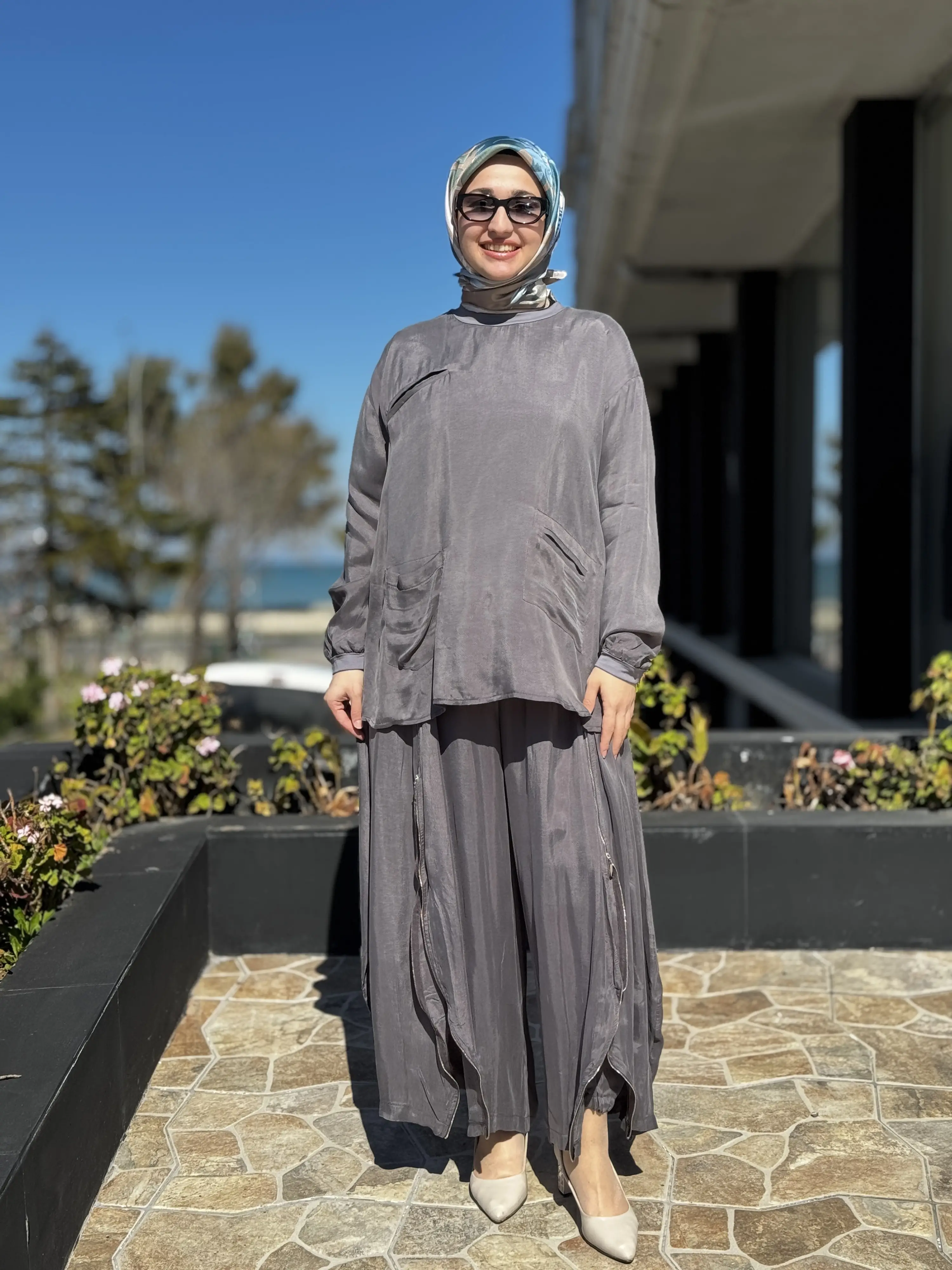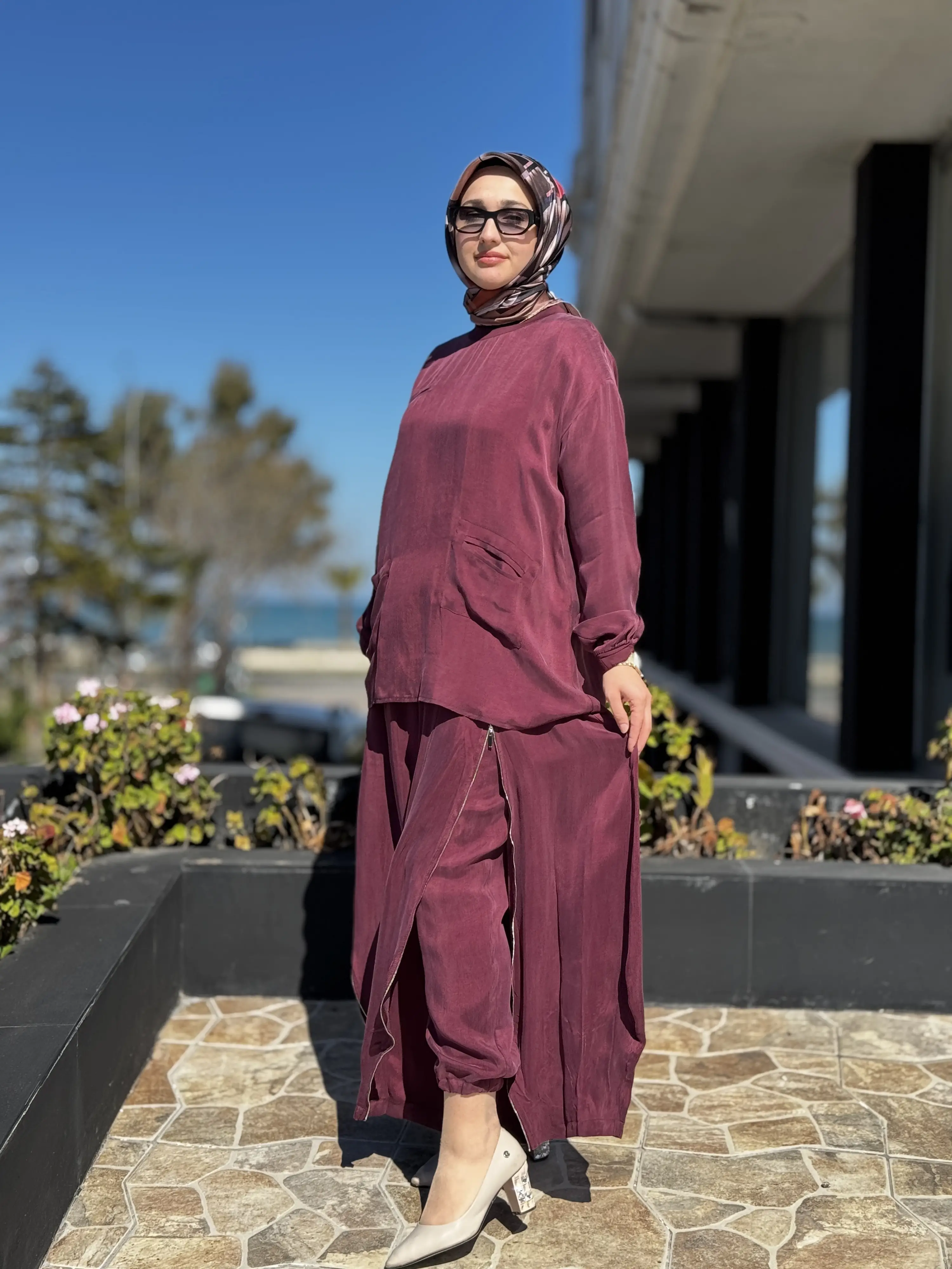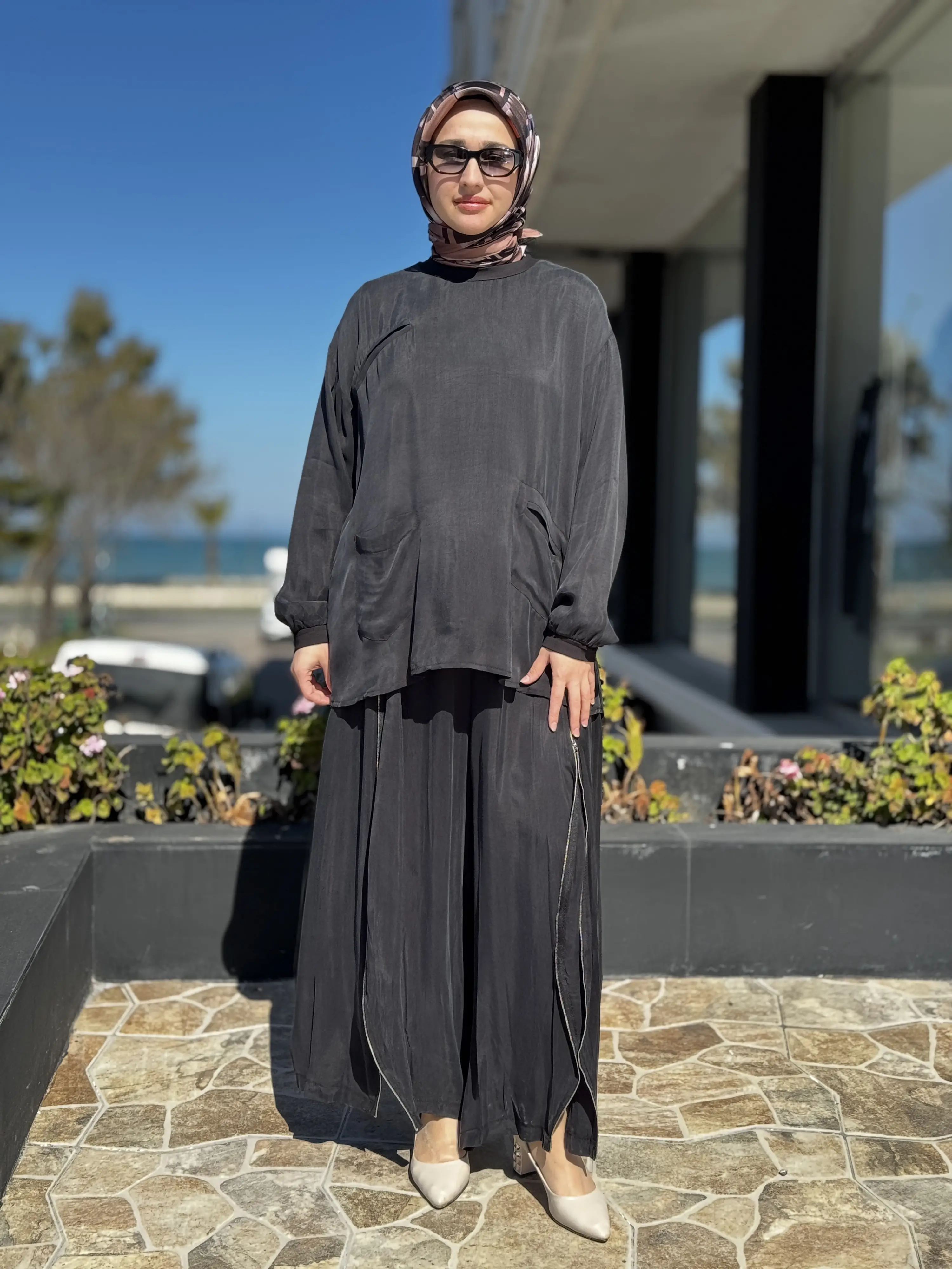 ÜRÜN FERMUAR DETAYLI KUPRA İPEK TUNİK ŞALVARLI PANTOLON TAKIMDIR