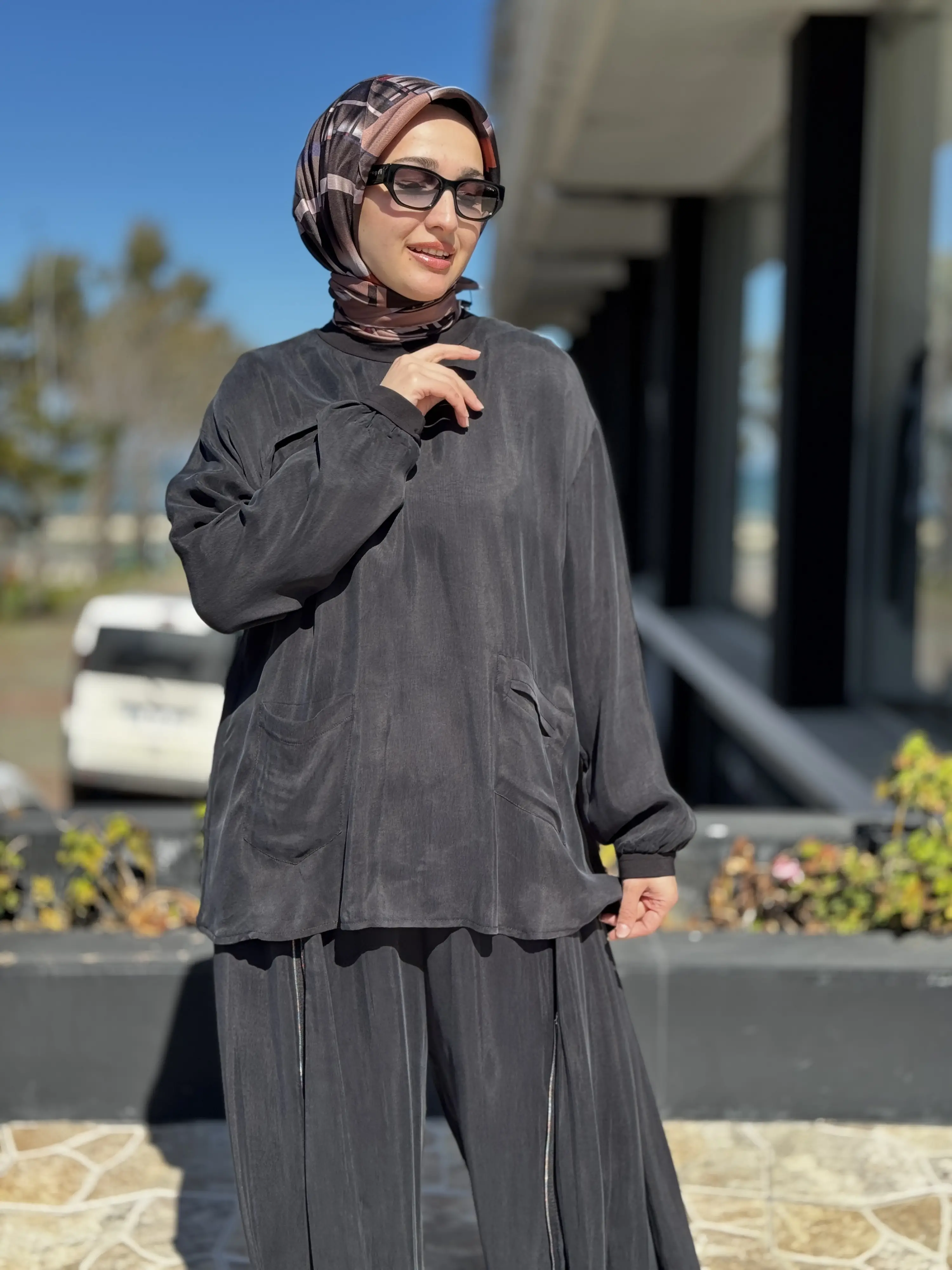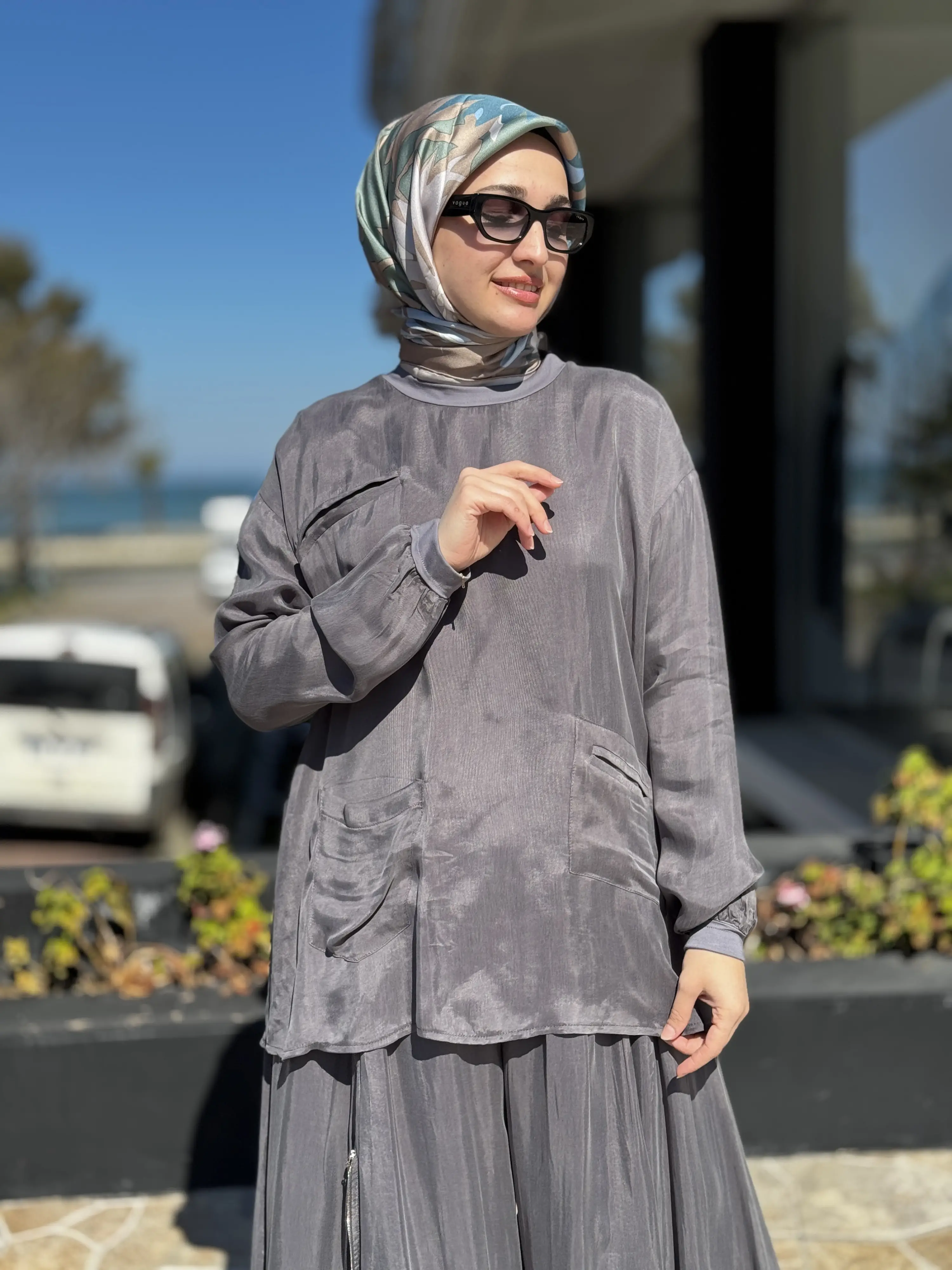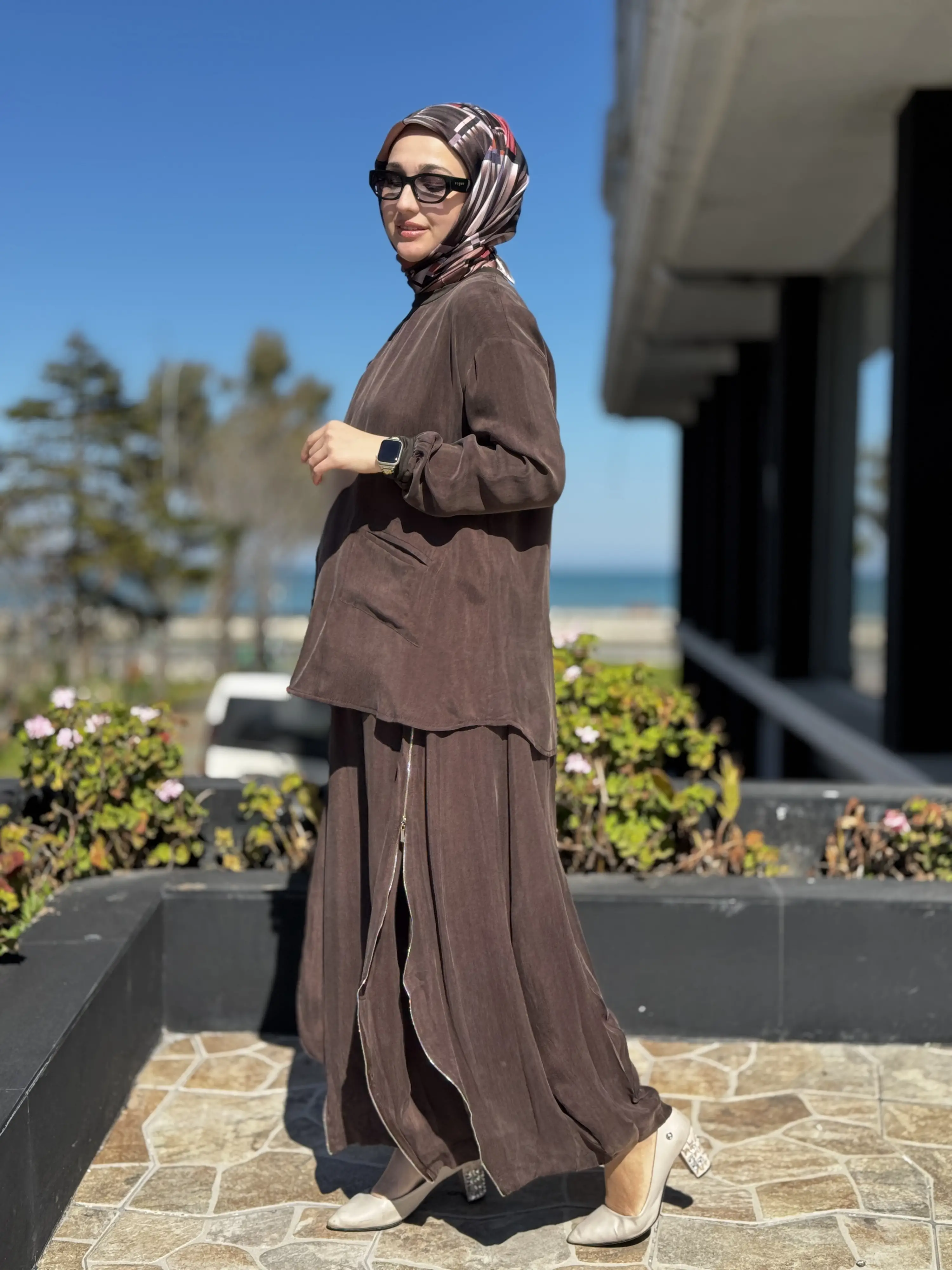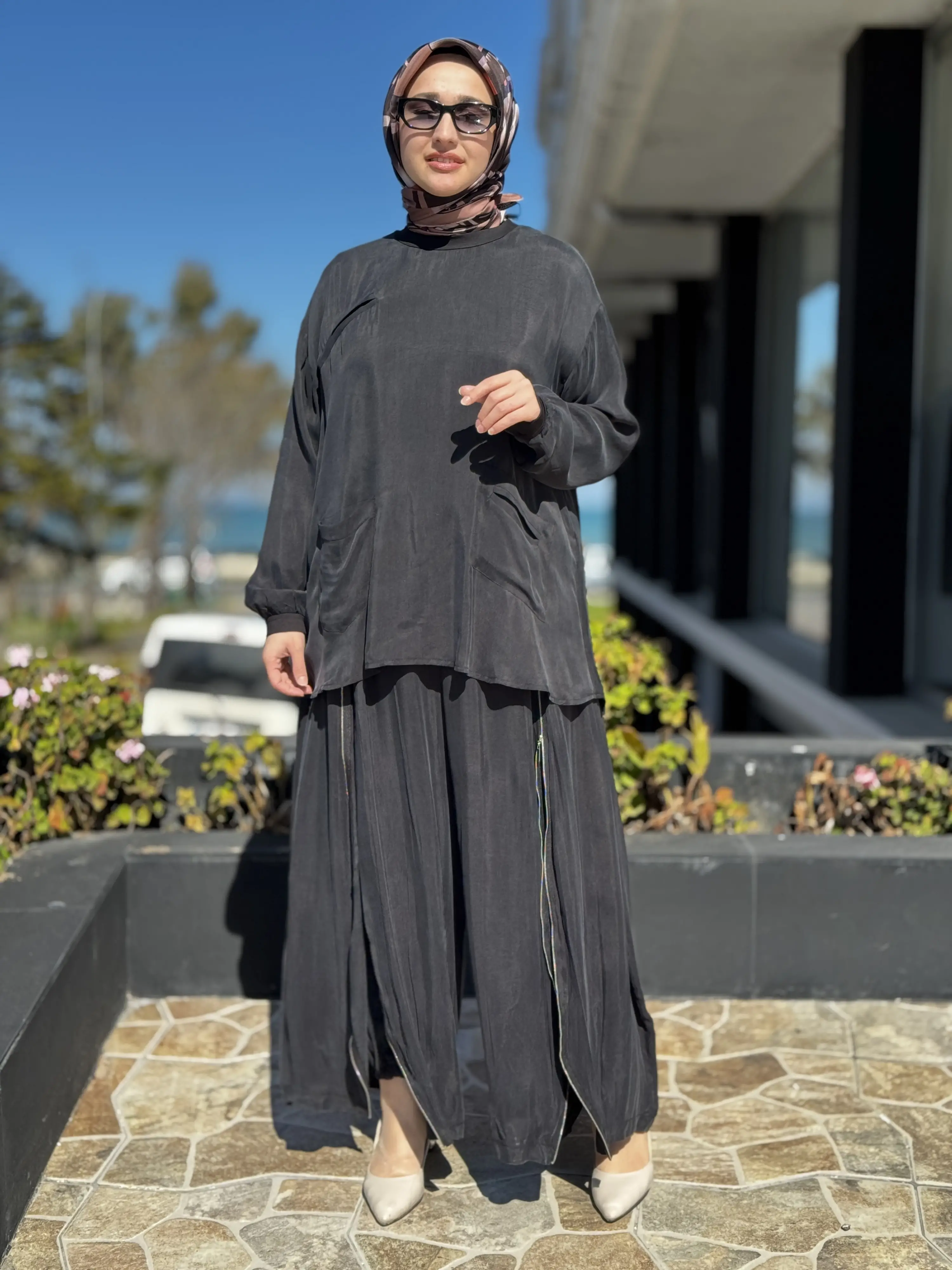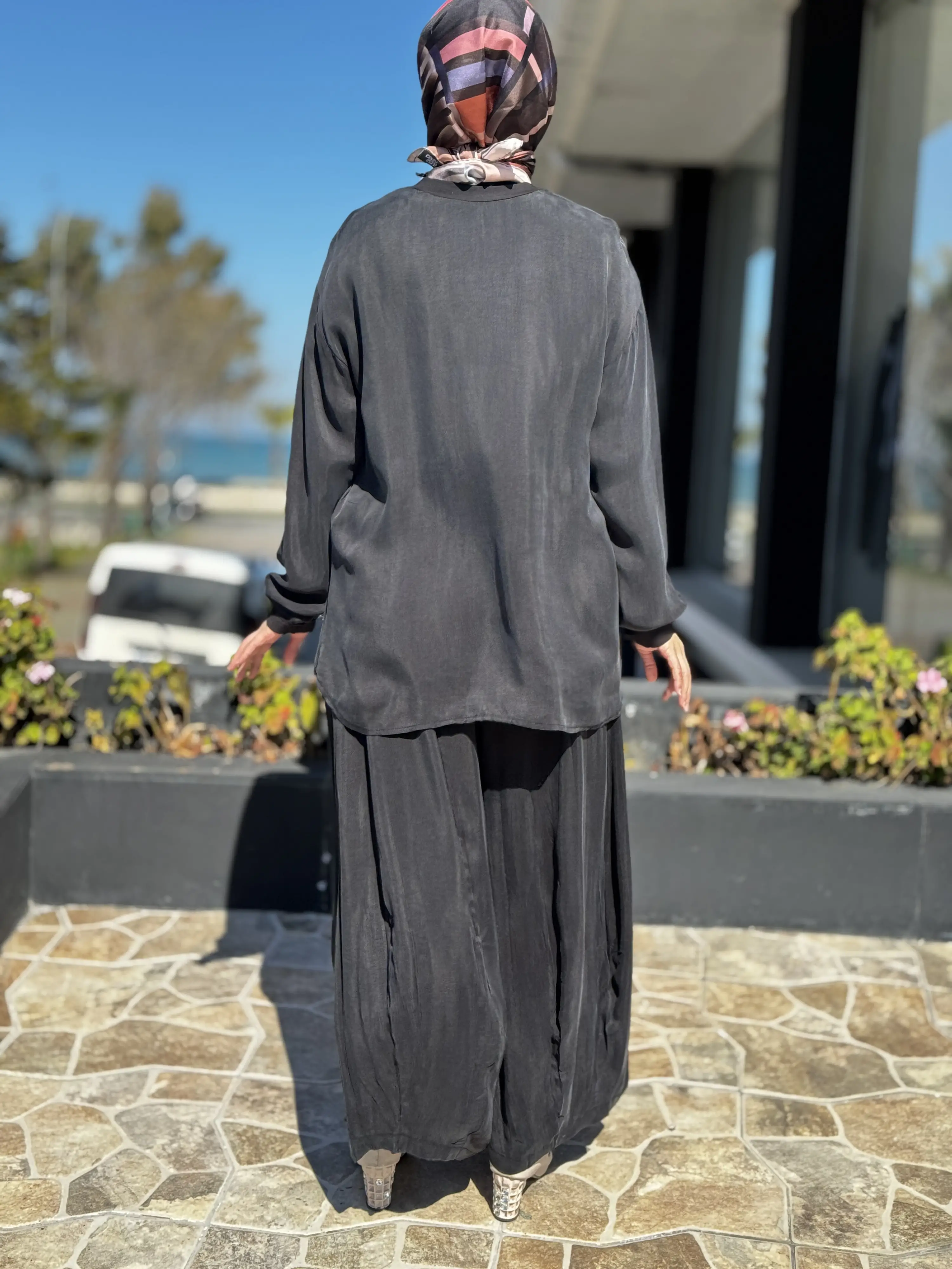 ÜRÜN FERMUAR DETAYLI KUPRA İPEK TUNİK ŞALVARLI PANTOLON TAKIMDIR
