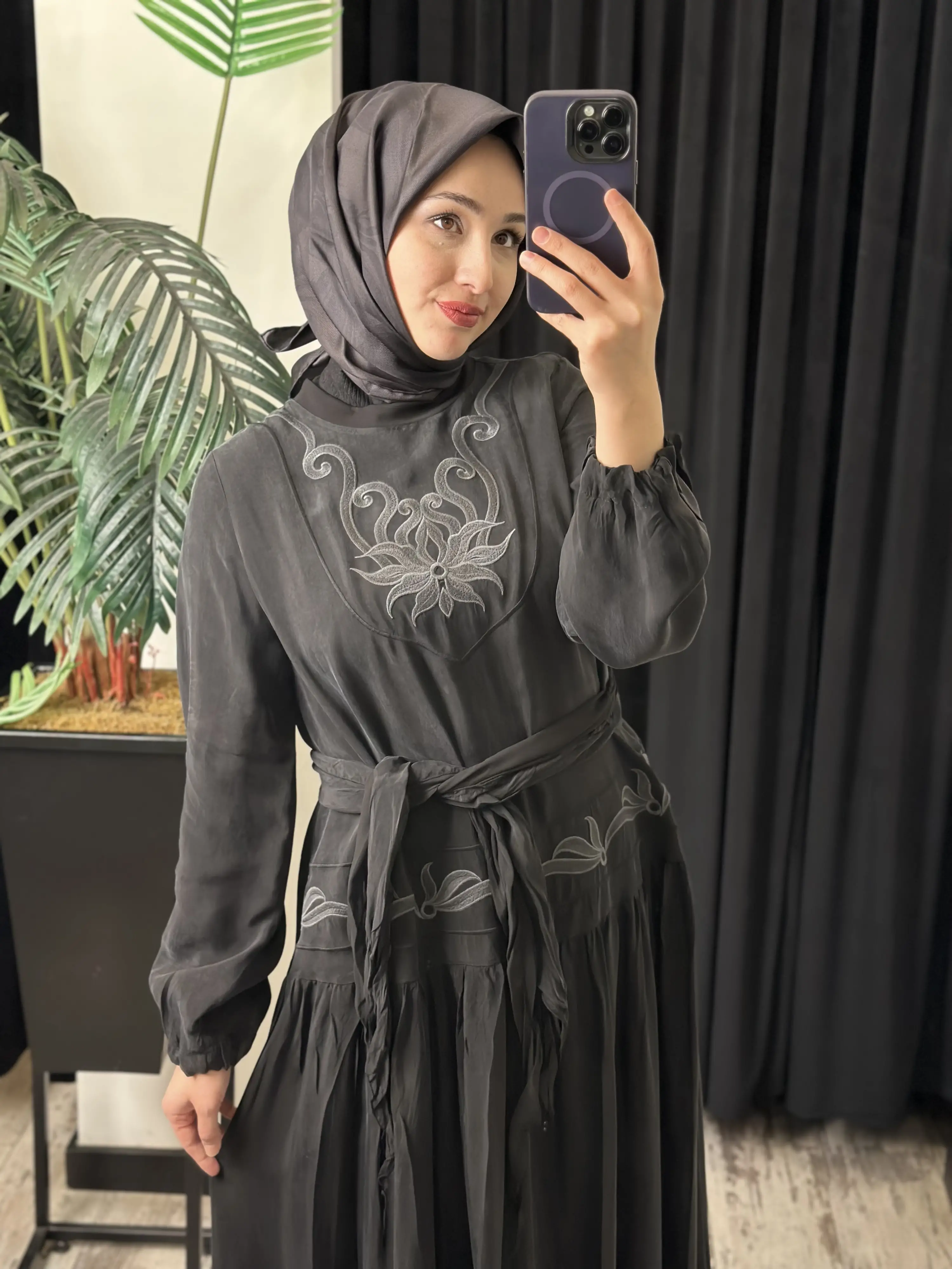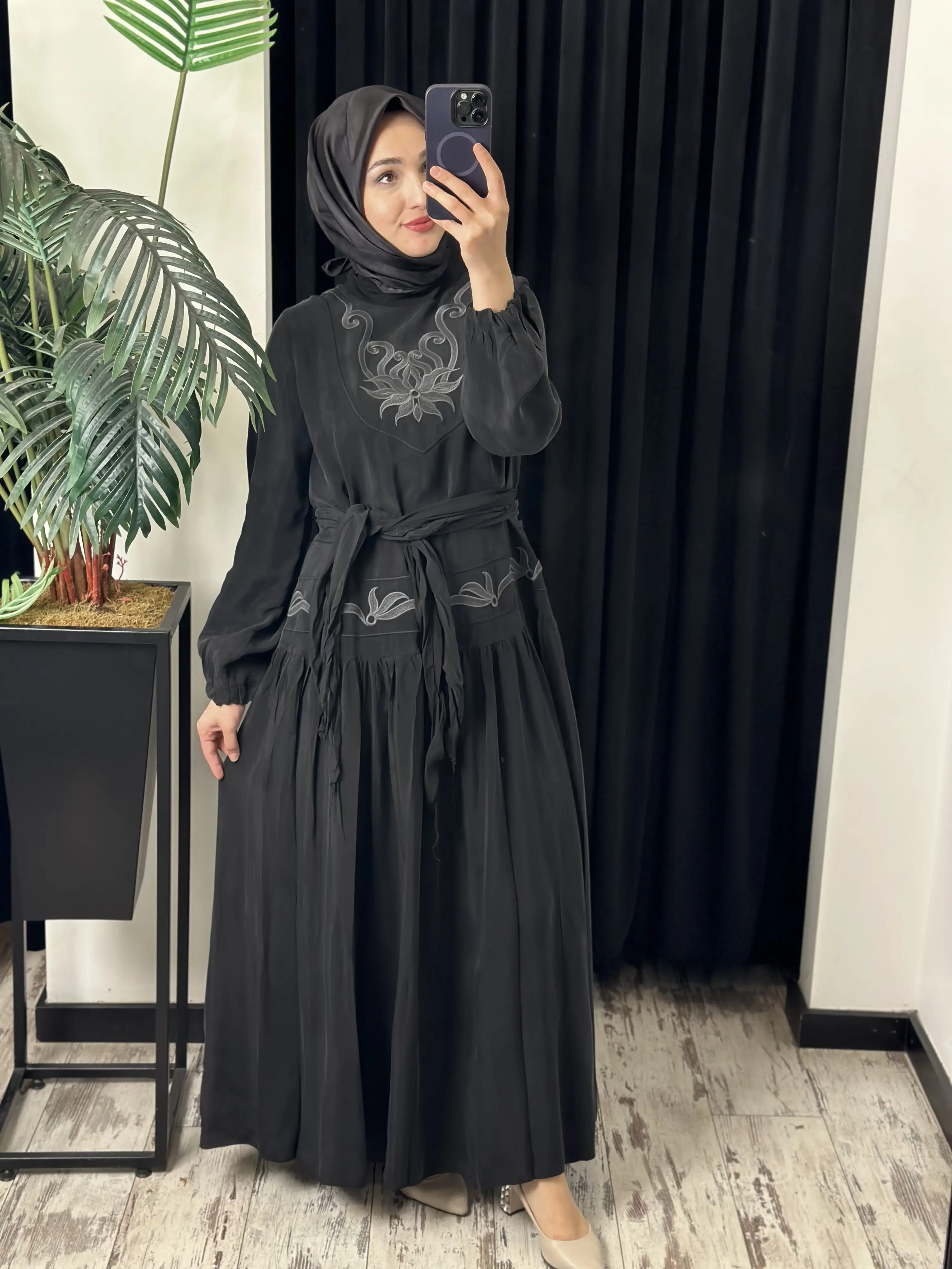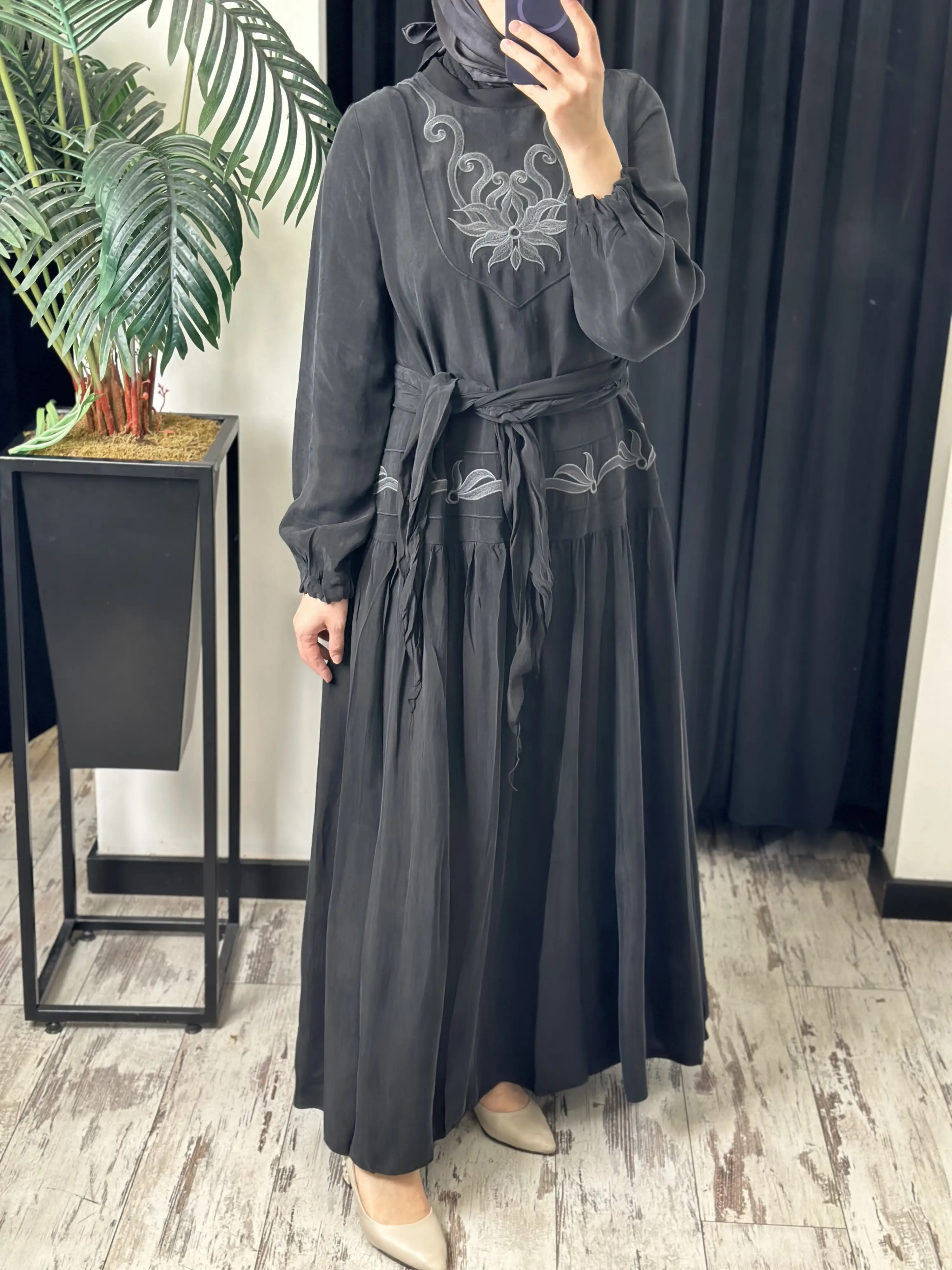 ÜRÜN NAKIŞ DETAYLI KUPRA İPEK ELBİSEDİR