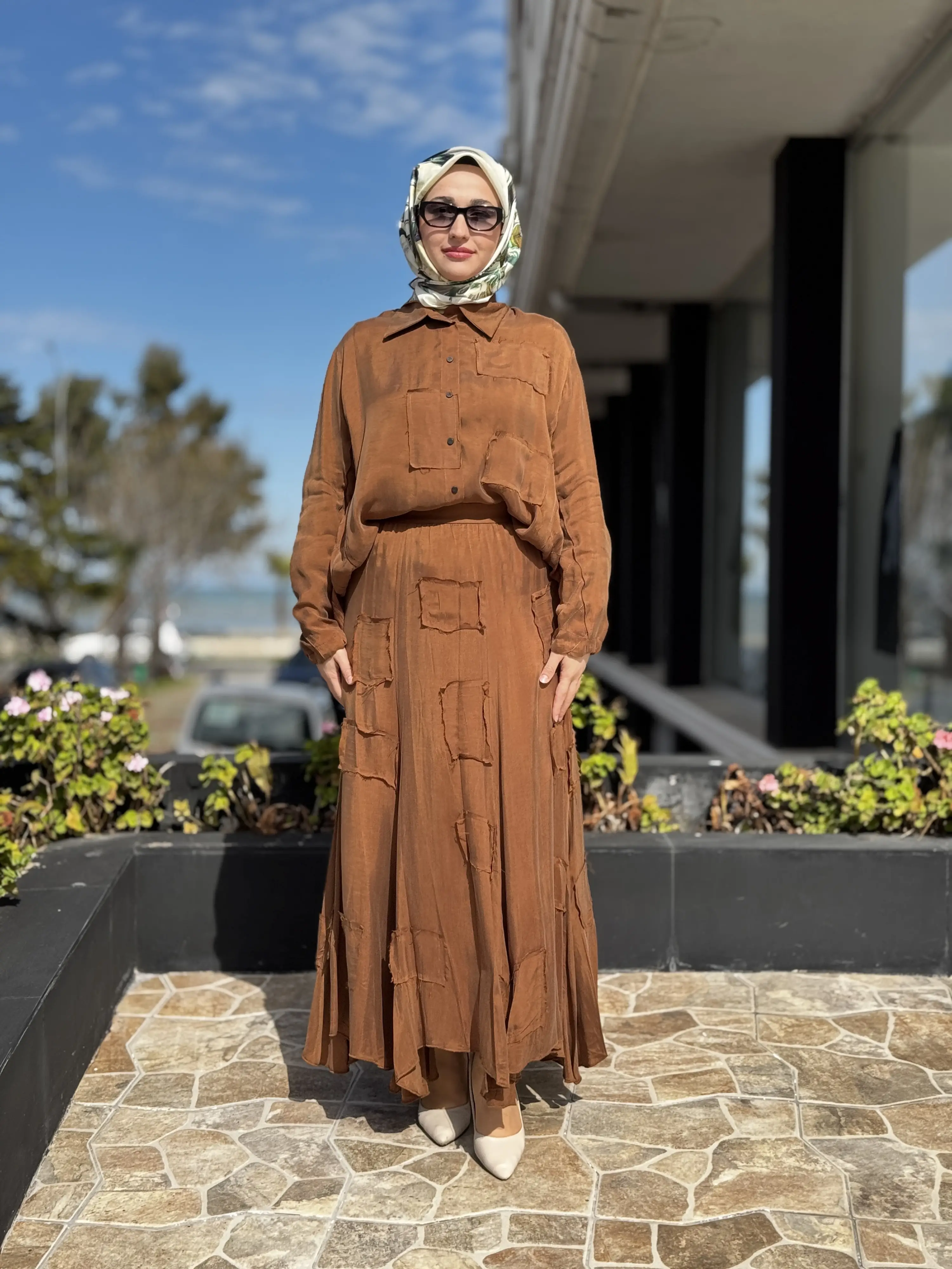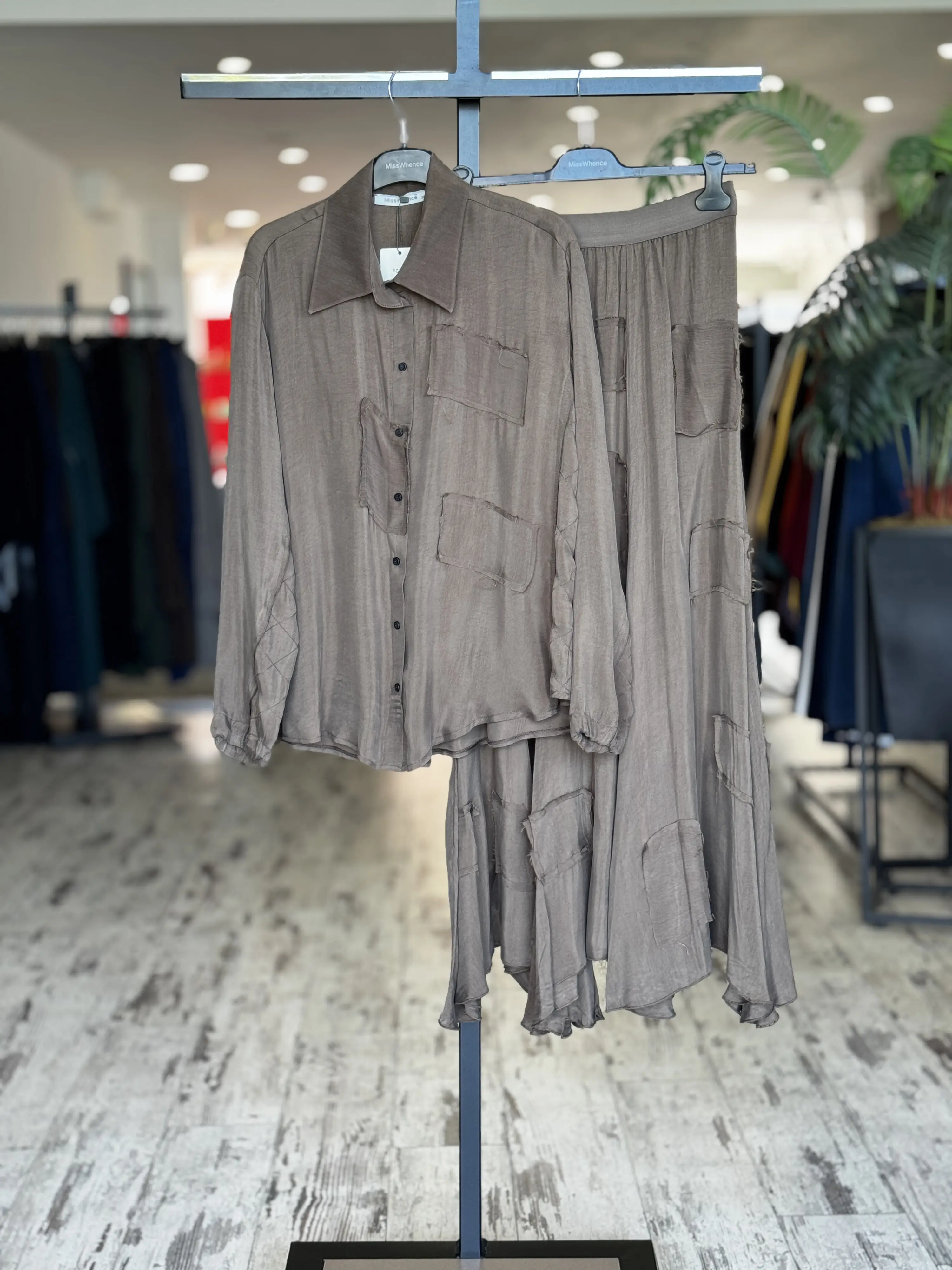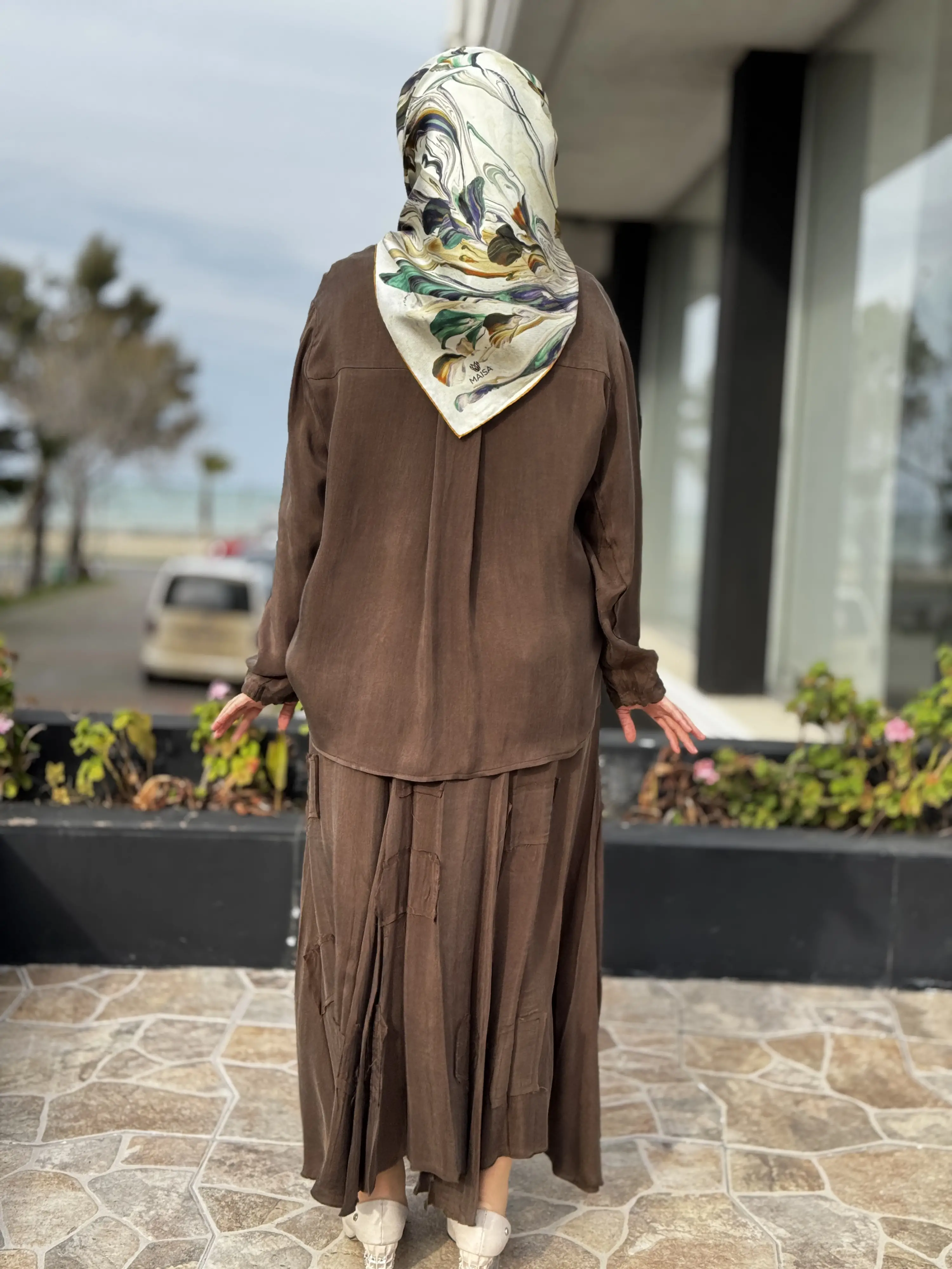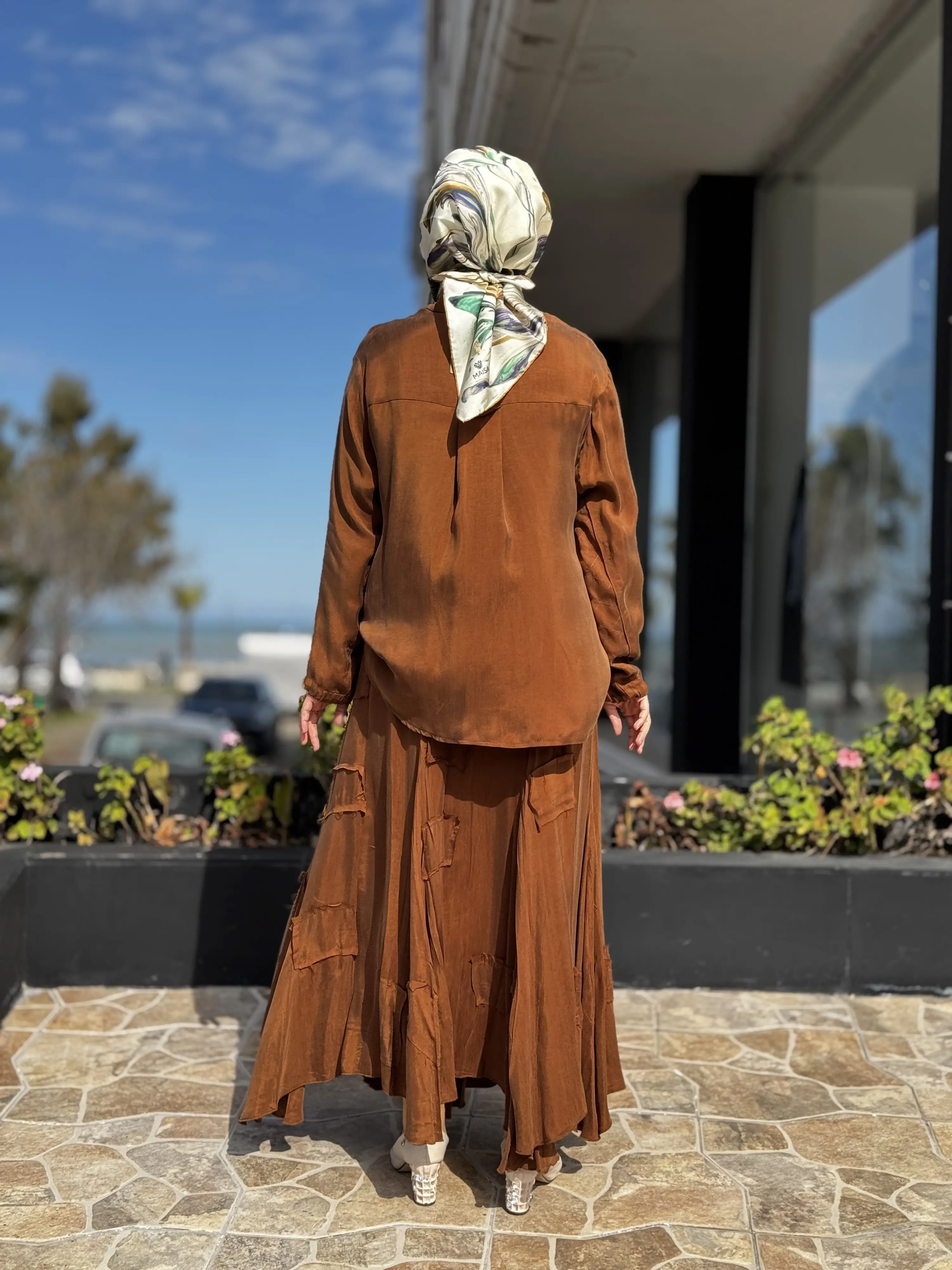 Misswhence Parça Kumaş Kombinli Cupra İpek Gömlek Etek Takım 39304