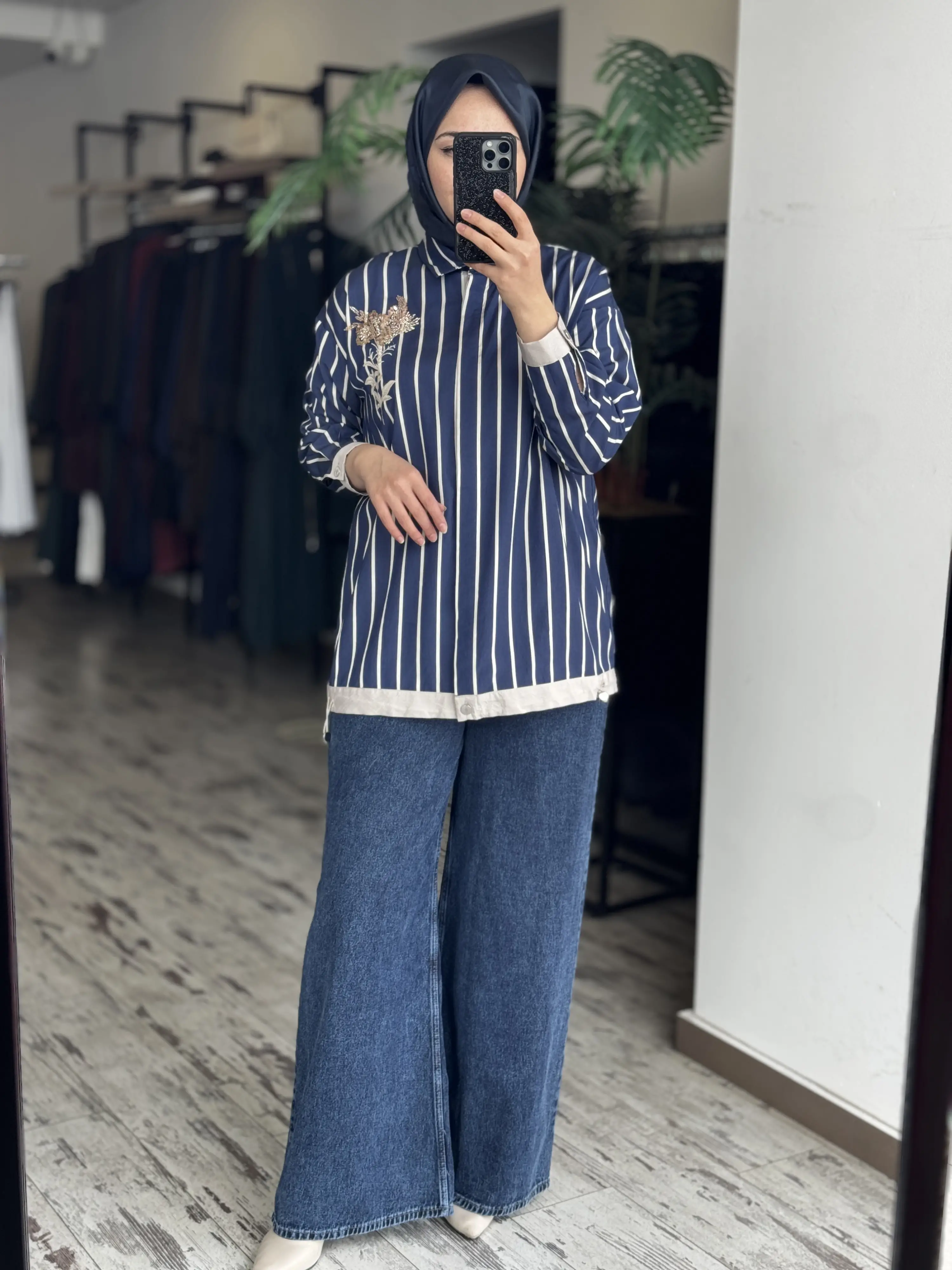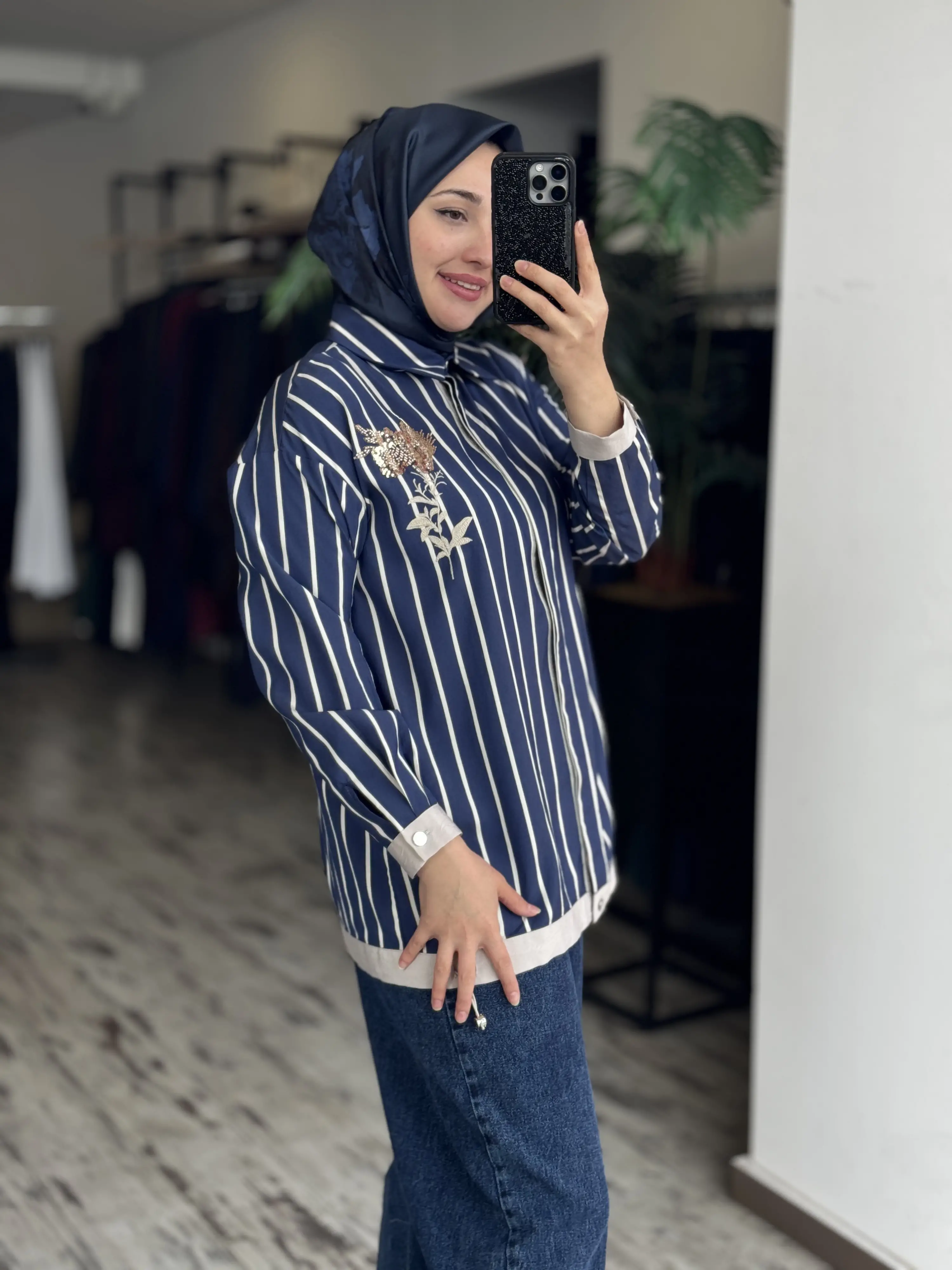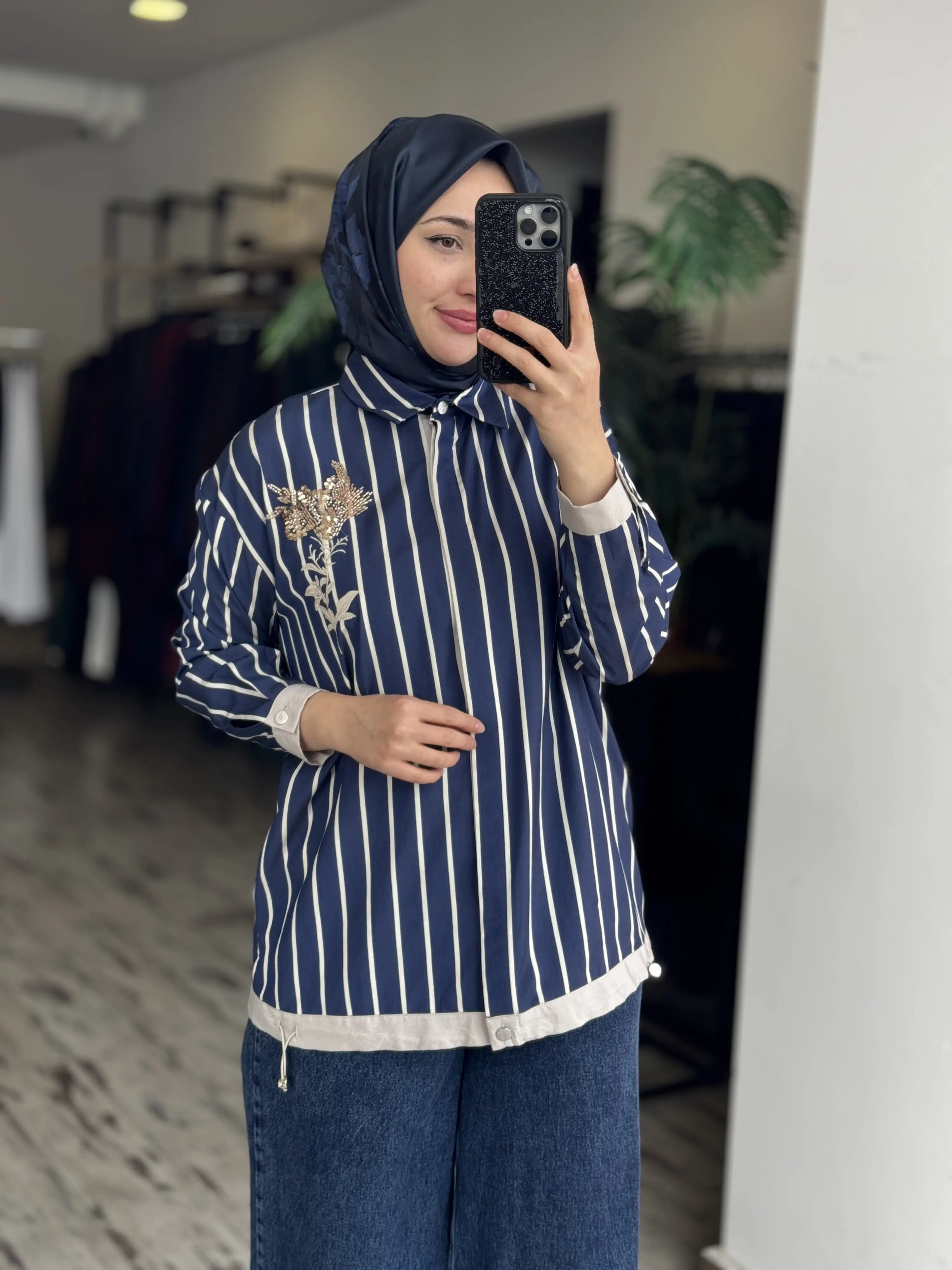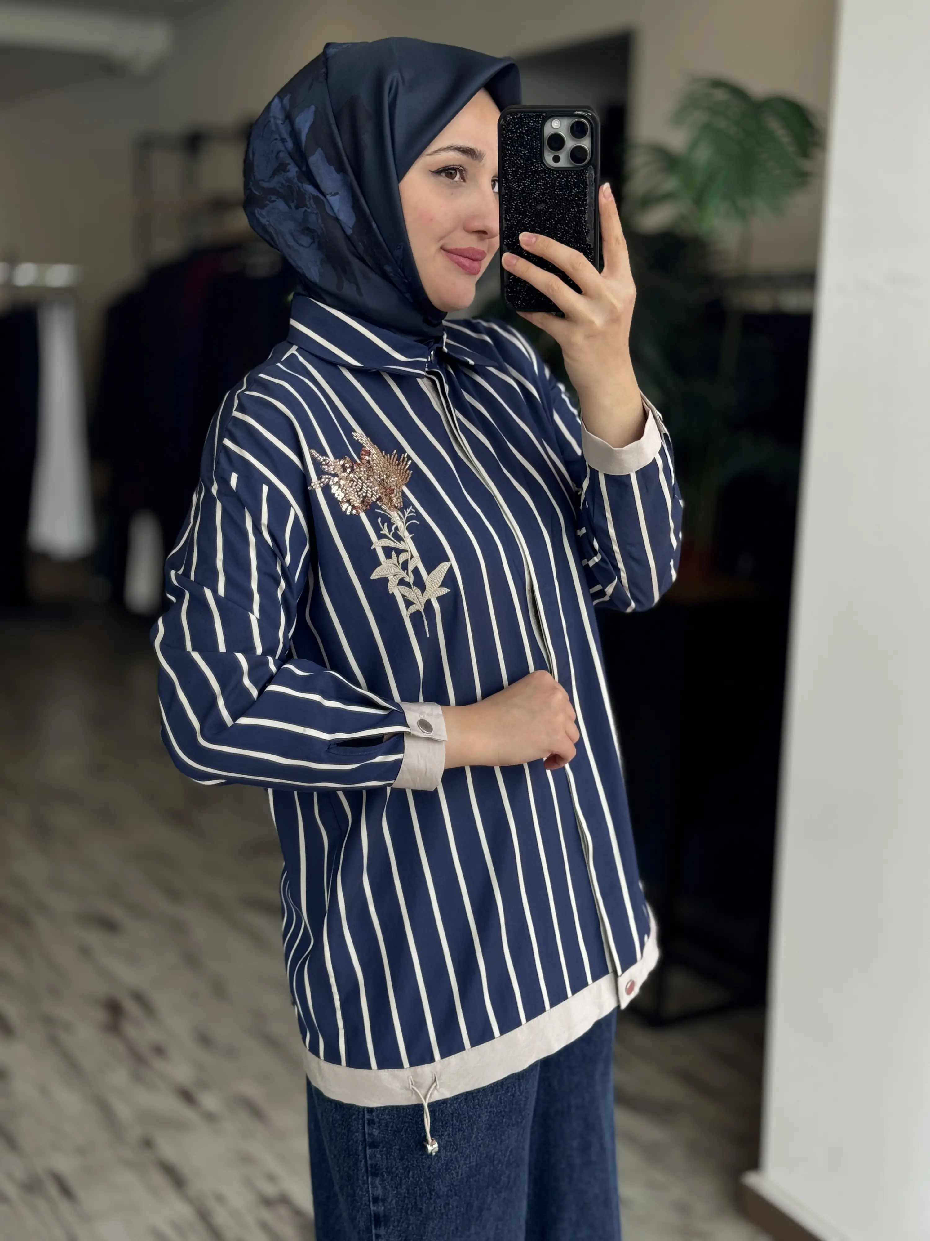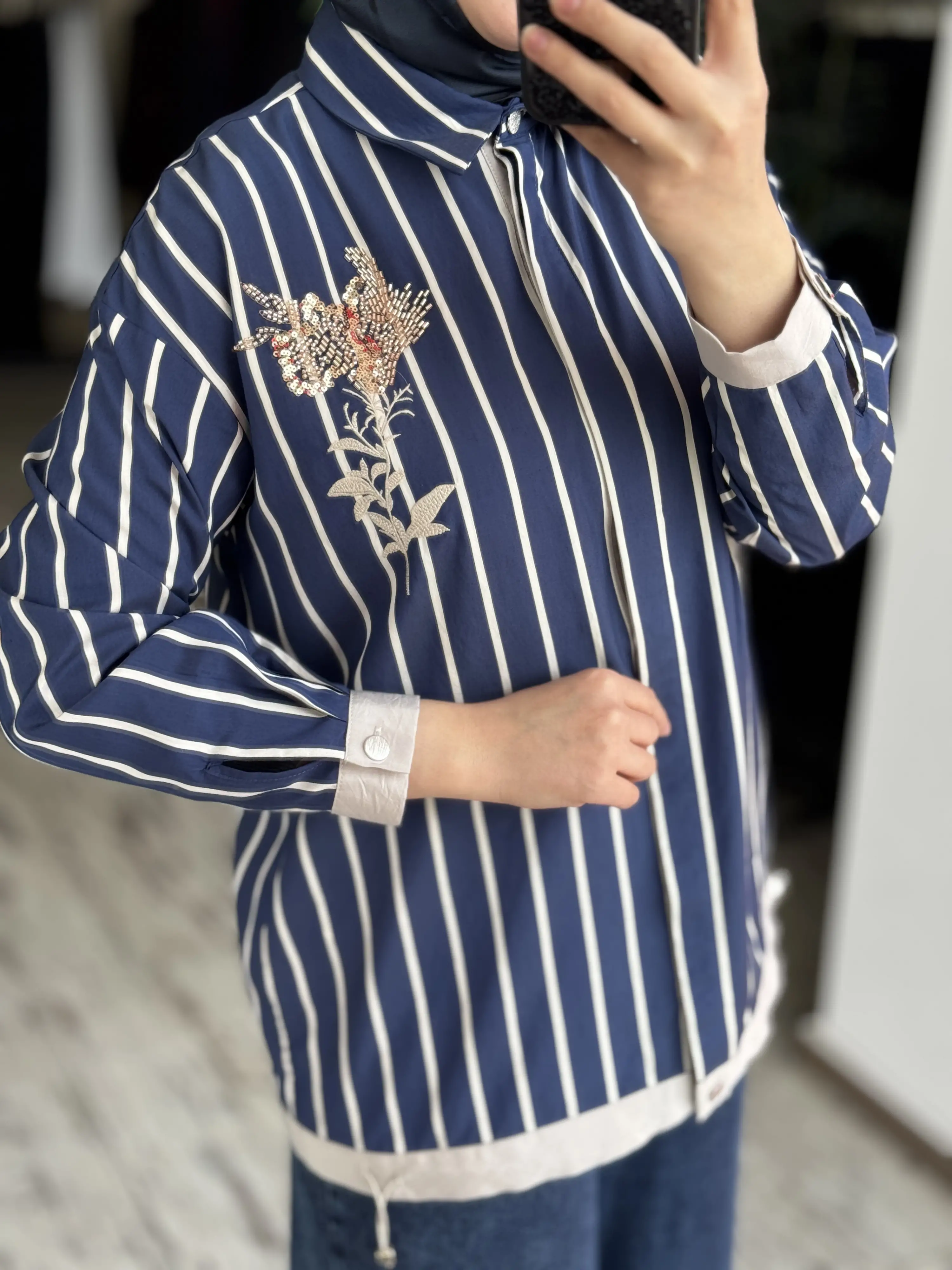 Tığ Triko Boncuklu Nakış Detaylı Çizgili Gömlek GML4018