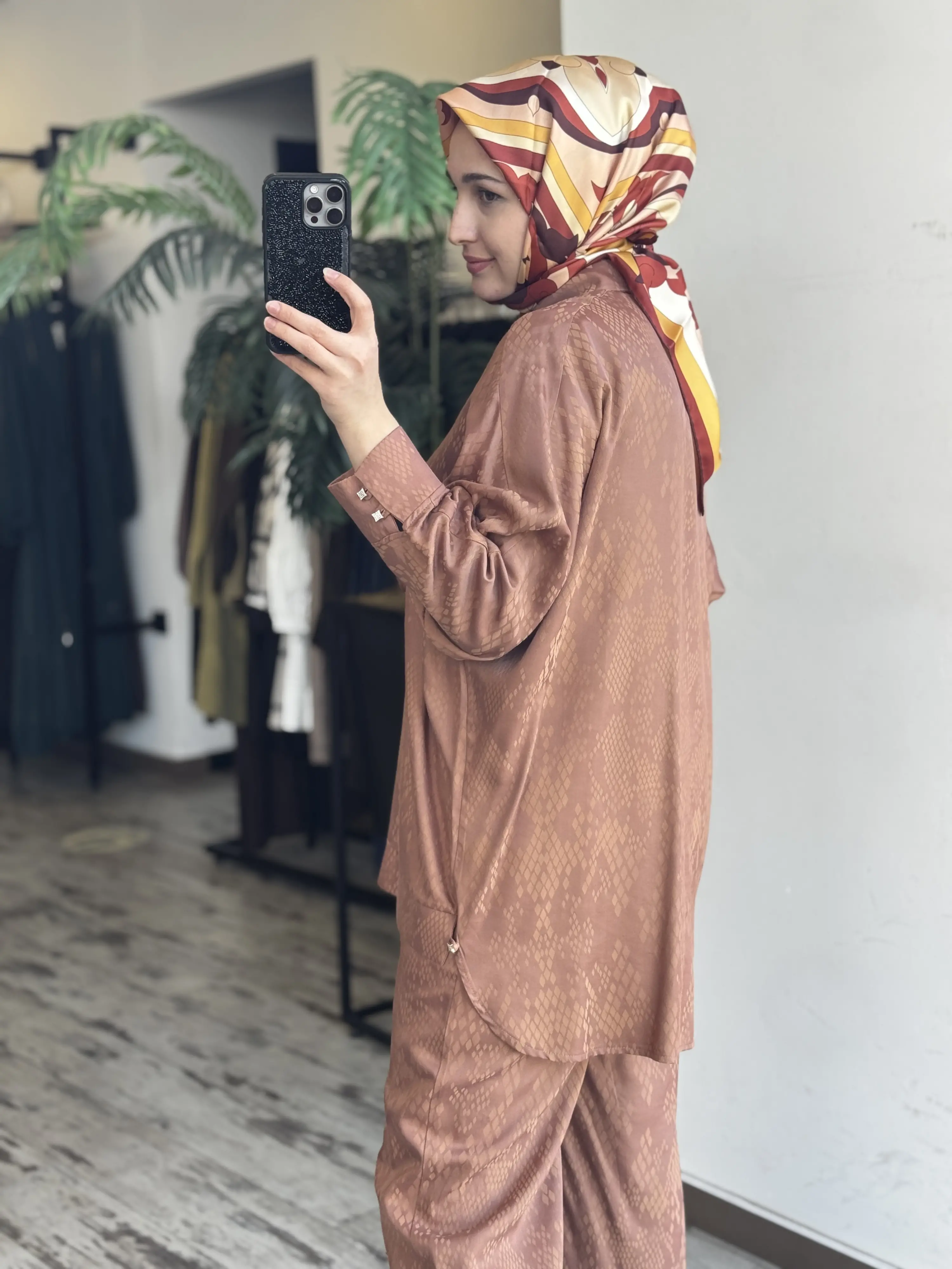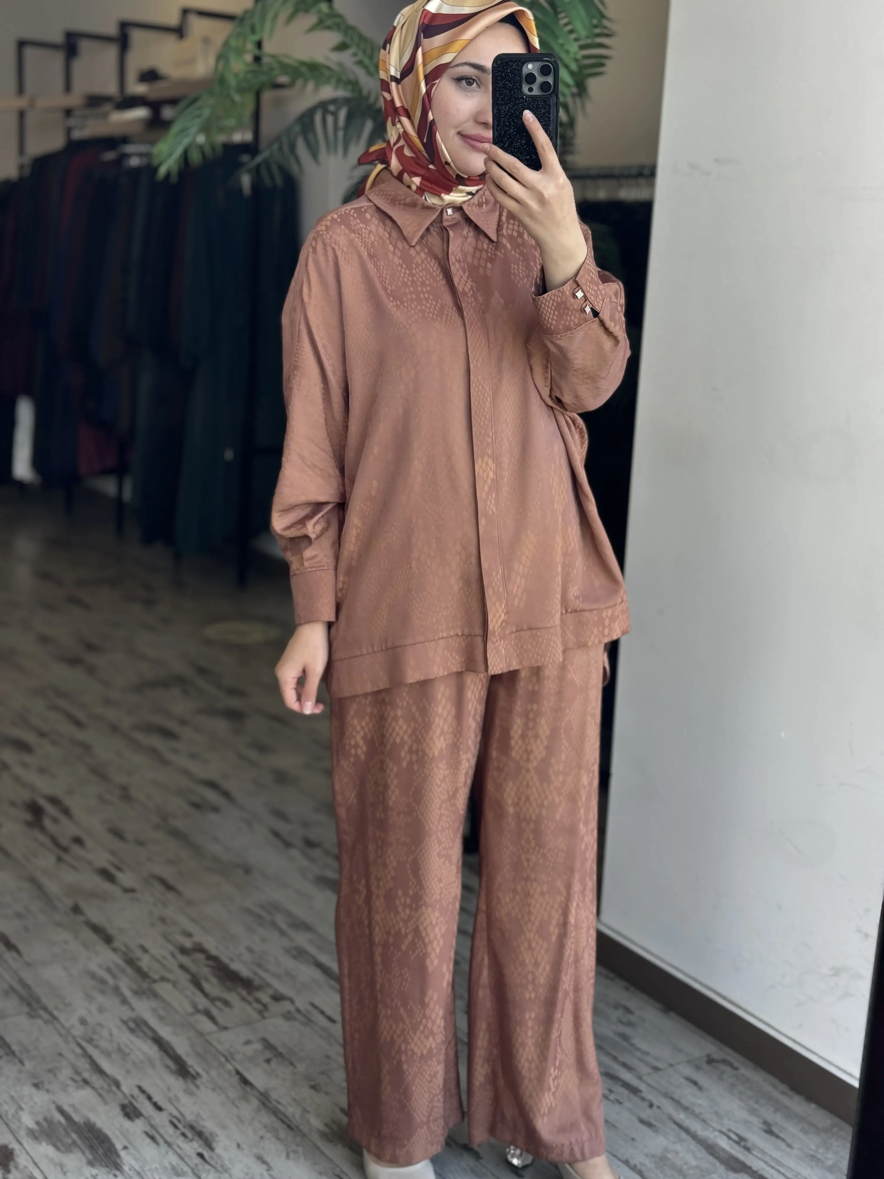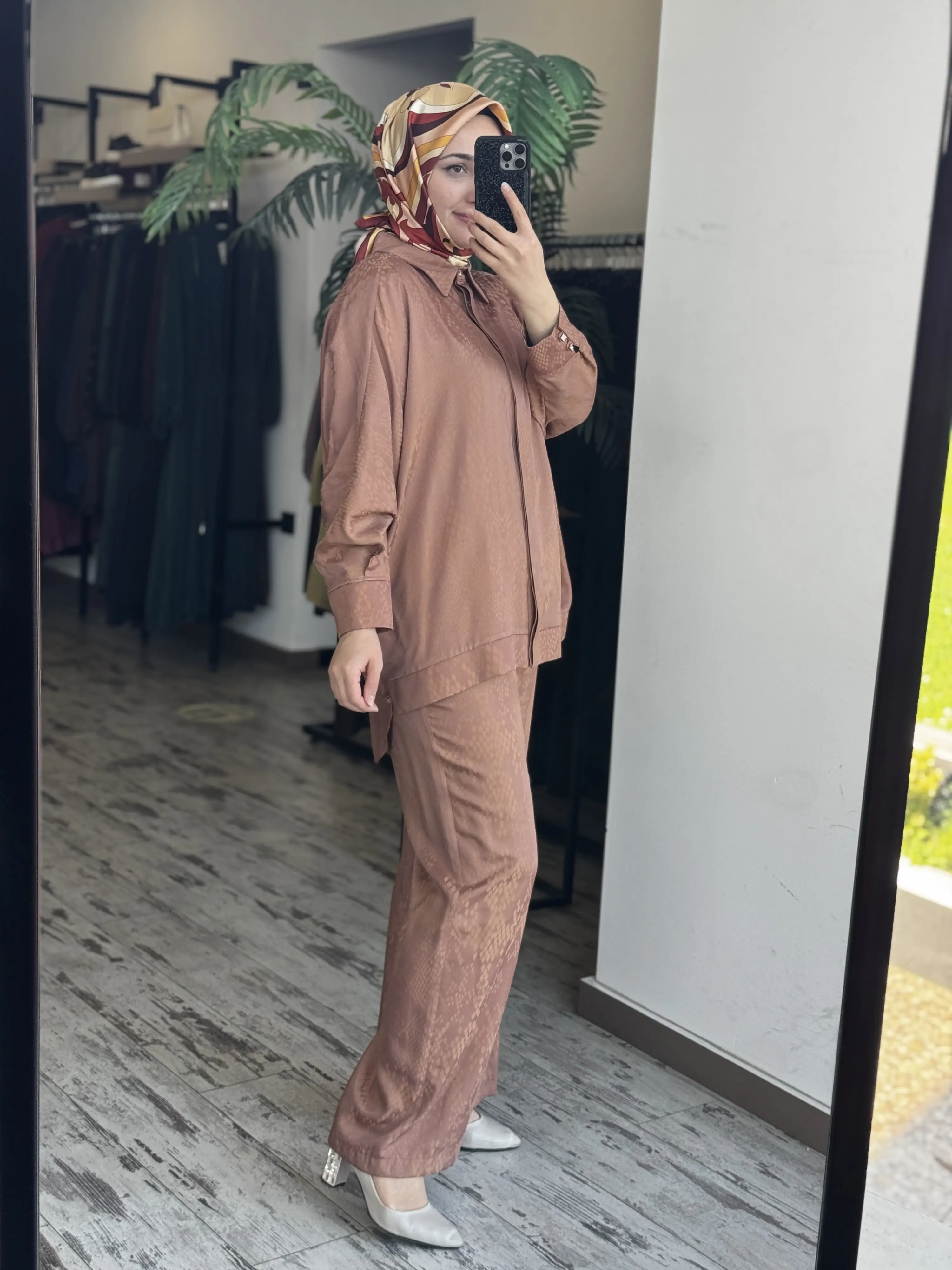 Tığ Triko Kendinden Desenli Yarasa Kol Gömlek Pantolon Takım TKM5021