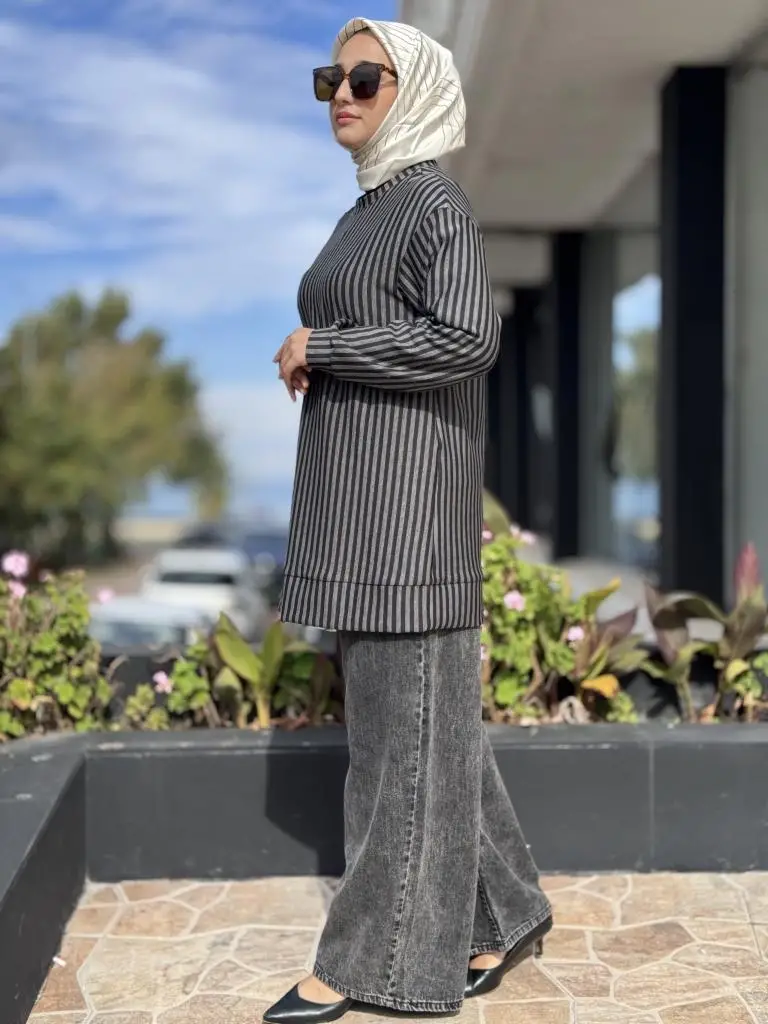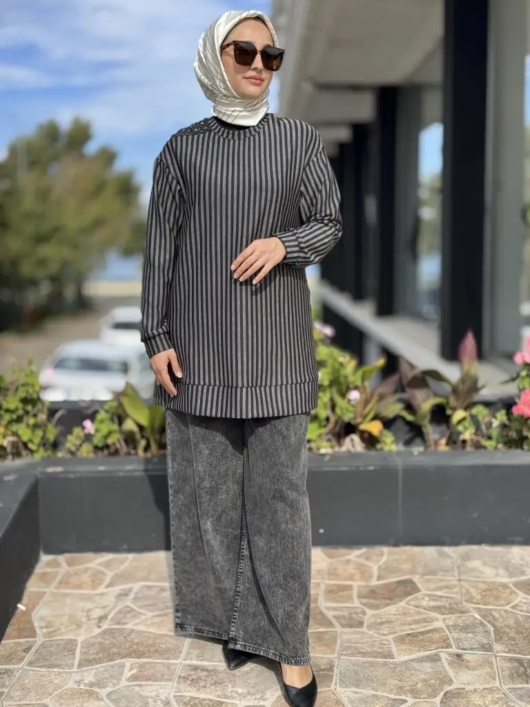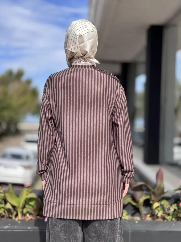 Almarwah Omuz Detaylı Çizgili Viscon Tunik 102235