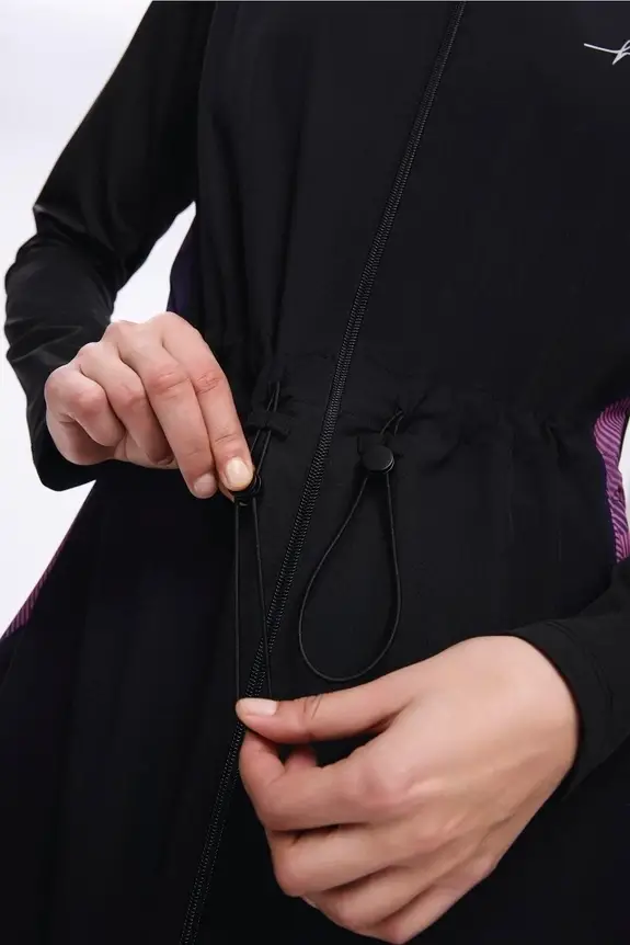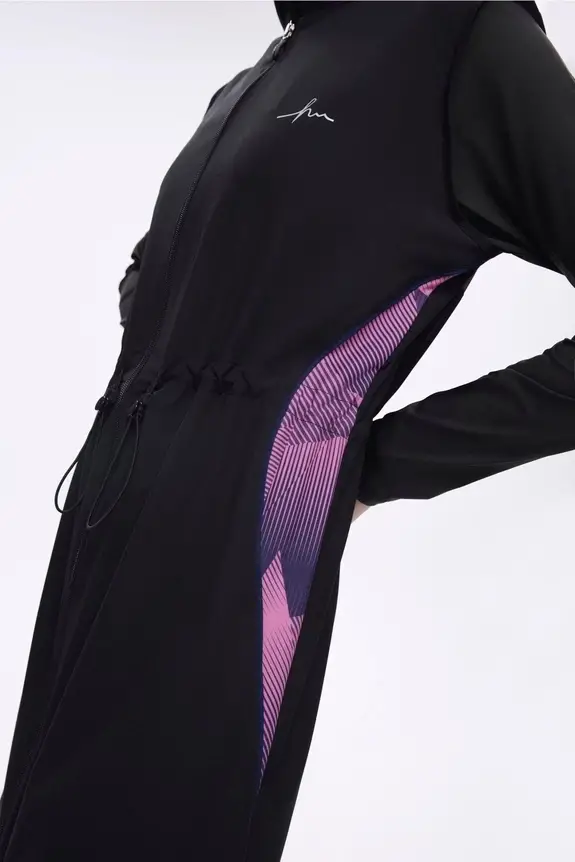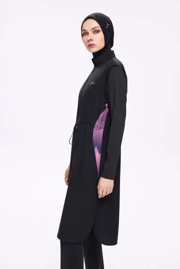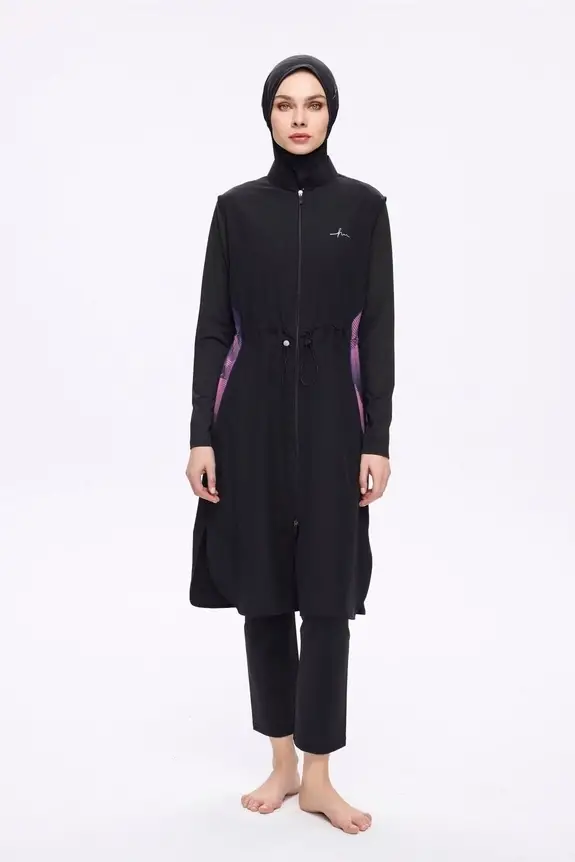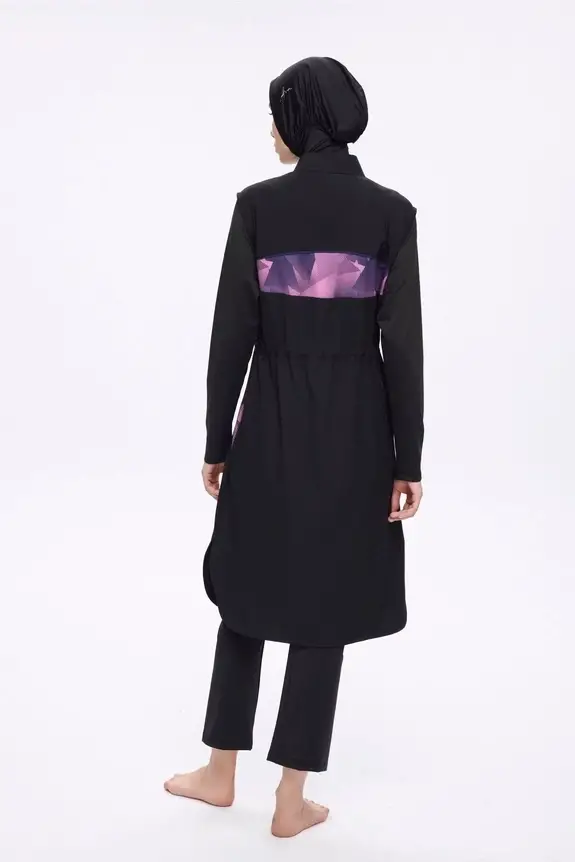 Haşema Kol Altı Ve Sırtı Desenli Siyah 5 Parça Tesettür Mayo Takımı HSM5022