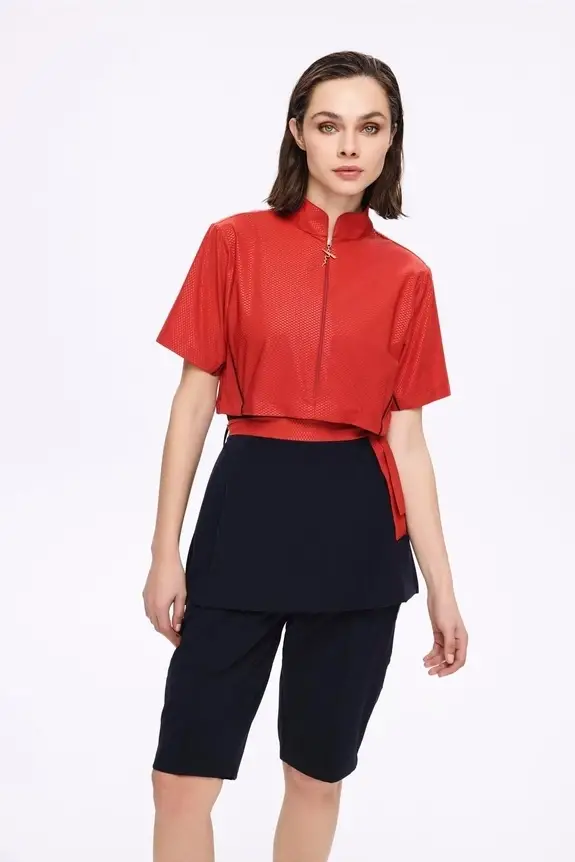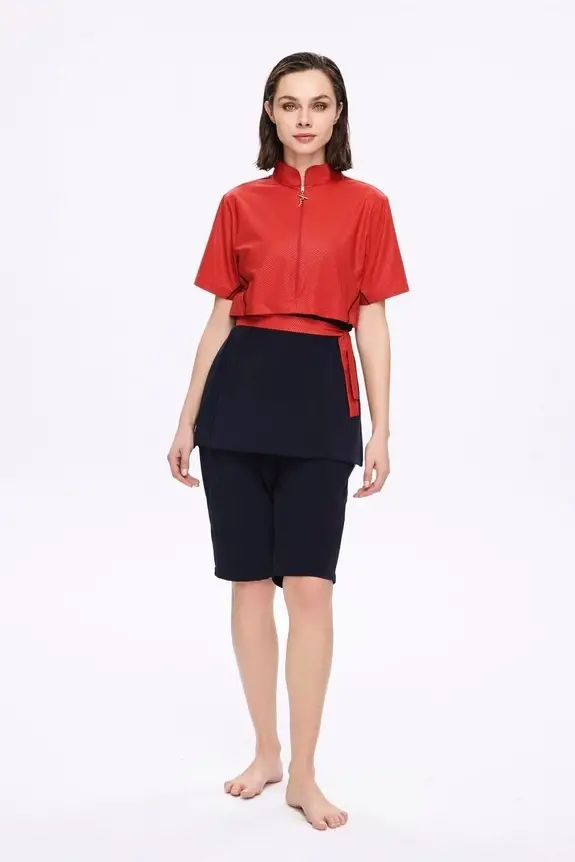 Üst ve şortu birbirine bağlayarak yüzerken eteğin yukarı kalkmasını önleyen bağ detayı bulunur.