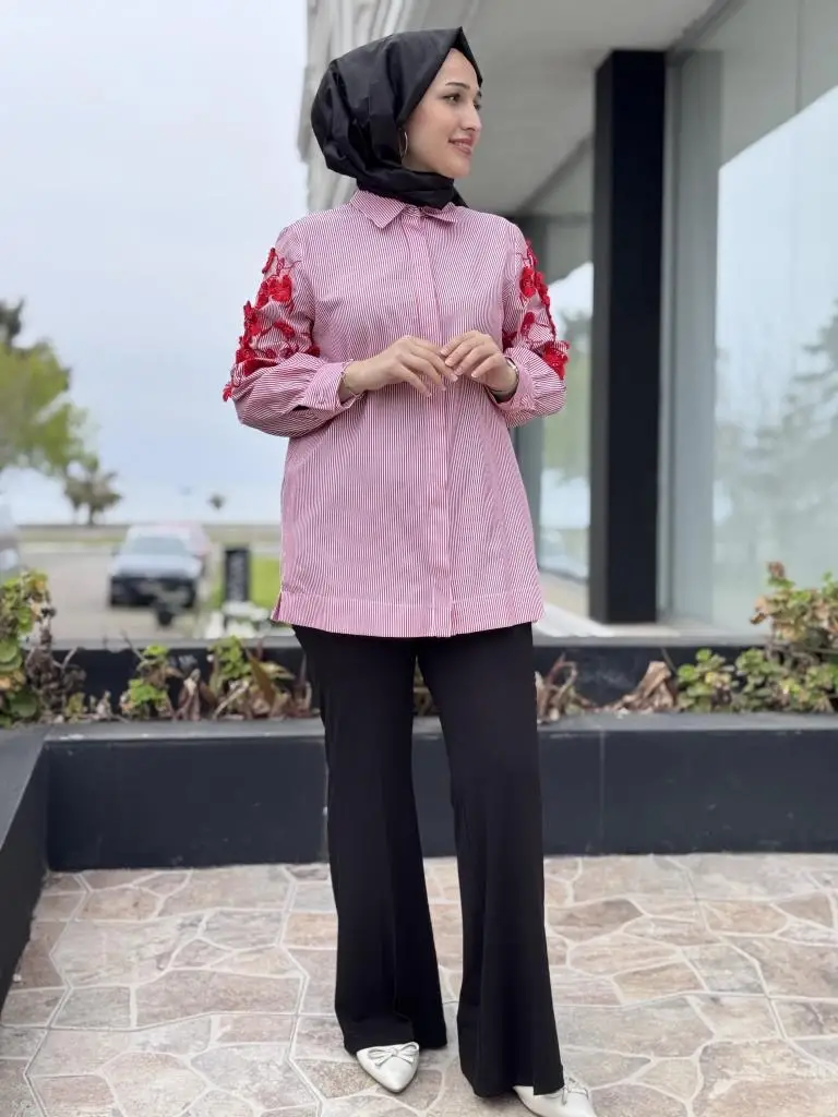 Qupra Kolları Nakışlı Çizgili Poplin Gömlek WAB84009