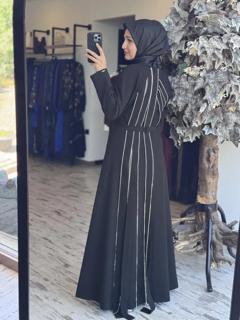 ÜRÜN GÖĞÜS VE SIRT KISMINDA PARÇA KUMAŞLI TAŞLI ŞERİTLER MEVCUTTUR