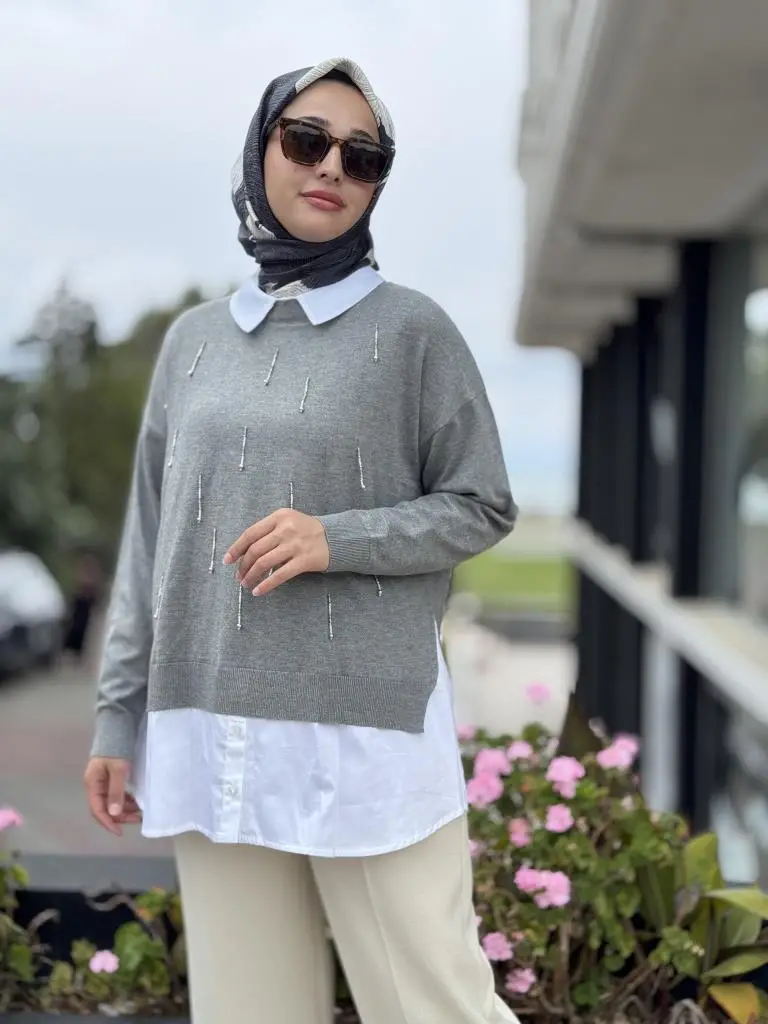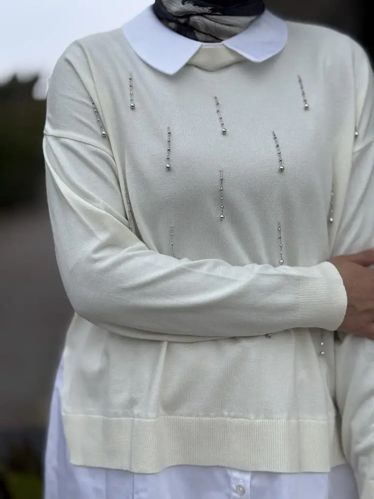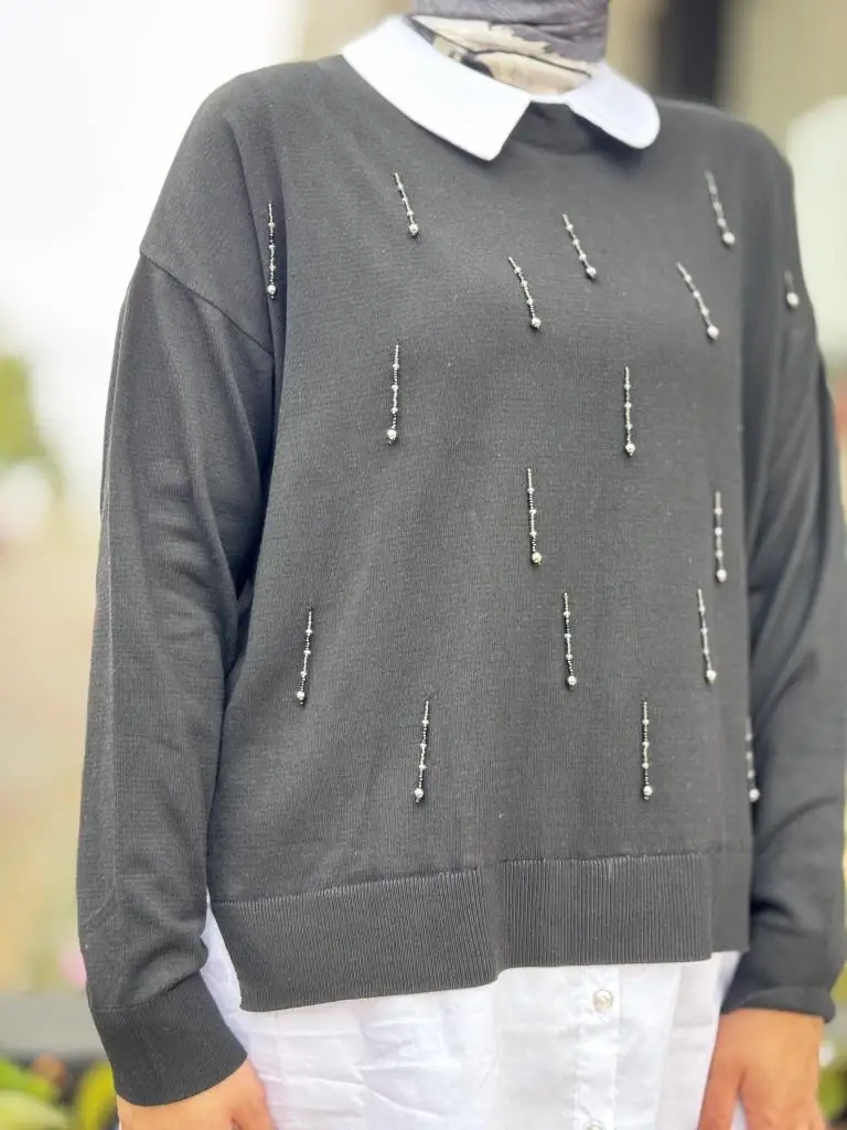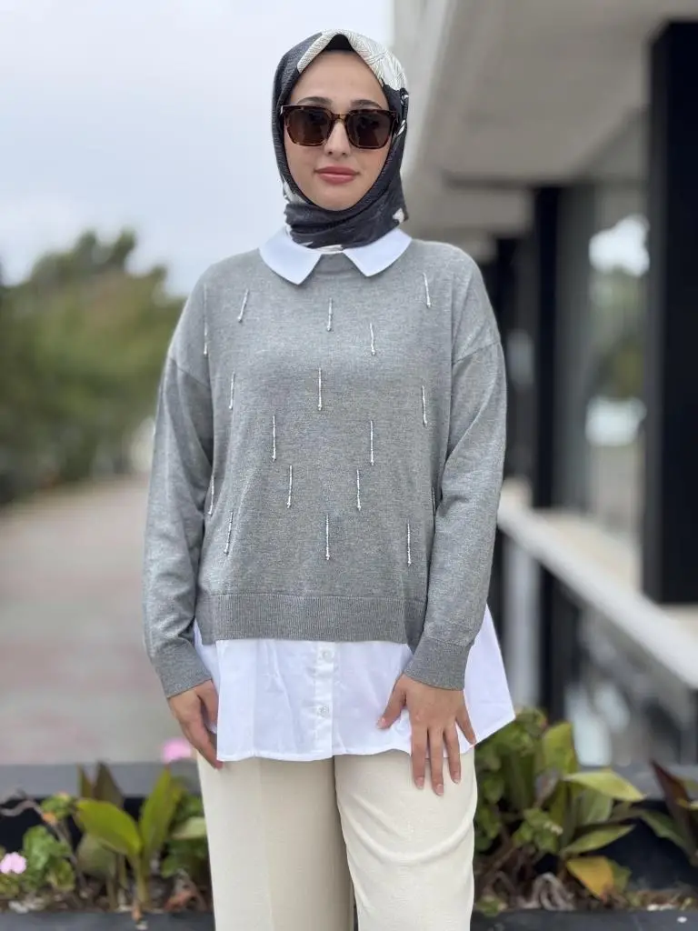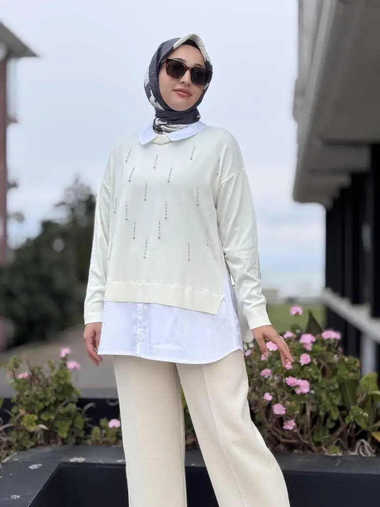 Tığ Triko Boncuk İşlemeli Gömlek Detaylı Tunik TNK21704