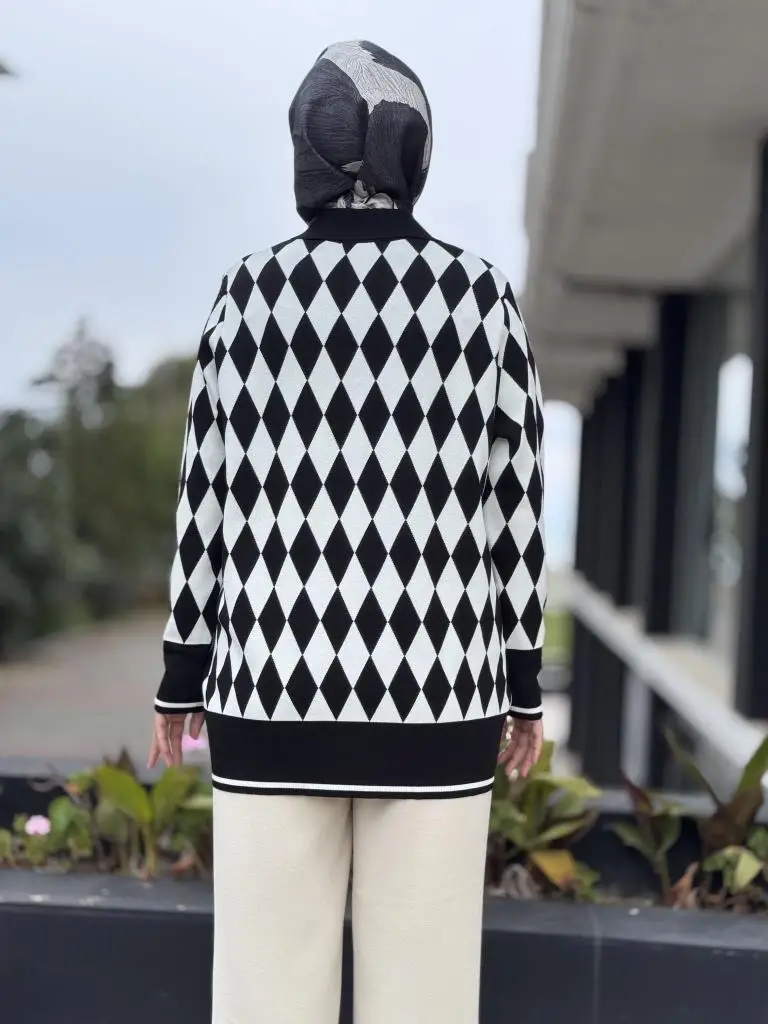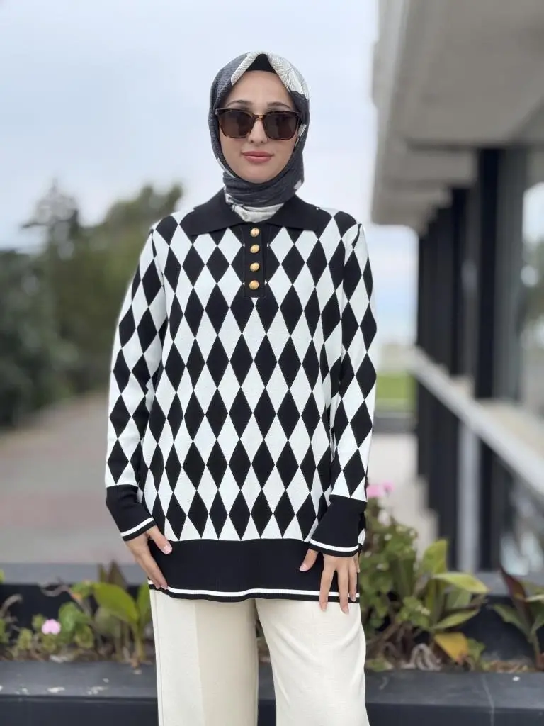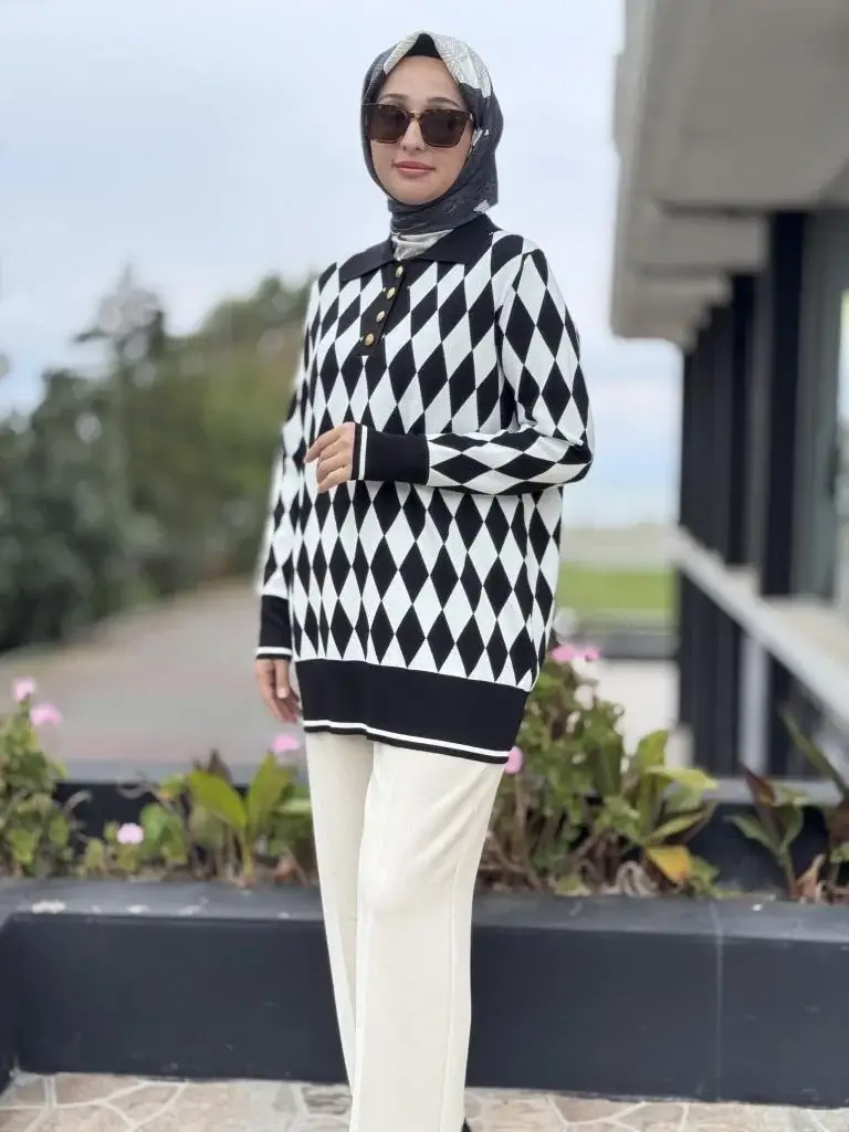 Tığ Triko Polo Yaka Baklava Desenli Tunik TNK21849