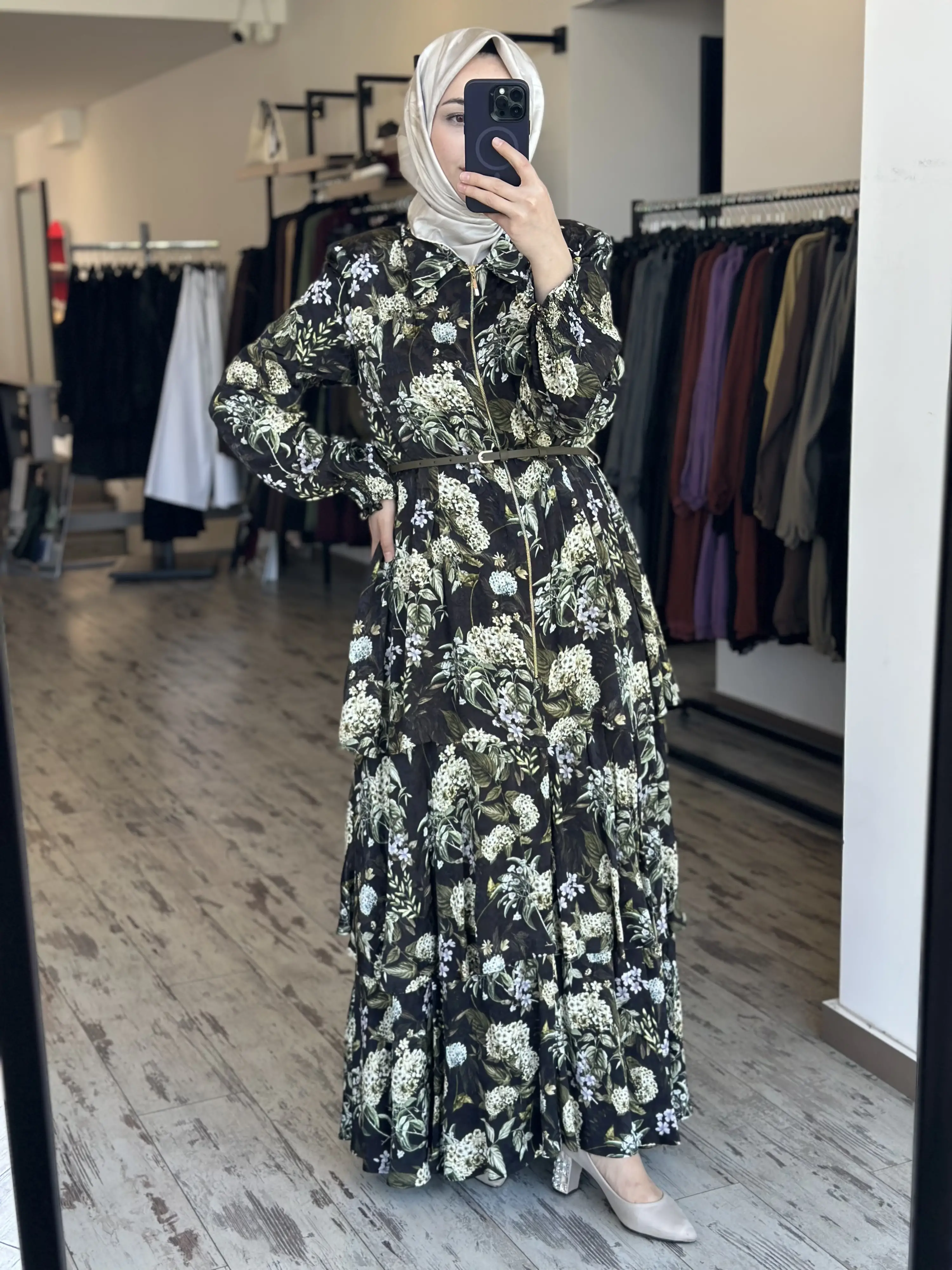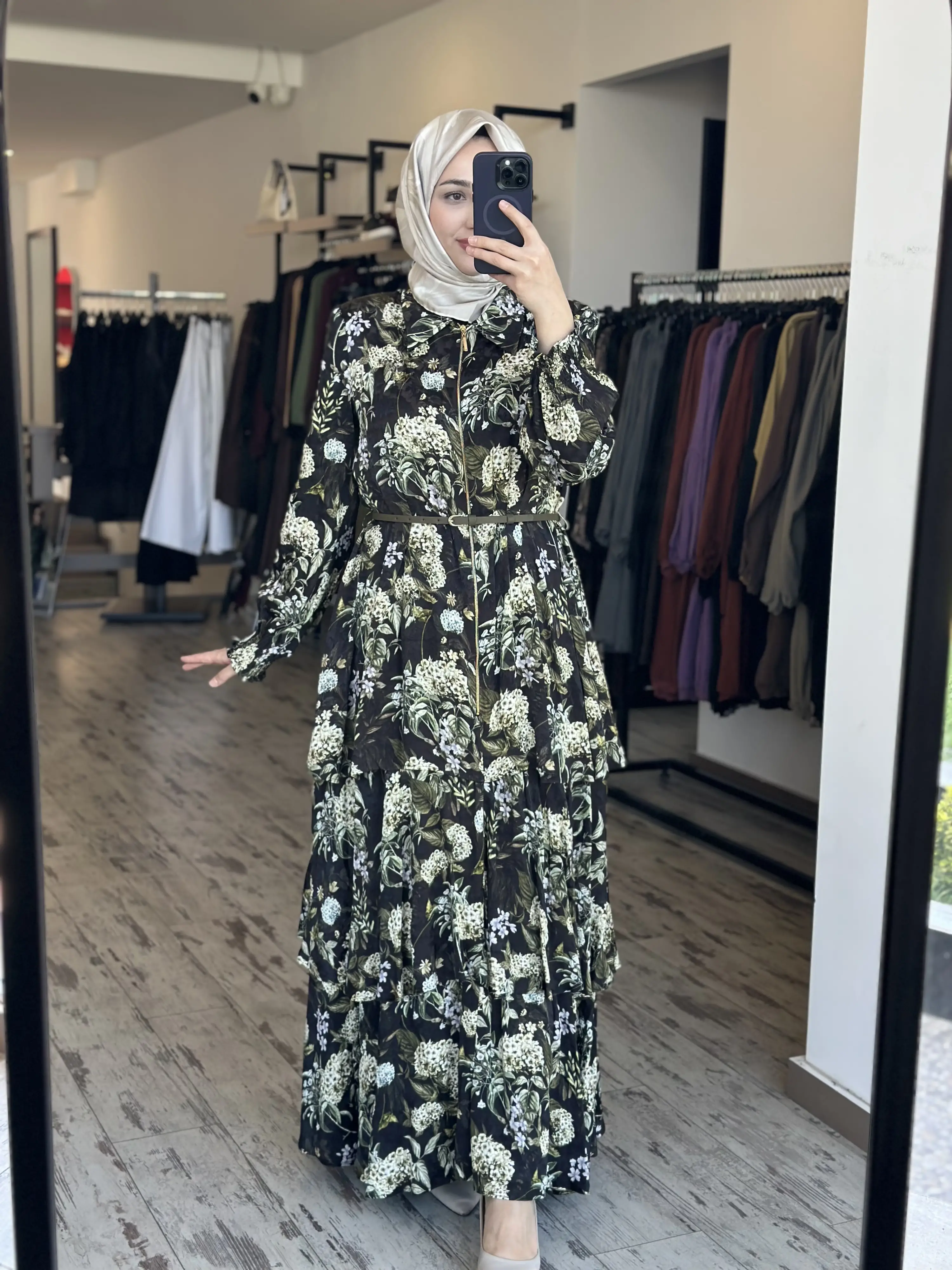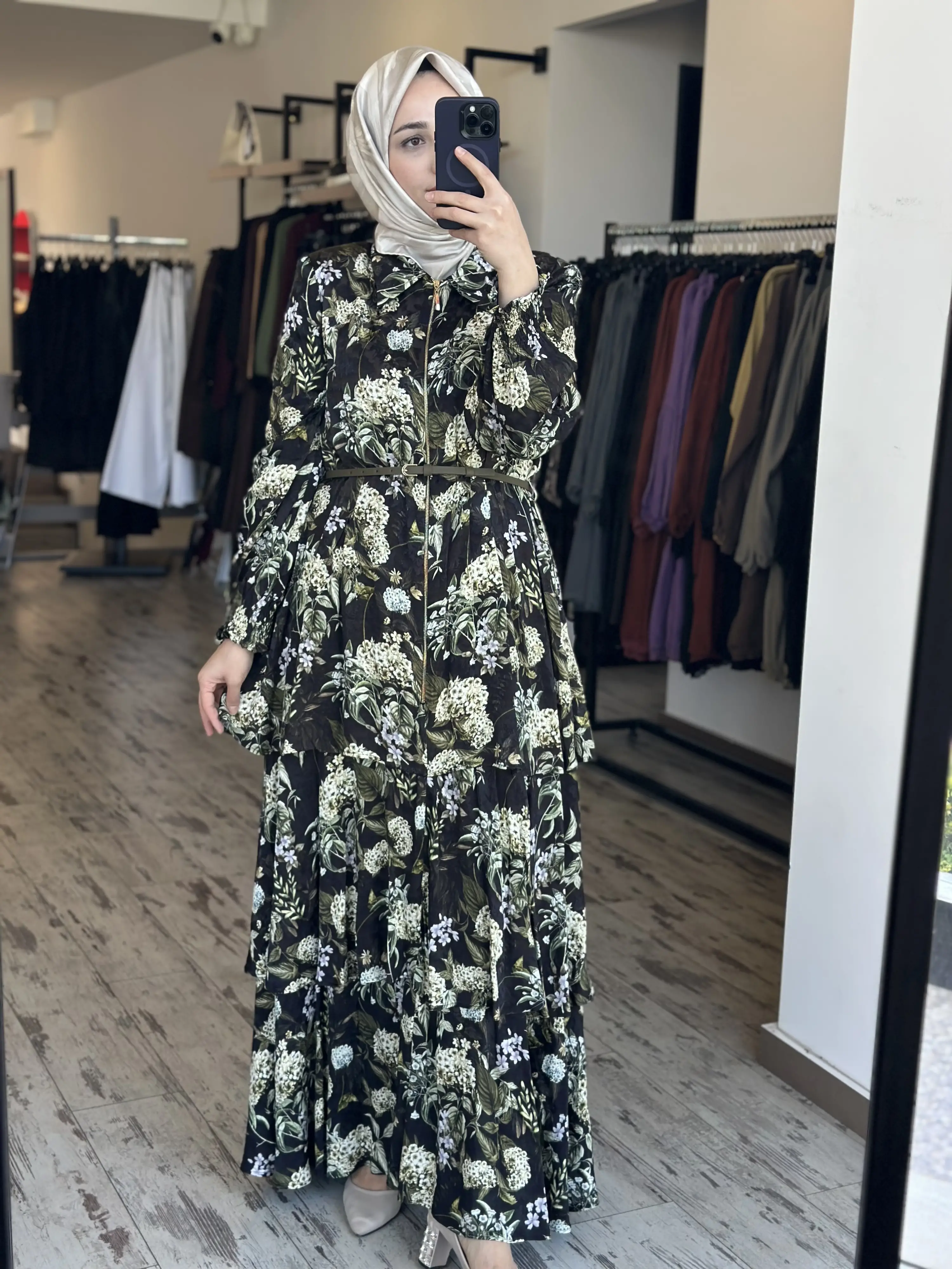 ÜRÜN DRAPE DESENLİ KATLI ÖNDEN FERMUARLI ELBİSEDİR