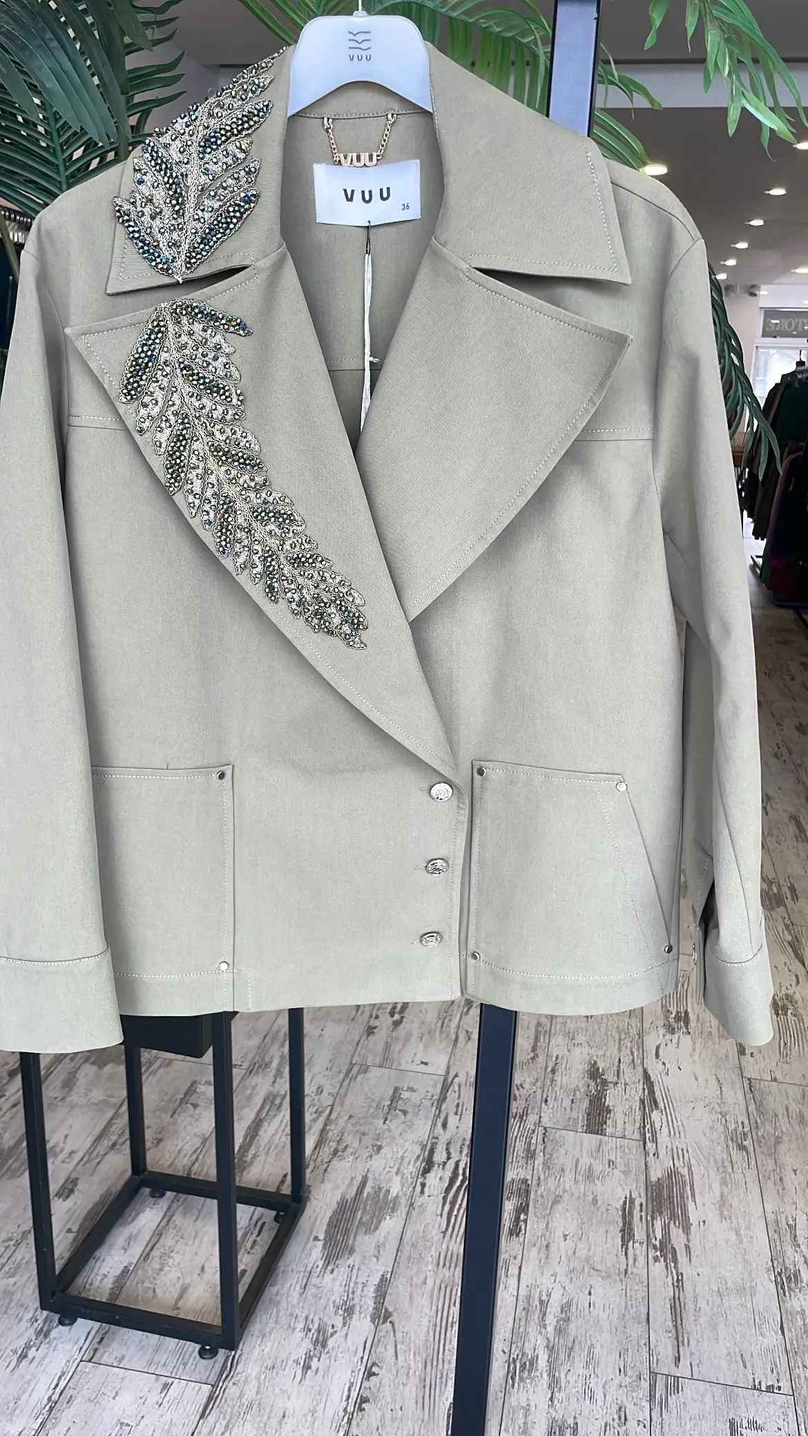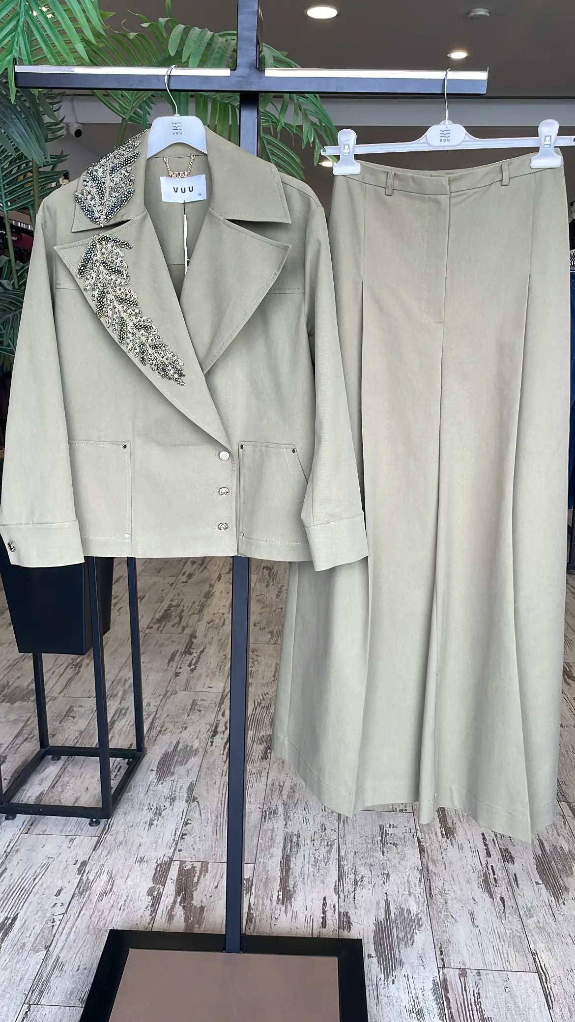 Vuu Yakası Taş Detaylı Kruvaze Ceket Pileli Pantolon Takım