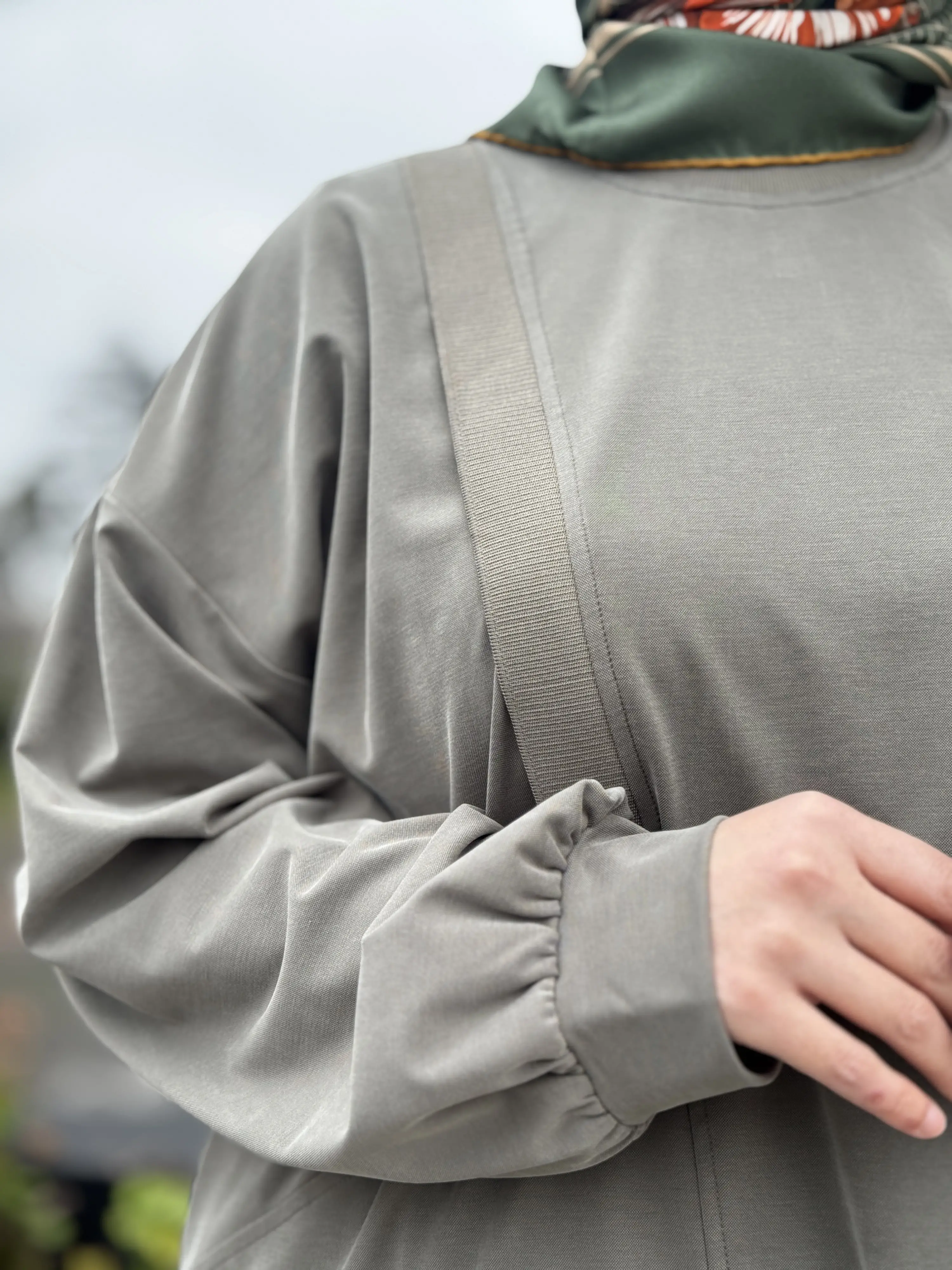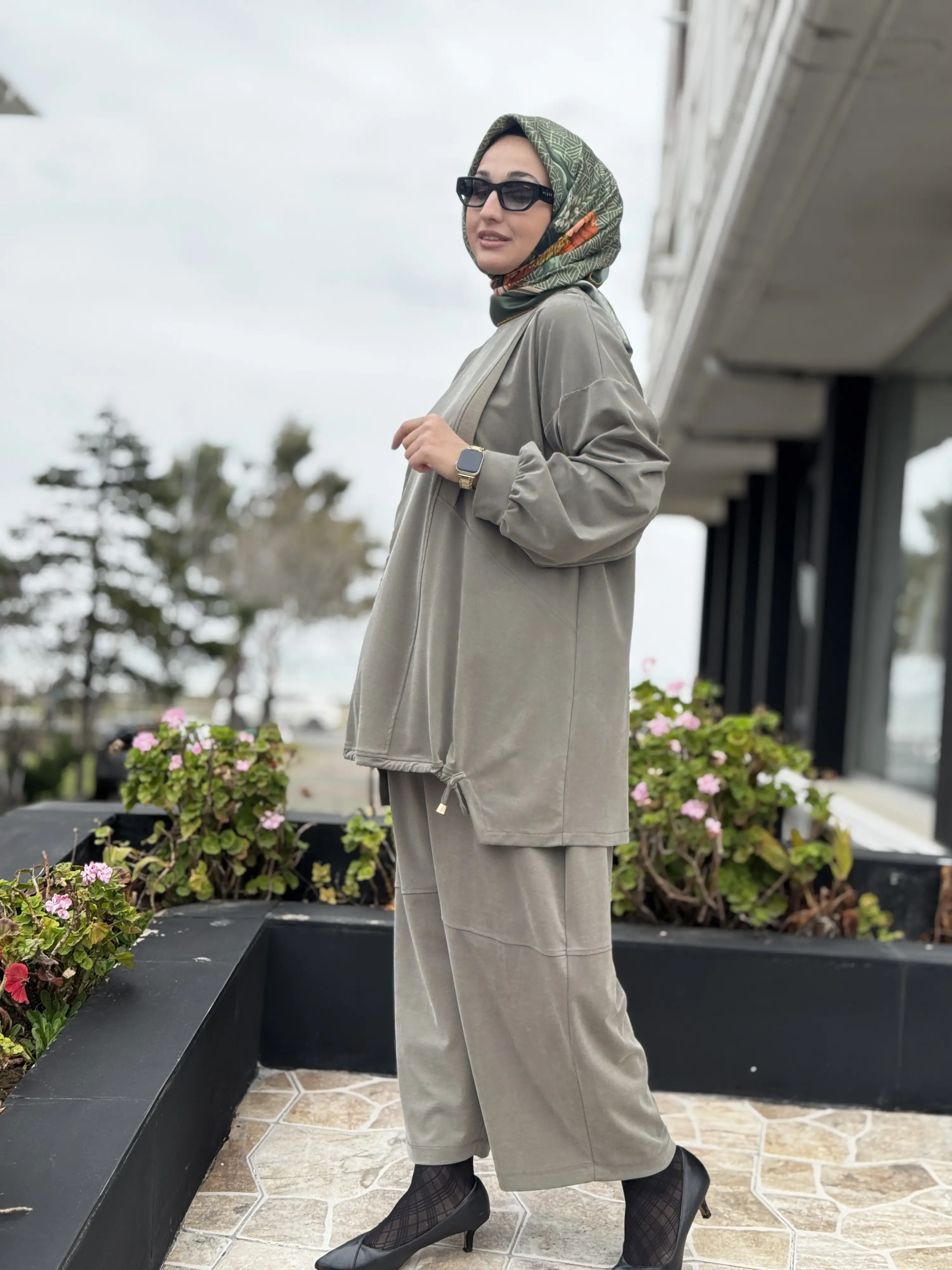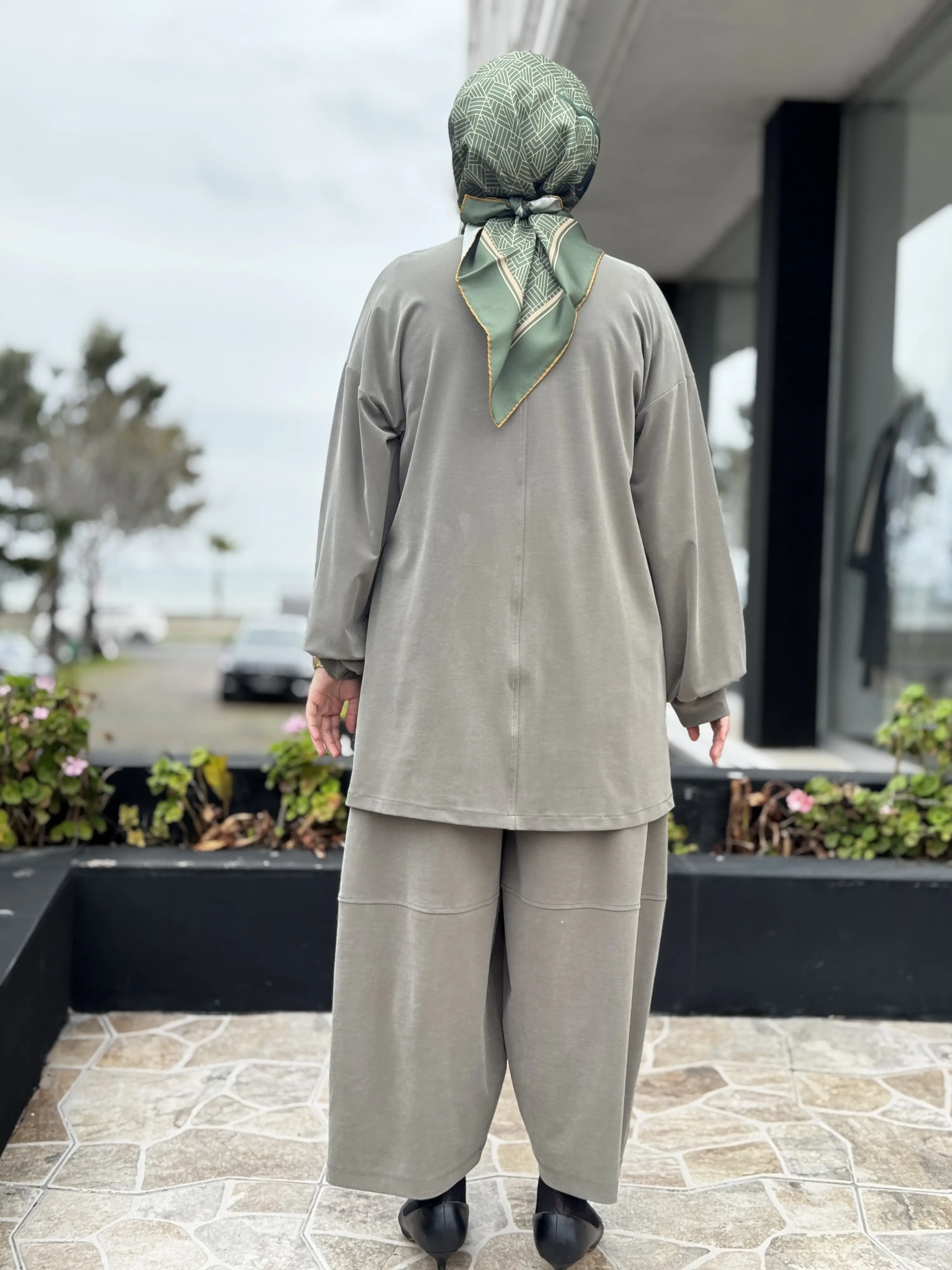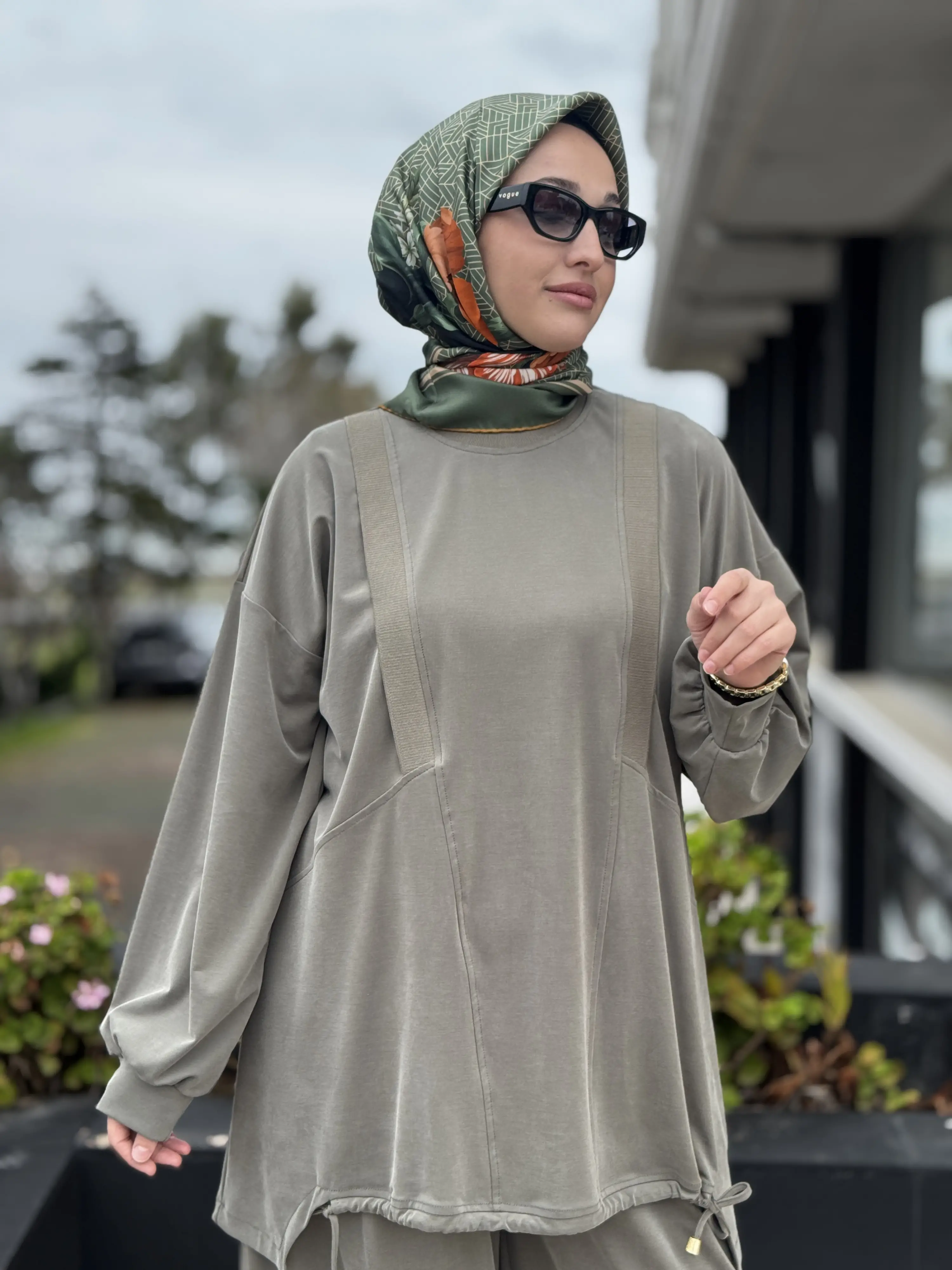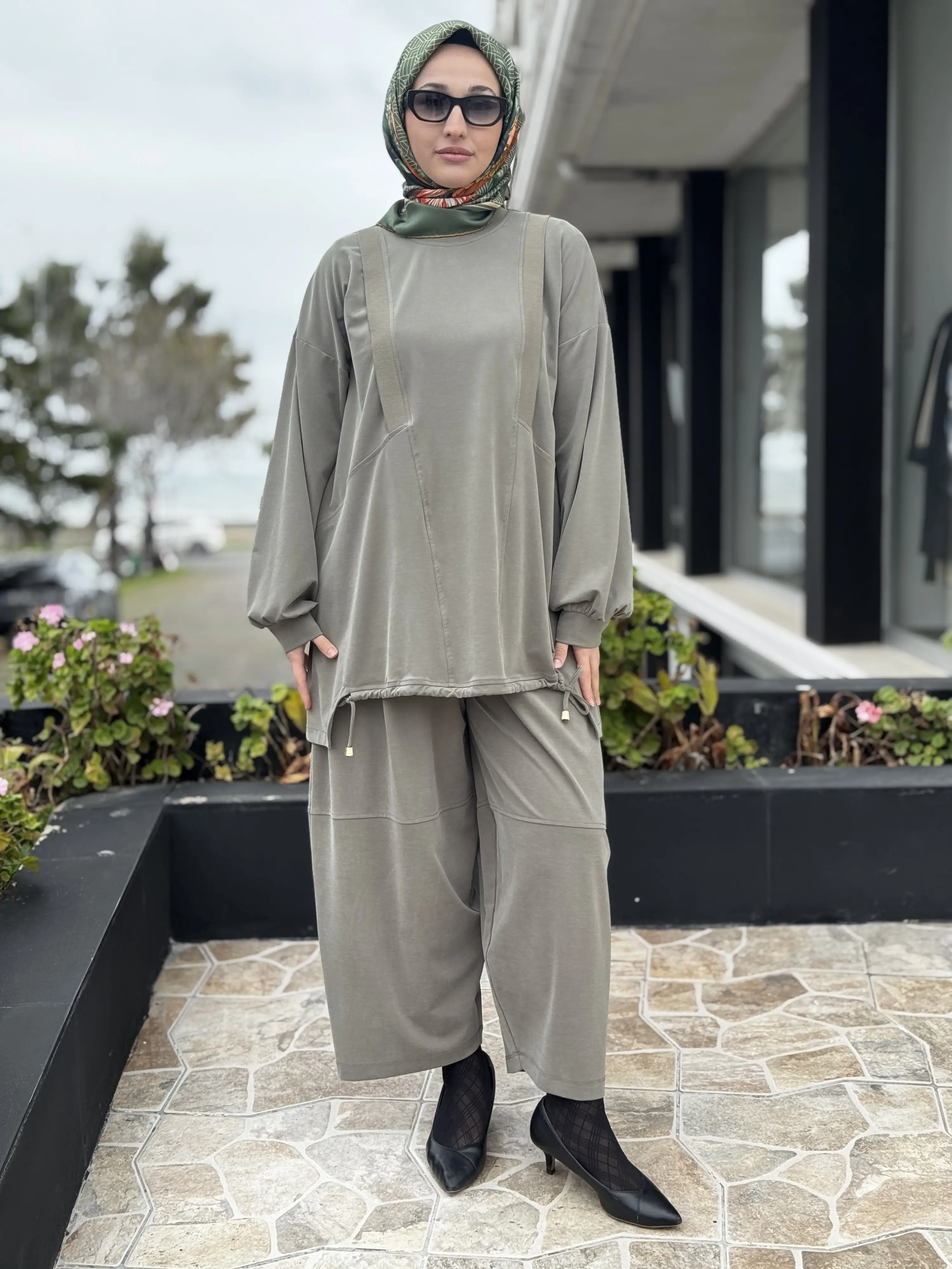 YEŞİL G4205 Ribana ve Büzgü Detaylı Tunik Şalvar Pantolon Takım